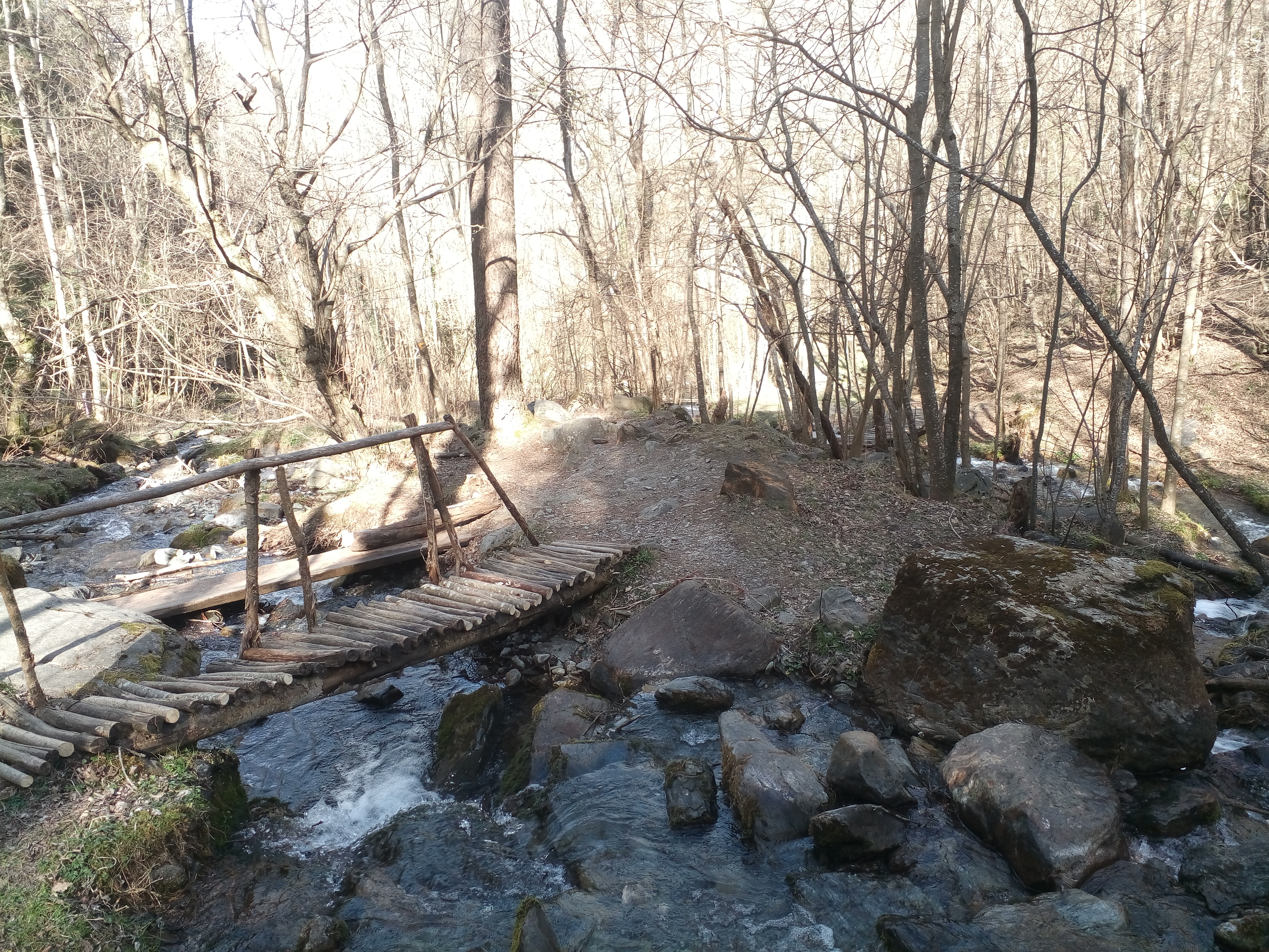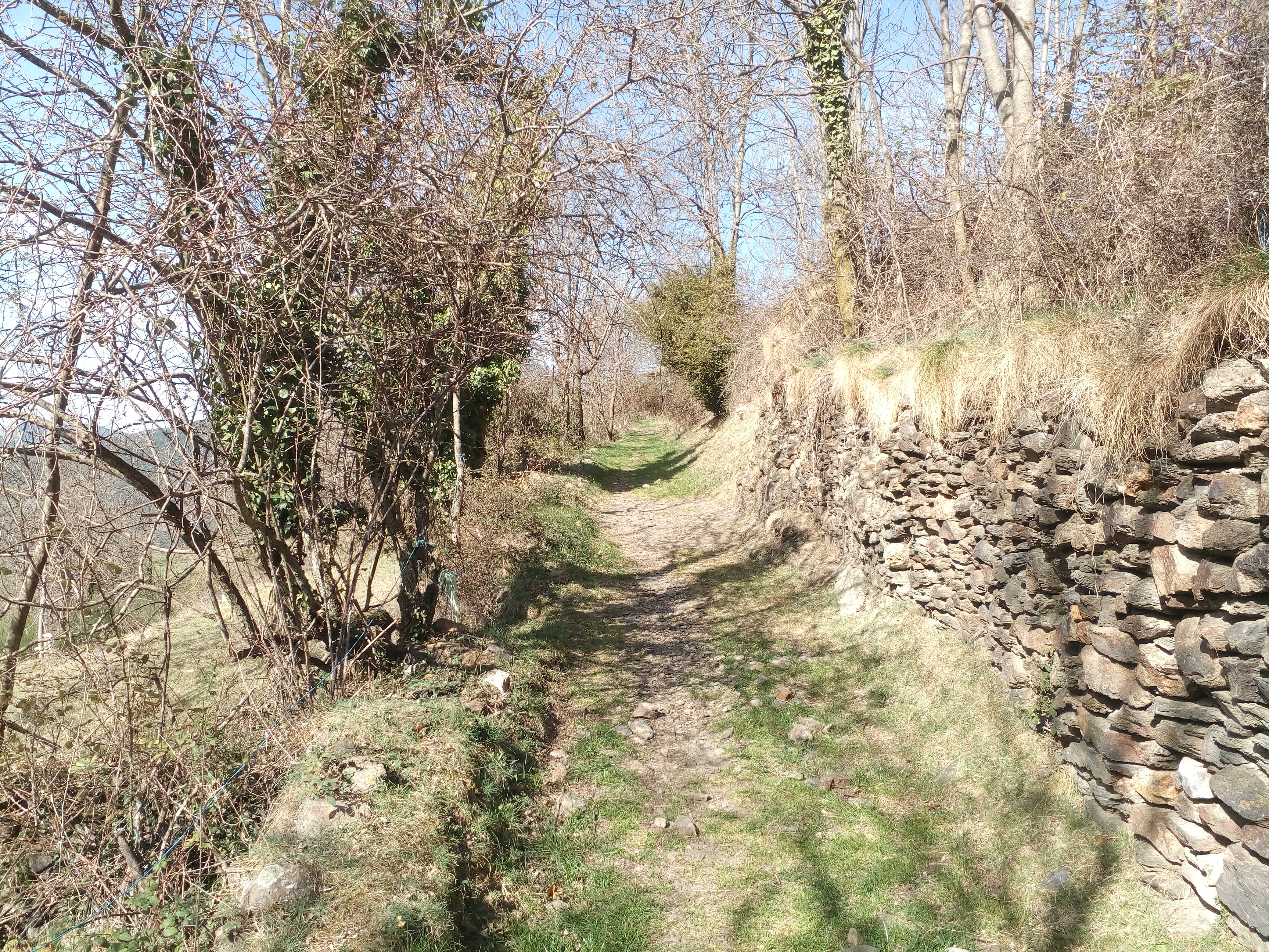 Superado el curso de agua, el sendero escala decidido hacia el pequeño núcleo de Serrat. Se supera otro torrente. Aquí por fin, entre muros de piedra, me empieza a dar el Sol. La parte inicial de paseo, al transcurrir por una vertiente Oeste, había transcurrido en sombra.