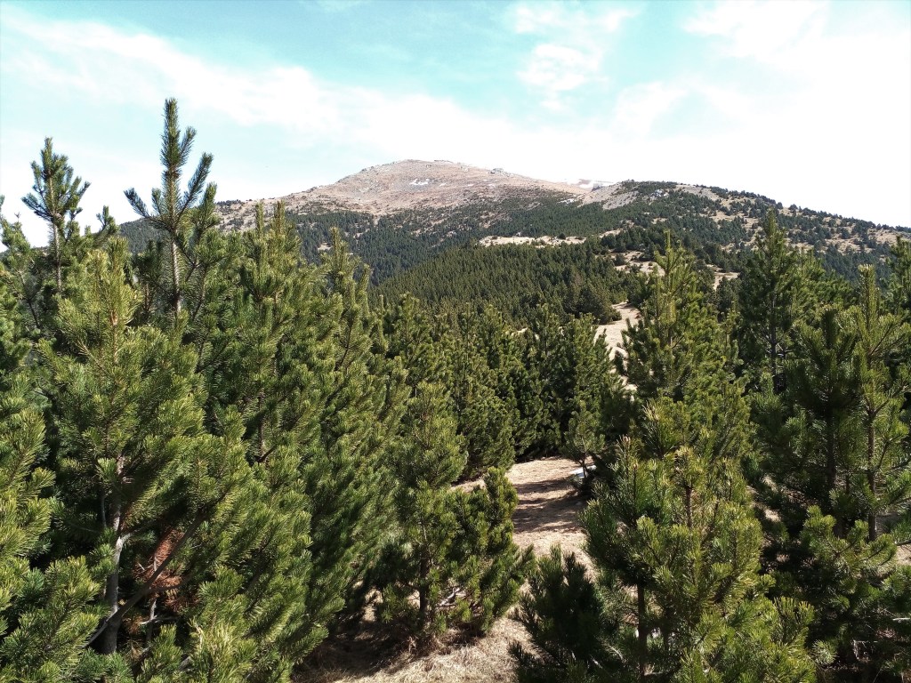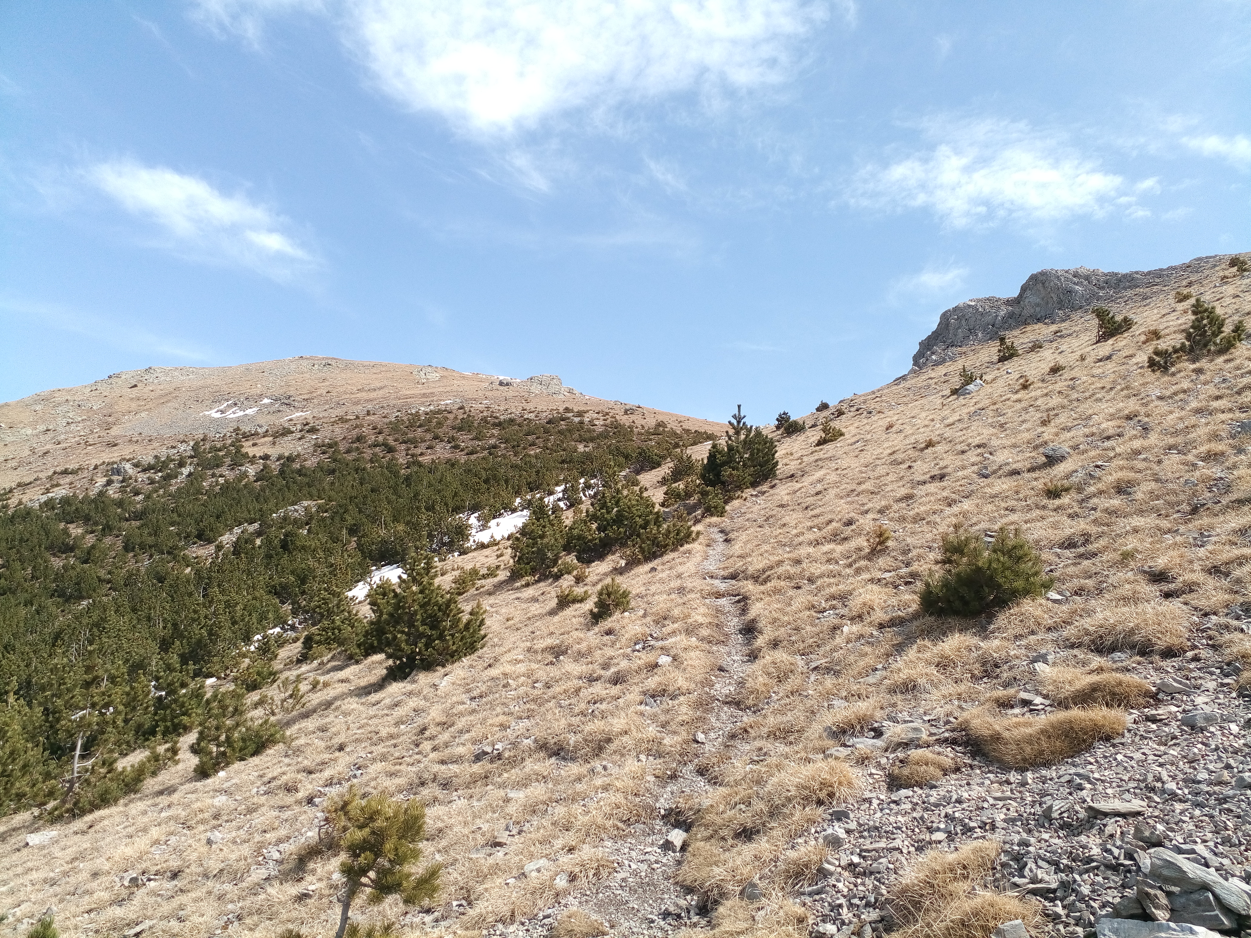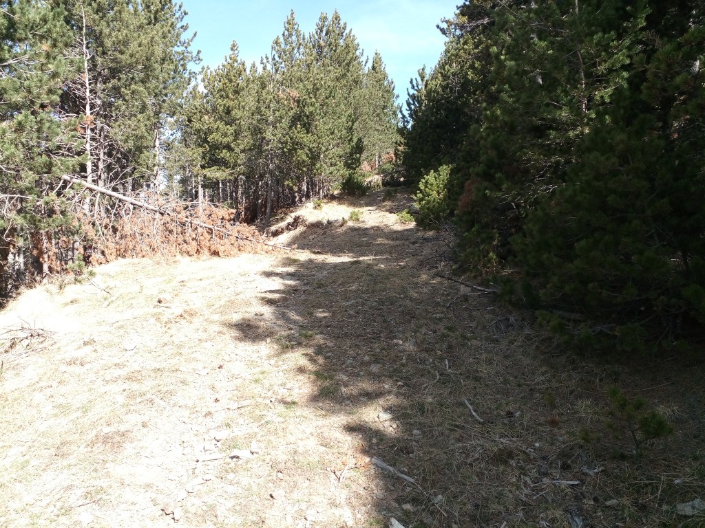 El sendero tiende a perderse, y voy con cuidado de no desviarme demasiado a la derecha. Hay un momento en que pierdo los hitos, o quizá simplemente ya no los hay… Los pinos de montaña se achaparran cada vez más, dificultando la progresión. En un cierto punto me encuentro en mitad de una espesura de árboles enanos, con las ramas que se traban entre las piernas y que amenazan con sacarme un ojo. Resoplando, consigo escapar del infierno verde y dar con un buen sendero que sube por terreno más despejado.