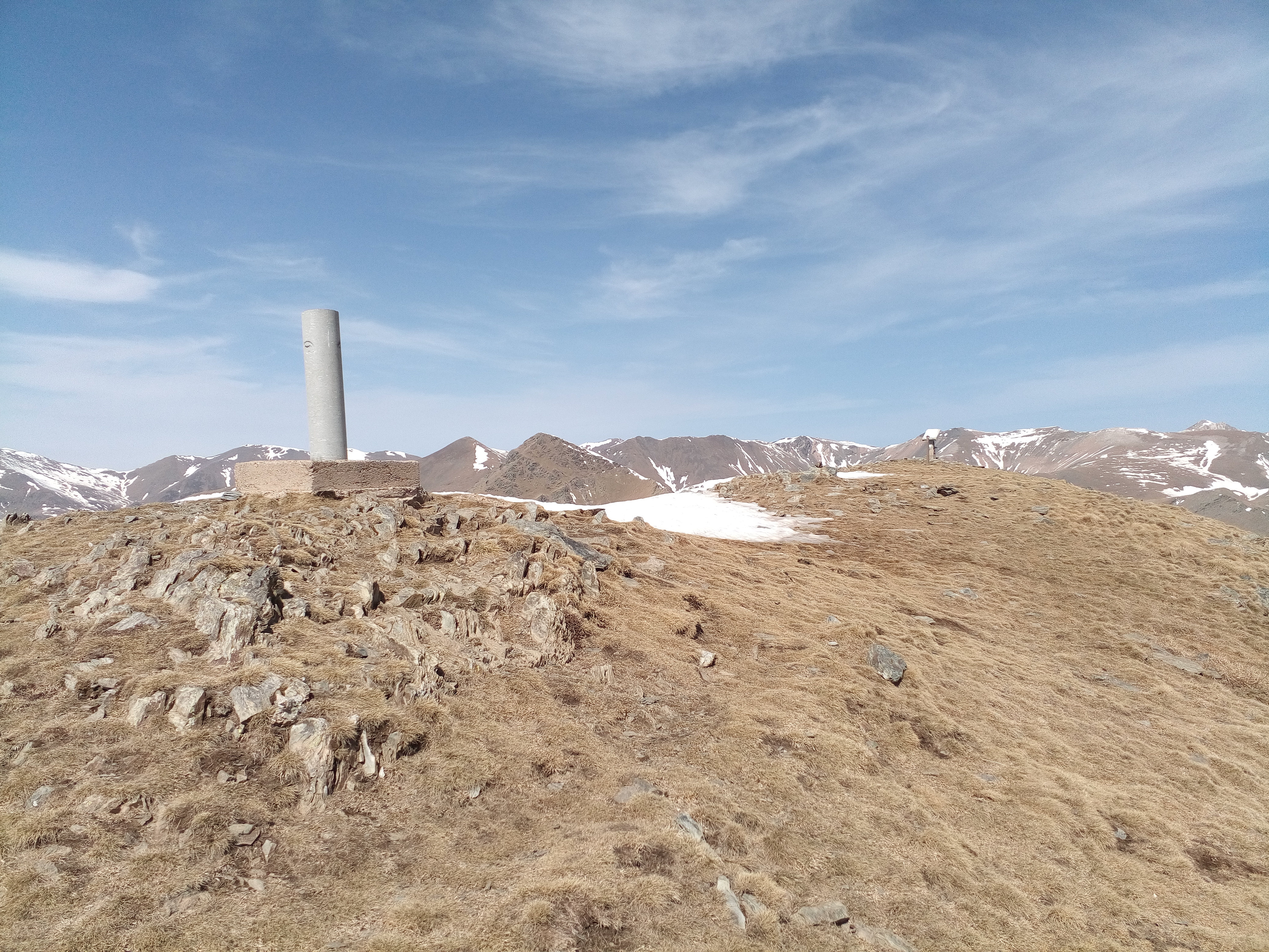 Ya sólo resta atravesar una zona de muy suave pendiente para enlazar con el sendero de la cresta sur del Balandrau y coronar el gran objetivo del día. Es la una y veinte, y he tardado cuatro horas justas desde el centro de Ribes. Hay un vértice geodésico y una estela con forma de atril en el punto más alto.