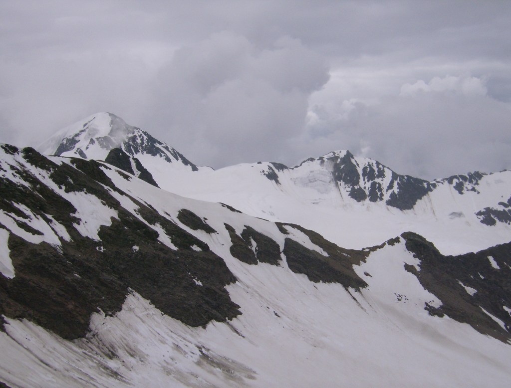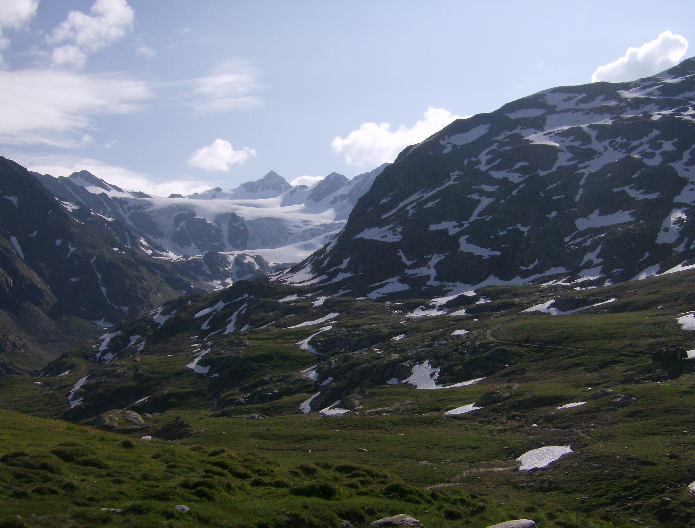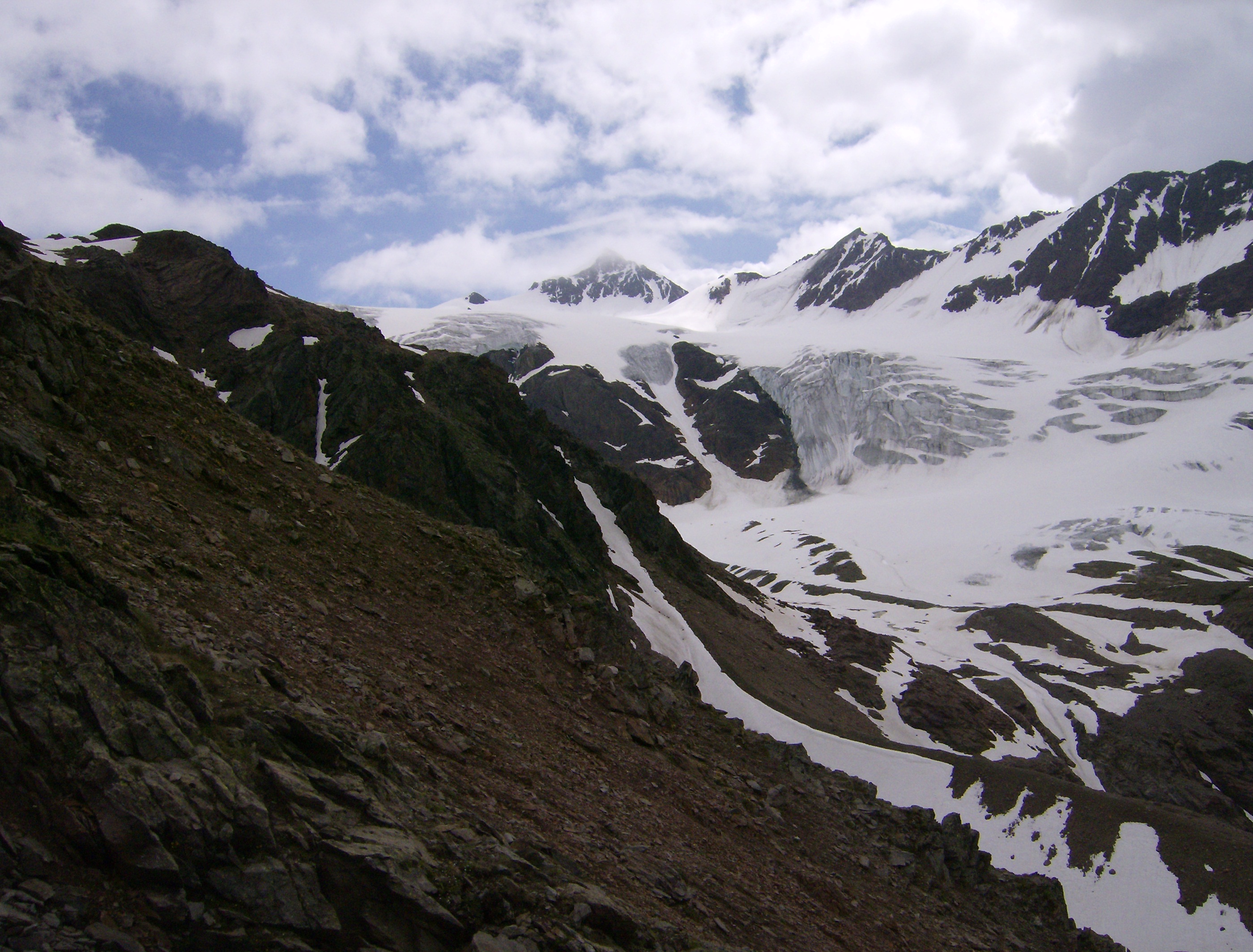 El tiempo se va nublando según subo, y el fresquito se agradece con la dura pendiente que hay que superar. Una hora después de cruzar el torrente, un poco por encima de la cota 3000, la nieve hace su aparición, el camino supera una serie de colladitos y pequeñas cuencas, y empieza a regalar vistas impresionantes sobre el glaciar y las grandes cumbres cercanas. Casi doce años después, me pregunto si el glaciar presentará un aspecto igual de saludable…