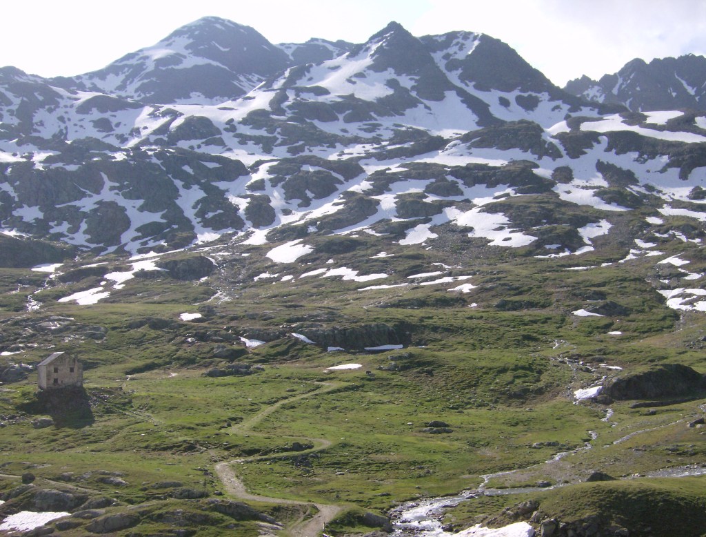 La primavera ha sido abundosa en nevadas, y el deshielo está dejando unos torrentes desbordantes. La zona de Pian Bormino hacia la que me dirijo se encuentra semiinundada. El viejo refugio Gavia sirve de punto de referencia en estos primeros metros.
