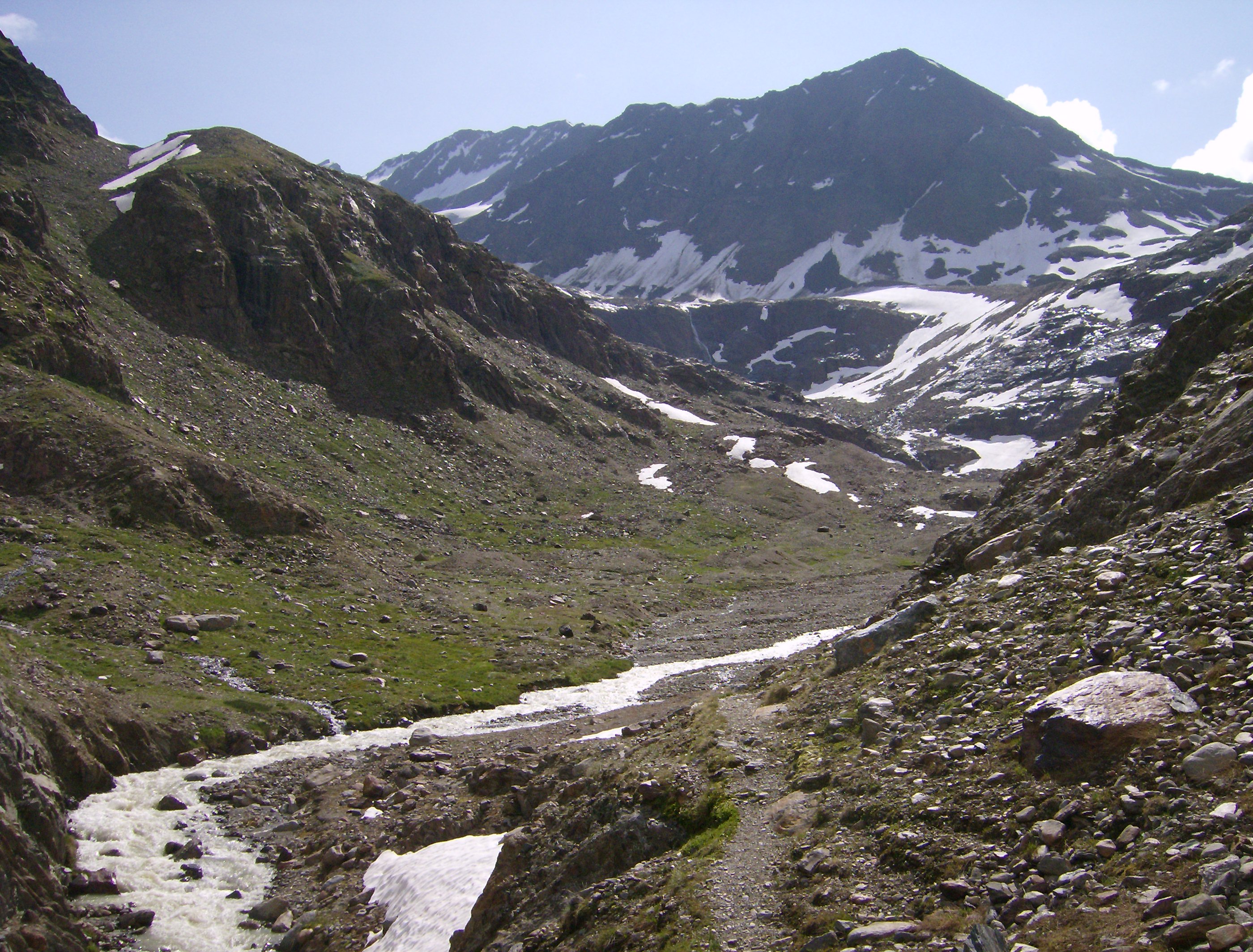 El sendero señalizado es el 25, que va buscando el Torrente Dosegú, que drena el glaciar homónimo, a los pies del Tresero y la Punta San Matteo.