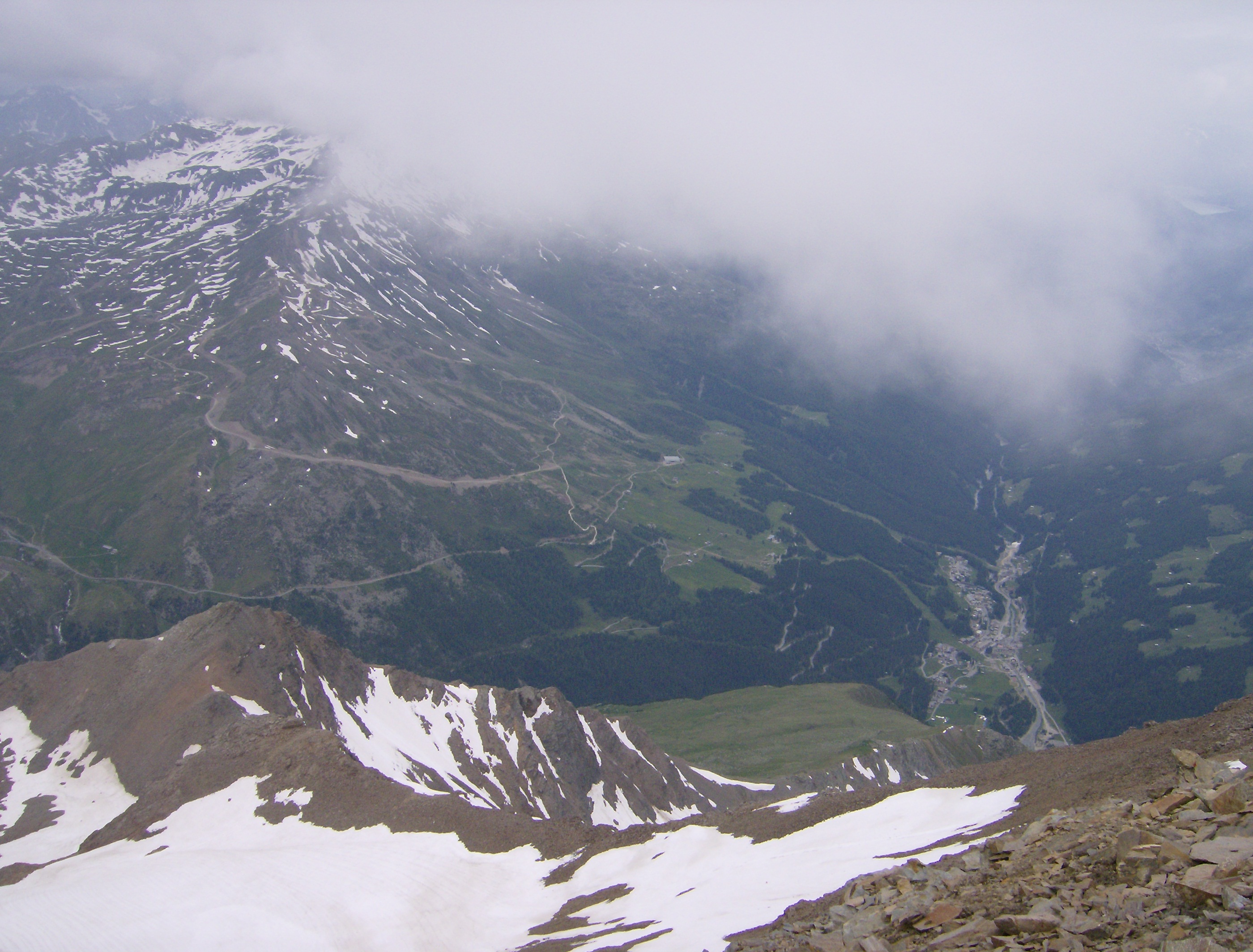 Mirando hacia abajo veo todo el desarrollo de la cresta SW, con el vivac Seveso muy cercano, el Glaciar Pedranzini a su izquierda y el gran Monte Sobretta, al otro lado de la carretera del Gavia, dominando el horizonte.