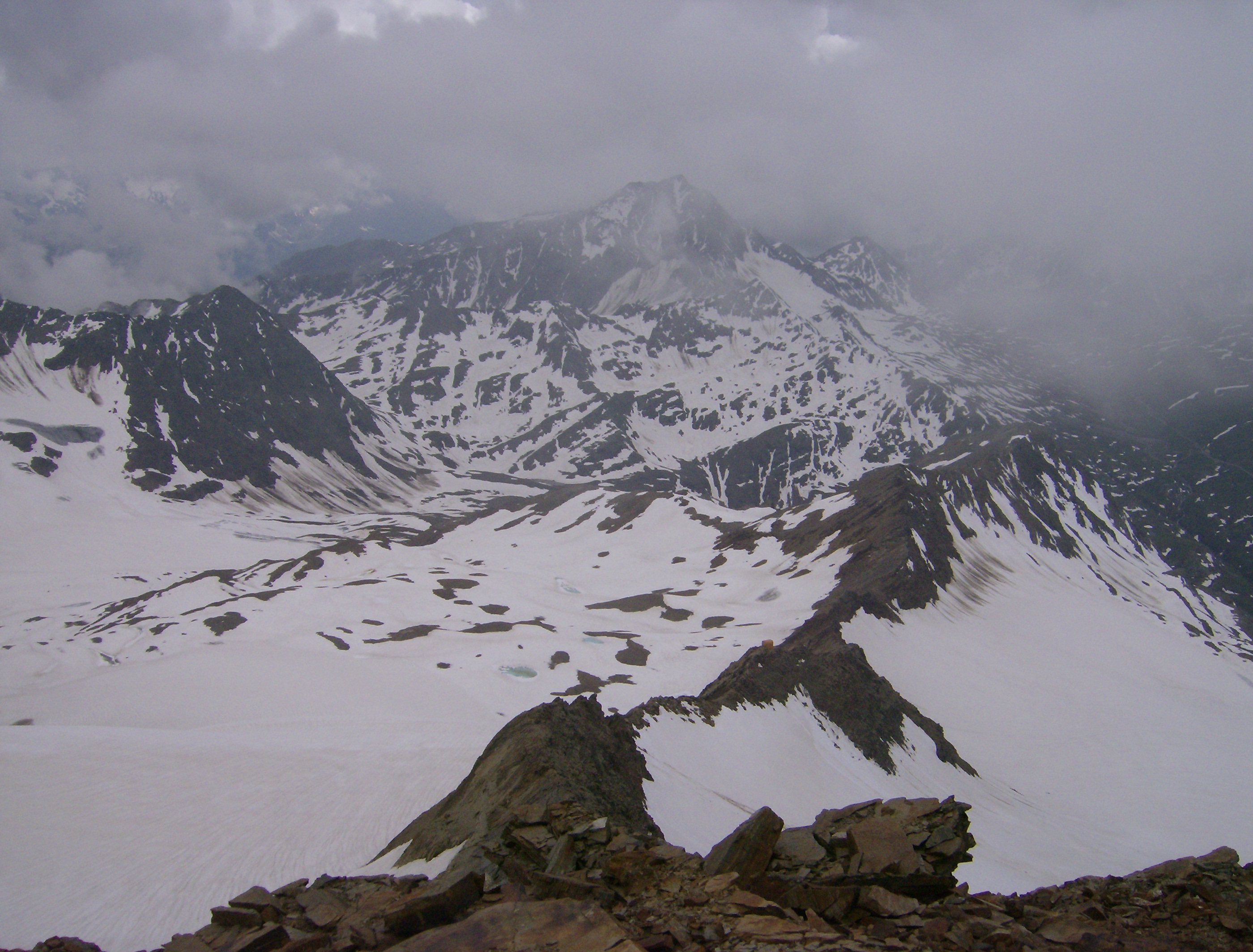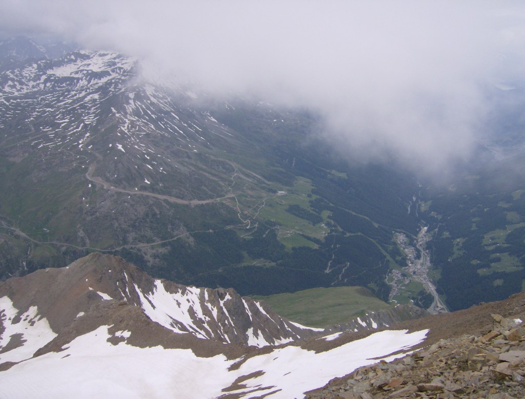 Cada vez hay más nubes, y se frustra mi esperanza de gozar de la vista de todo el arco de cimas desde el Gran Zebrù y el Cevedale hasta el San Matteo. Este último se encuentra semioculto por la Punta Pedranzini, pero puedo avistar entre la niebla la Punta Taviela y a su izquierda, separado por un profundo collado, el monte Vioz, cuya ascensión he descrito en otro post.