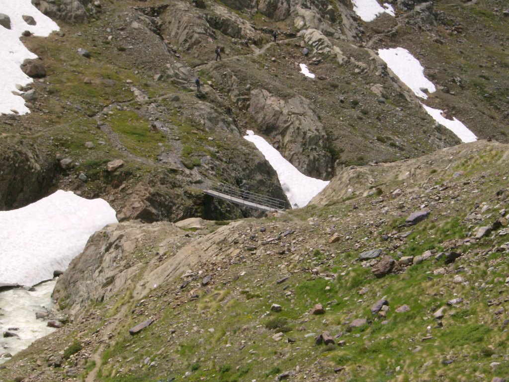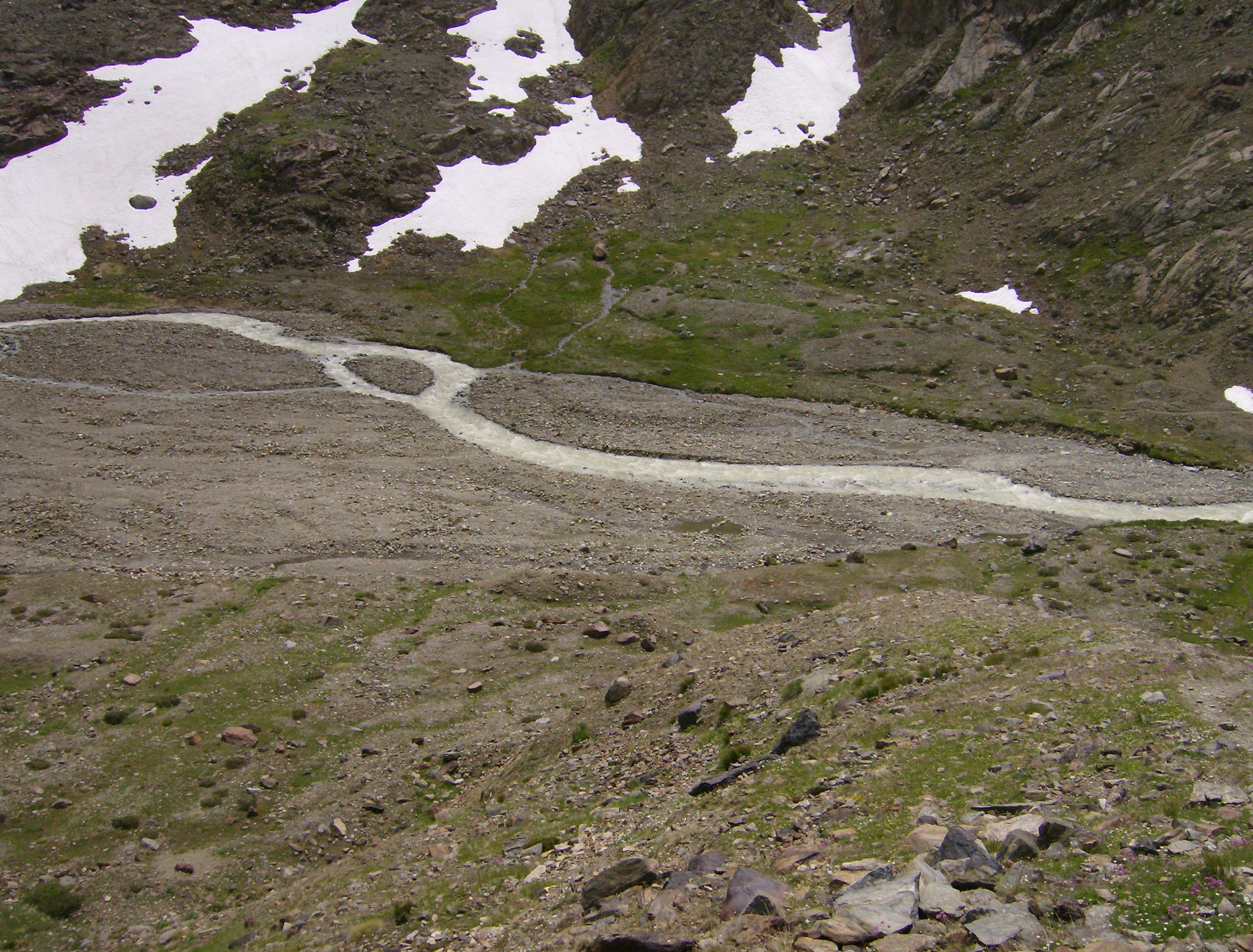 No permanezco arriba durante mucho tiempo, por el miedo a que se me eche encima un marrón gordo y porque nunca es conveniente aventurarse por un glaciar a hora demasiado tardía. Desciendo velozmente por el mismo camino, atravieso de nuevo el glaciar Pedranzini y gano la seguridad del terreno herboso en la proximidad del río. El tiempo se aguanta y parece que hoy no me mojaré.
