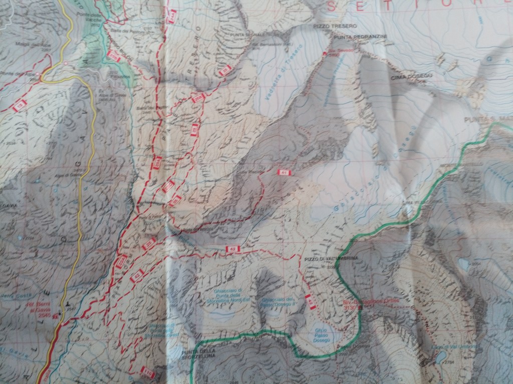Progreso llaneando hasta entrar en el valle Dosegú, donde al cabo de media hora se llega al Ponte della Amicizia, el Puente de la Amistad, que permite salvar el impetuoso curso de agua. Hemos dejado a la derecha (izquierda hidrográfica), la traza que conduce a la Punta San Matteo. A partir de aquí, abandonamos el sendero 25, que parte a la izquierda siguiendo el curso del río para encaminarse hacia la Punta Segnale, situada sobre la cresta W del Pizzo Tresero. El sendero 41 comienza a subir con decisión, remontando la ladera bajo la cresta SW.