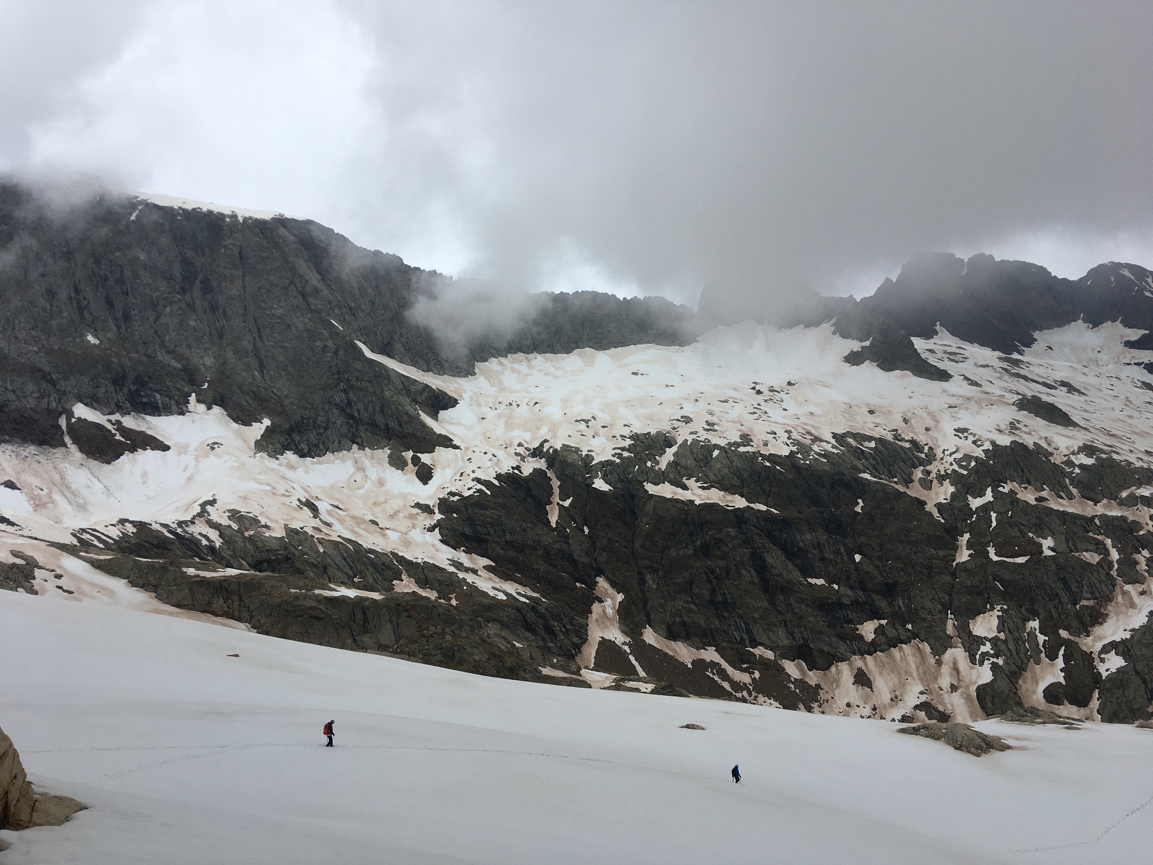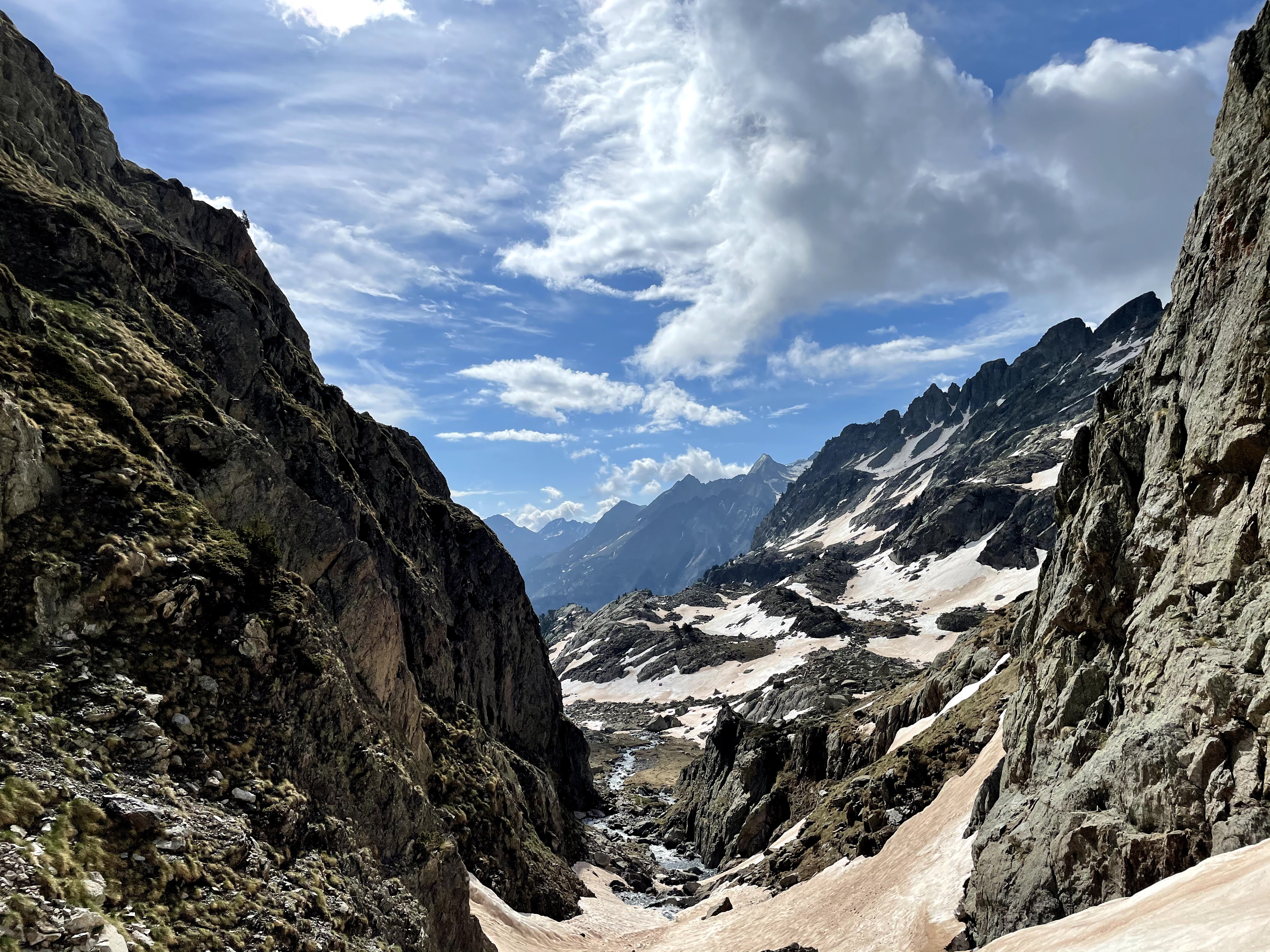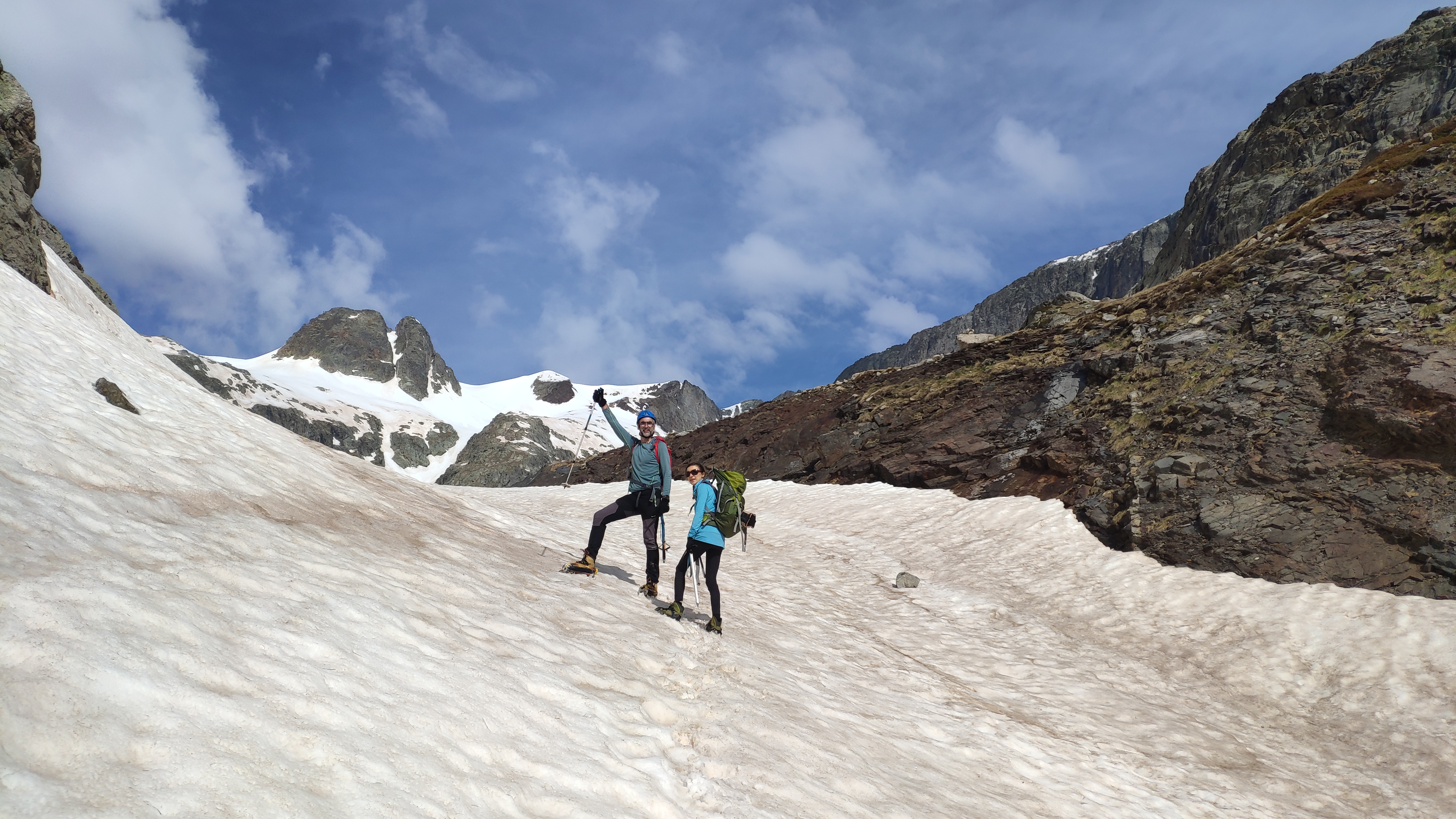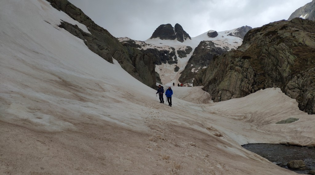 La pequeña frustración por la cumbre fallida se disipa pronto. La pendiente que nos había hecho sufrir en subida nos regala una bajada disfrutona. A lo tonto, llegamos a la garganta y al momento delicado del cruce del río por el puente de nieve, que solventamos sin incidencias. Descramponamos y salimos de la garganta consiguiendo que nadie acabe en el agua de cuerpo entero.