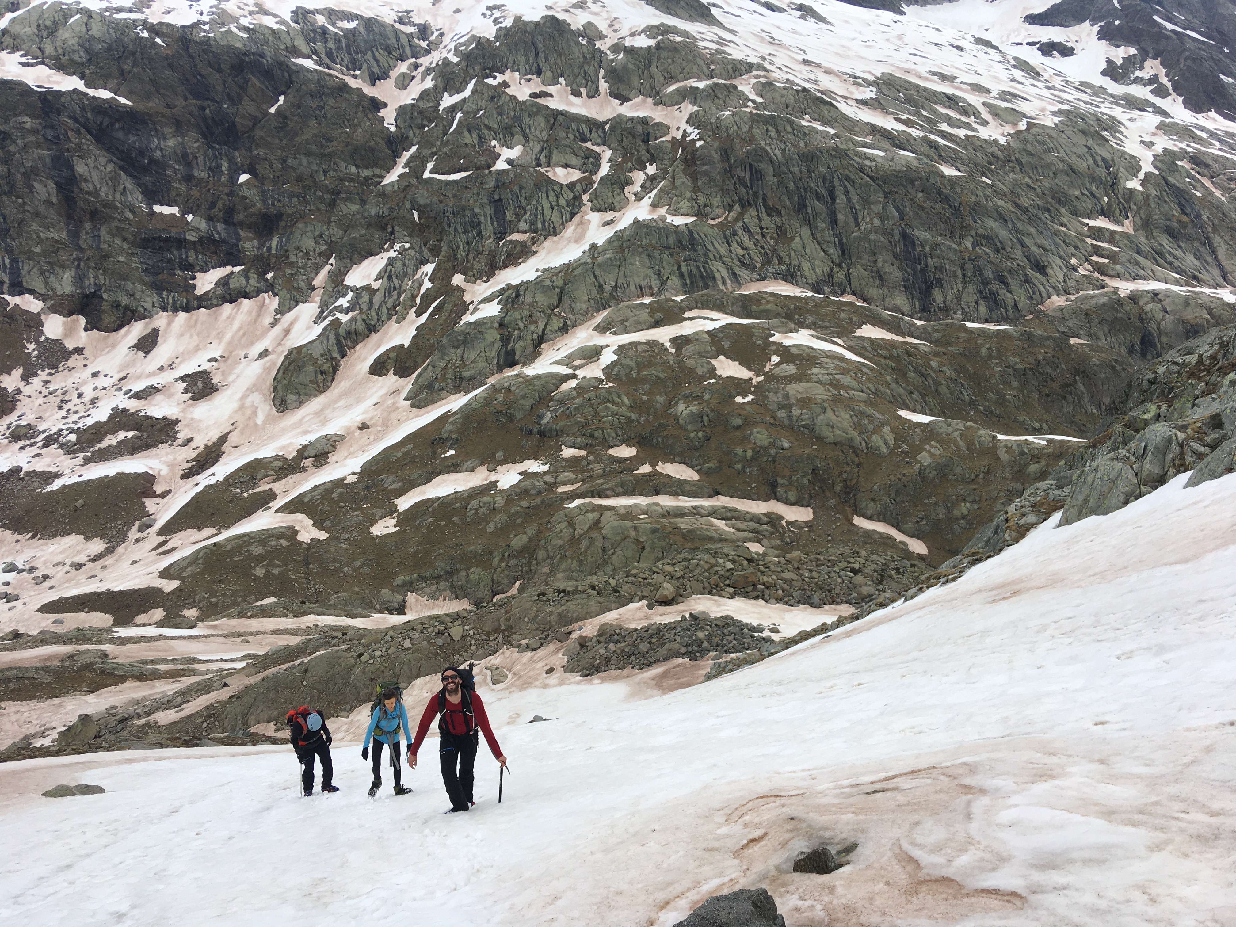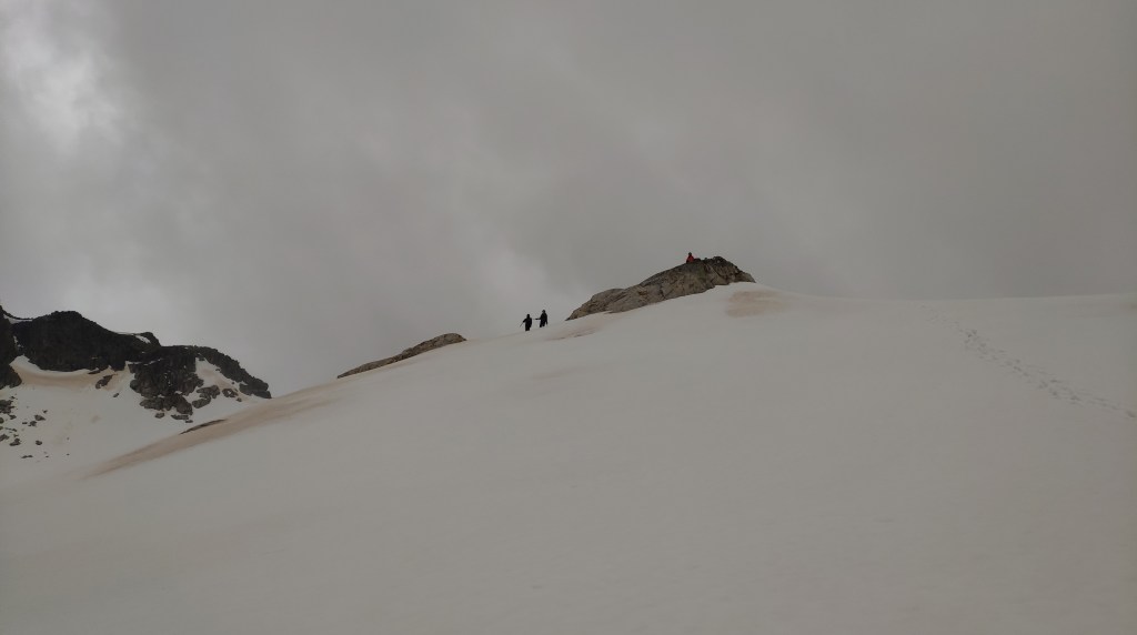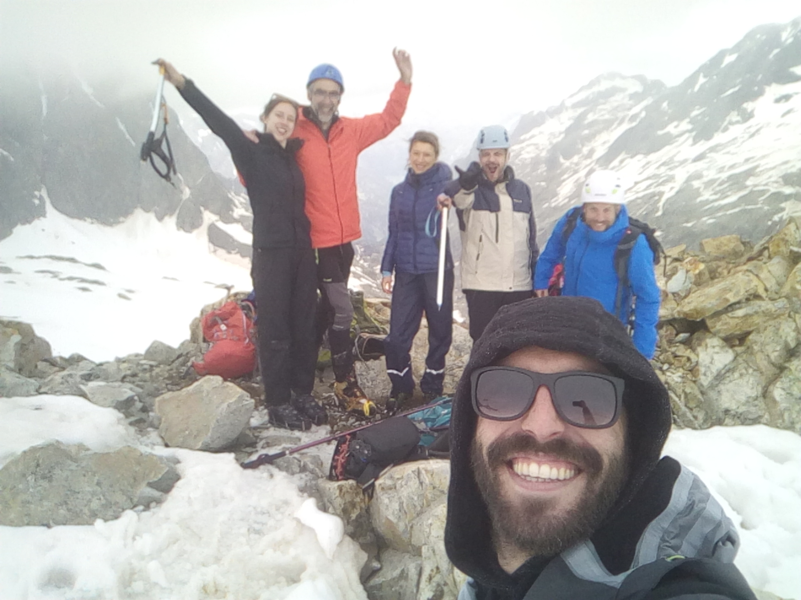 Así que fuimos tirando para abajo con relativa calma. Algunos hasta tuvieron tiempo de hacer prácticas de autodetención con el piolet y bajar «esquiando» sentados.
