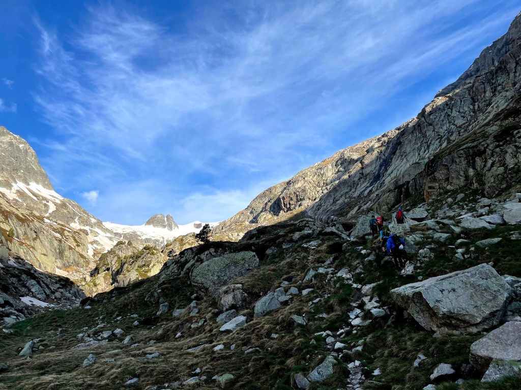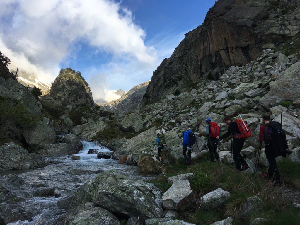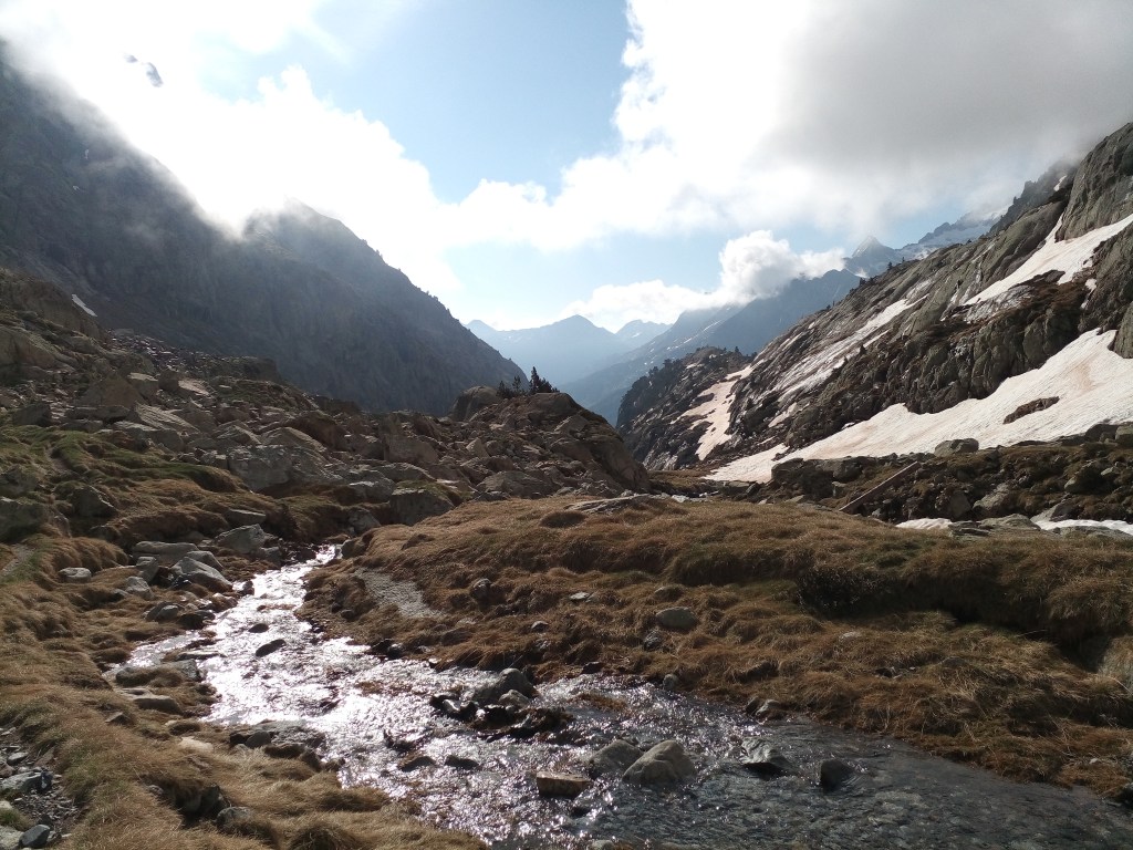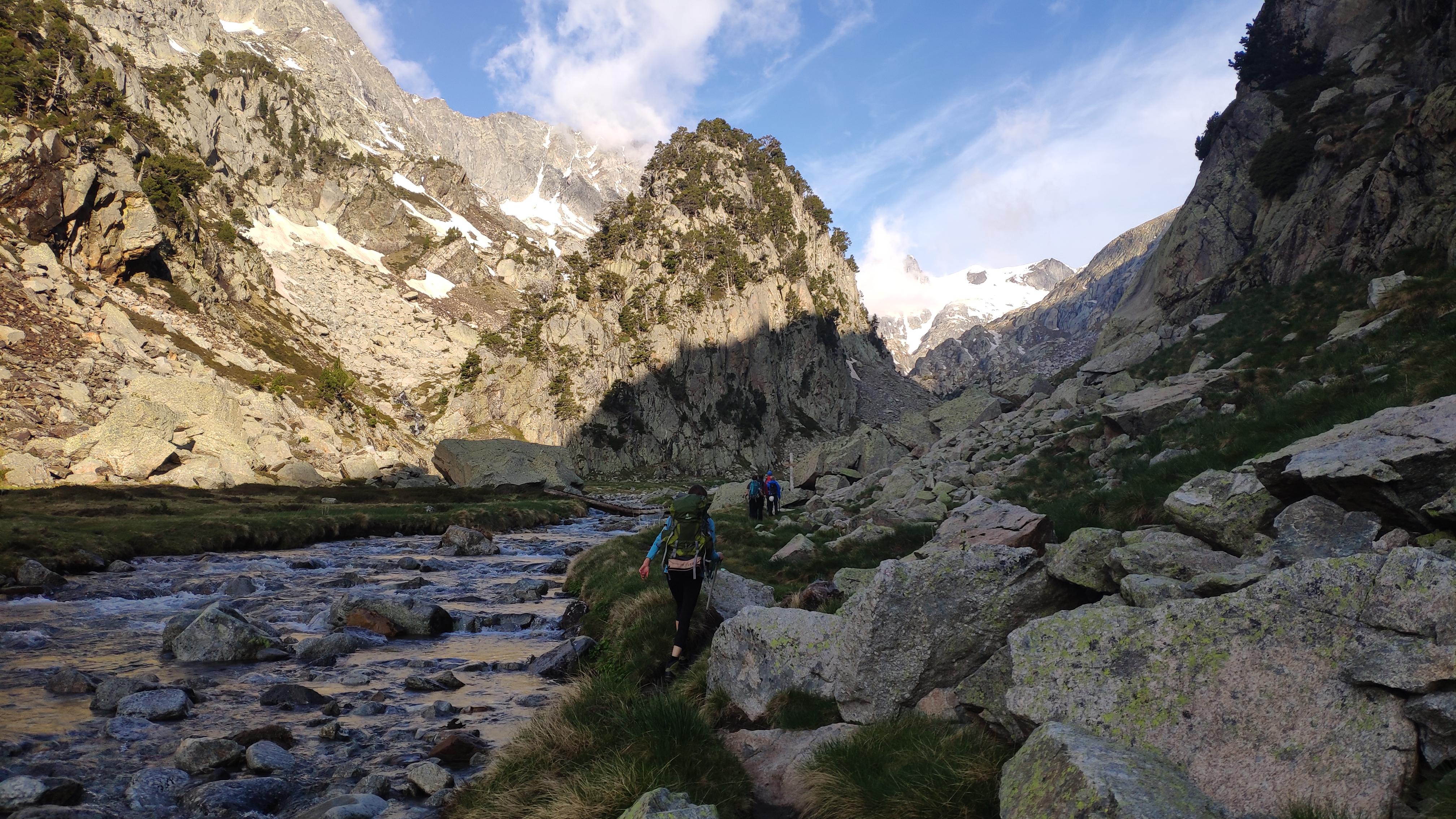 Se alcanza una zona más llana, la Pleta dels Capellans, antes de seguir subiendo y aproximándonos al gran torrente de Remuñe. Las vistas también se abren a nuestras espaldas, hacia el Macizo de la Maladeta, con la Cresta de Alba dominante.