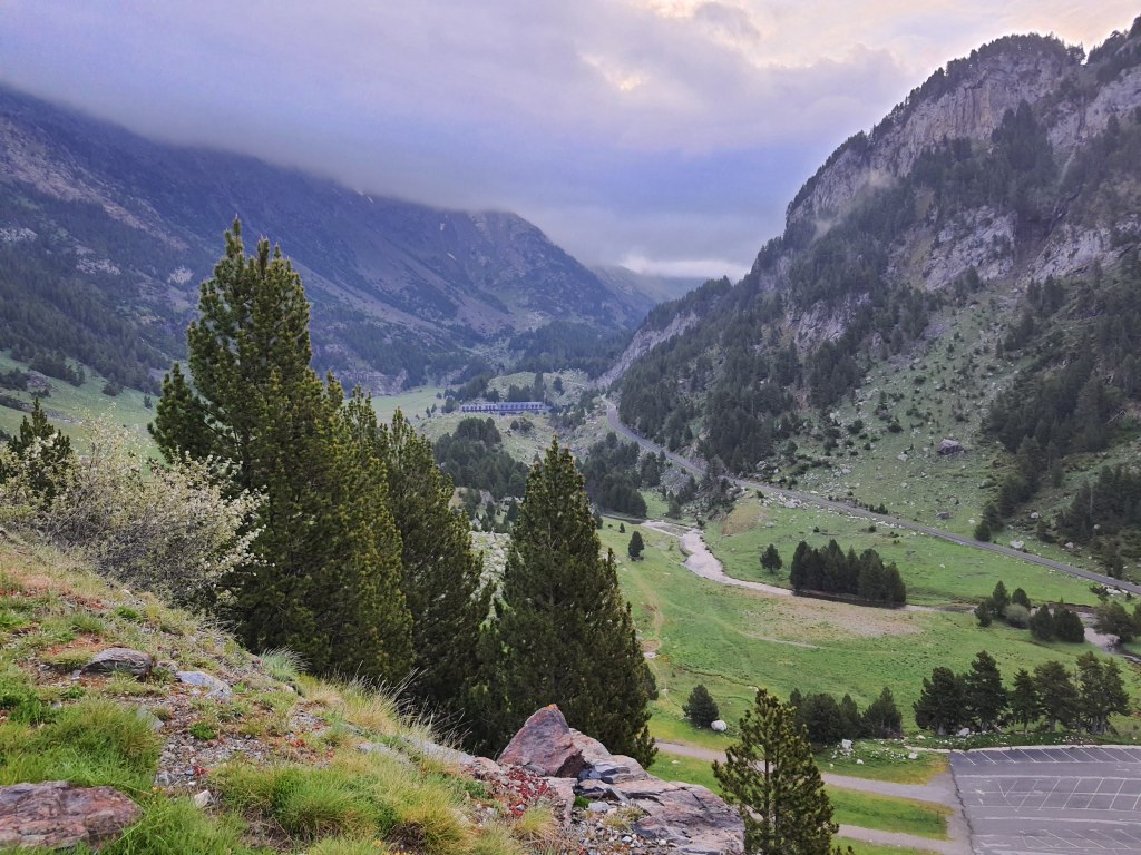 El tiempo está medio nublado. La previsión es de lluvias a partir del mediodía y mi idea es la de llegar a la cumbre de la Tusse no más allá de esa hora. Nos encontramos en la vertical del gran aparcamiento de los Llanos del Hospital. Me impresiona verlo vacío un domingo por la mañana. Dentro de un mes estará abarrotado y los buses lanzadera de la Besurta a tope de turistas y montañeros. Hoy estamos totalmente solos.