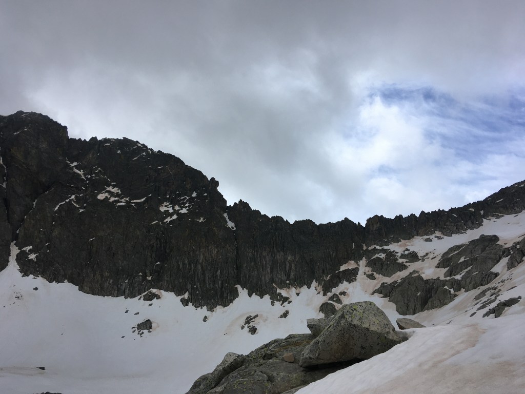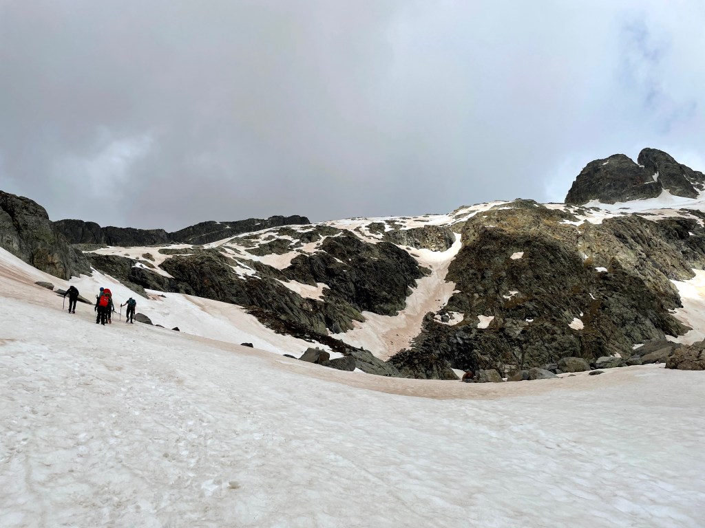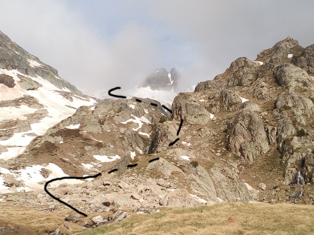 Volviendo a nuestra ruta, sin llegar al Ibonet de Remuñe atacamos la pendiente en dirección W, tomando como primera referencia un rellano flanqueado por dos modestos promontorios rocosos. Desde aquí se gira decididamente a la izquierda, cara a la Cresta de Remuñe, en dirección S. Nos dirigimos hacia un pequeño espolón rocoso a partir del cual volveremos a girar hacia la derecha. El tiempo empieza a torcerse. Por desgracia parece que las previsiones se está cumpliendo.
