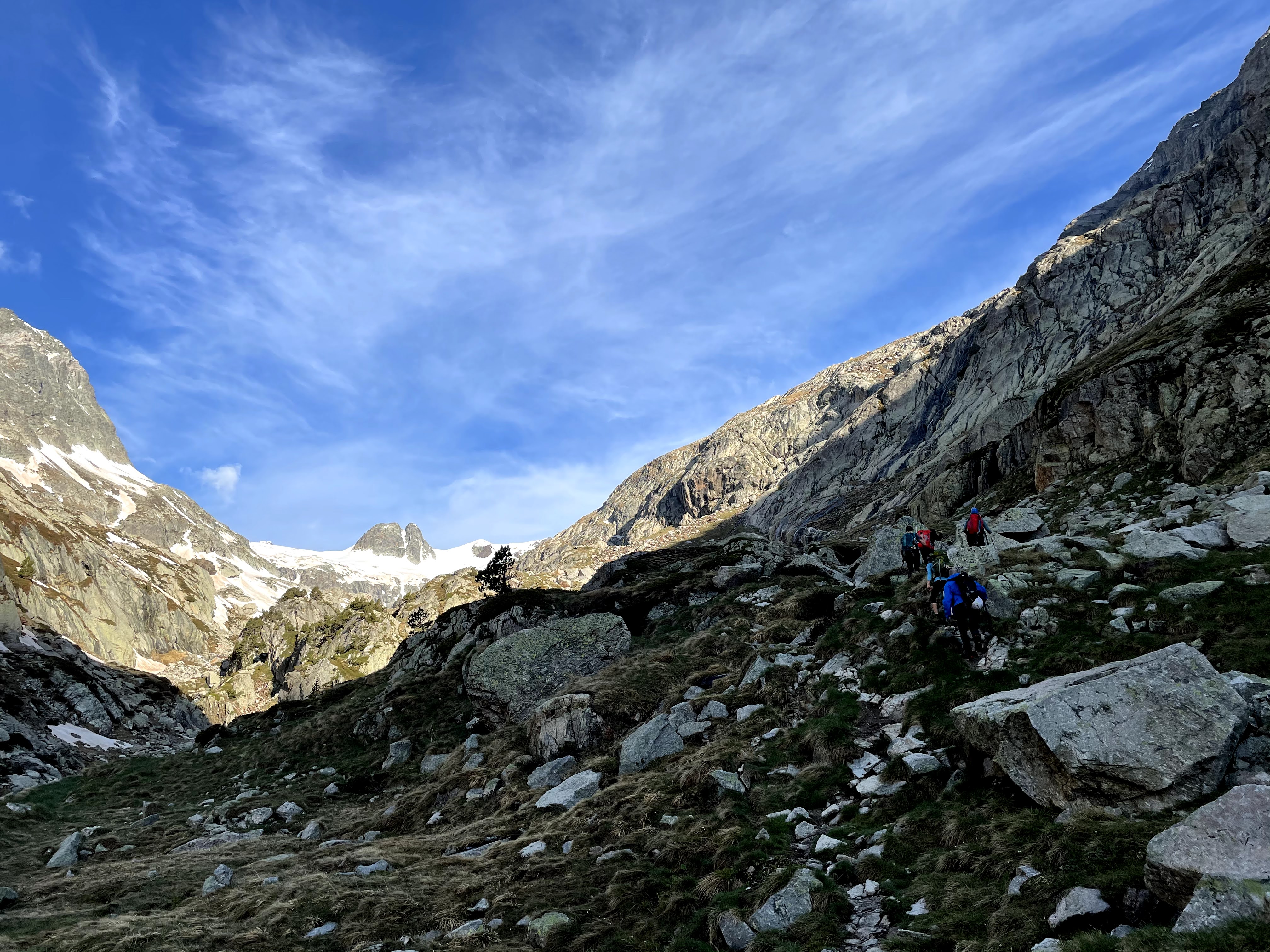 Aproximándonos a Benasque las montañas me habían parecido bastante desprovistas de nieve, incluso cerca de la cota tresmil. Sin embargo, ya se podía vislumbrar que la parte alta del valle se encontraba muy cargada. Retomamos la subida, por terreno pedregoso y con pendiente sostenida.