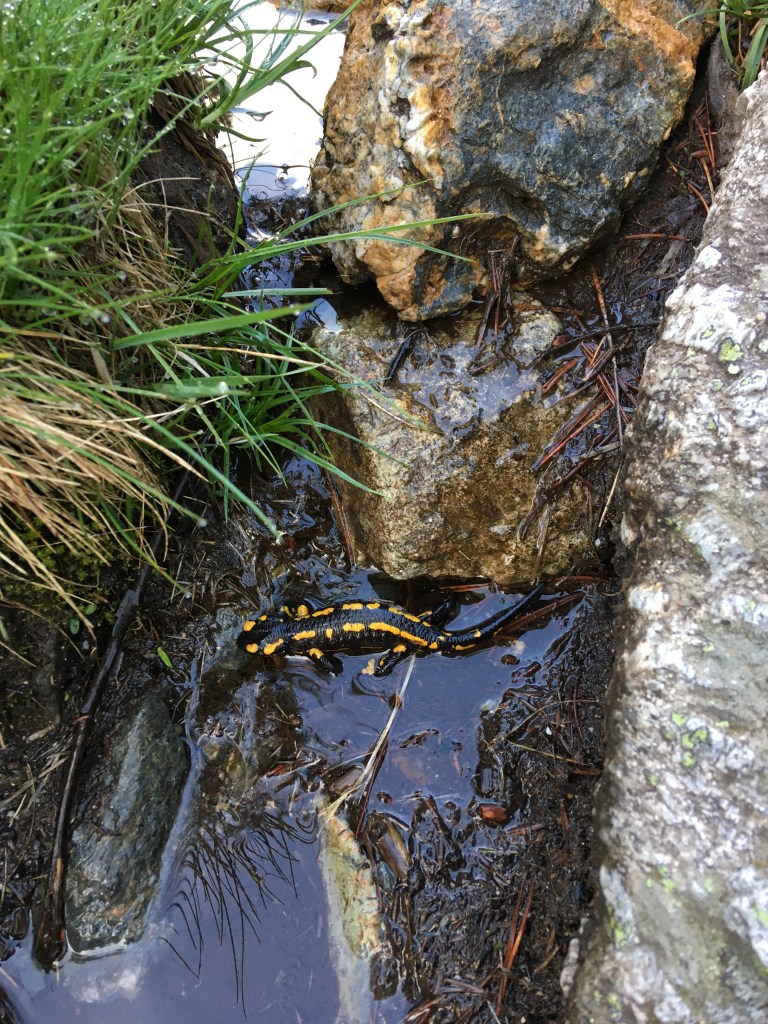 Este es el período de máximo deshielo en las montañas. Múltiples arroyuelos cruzan nuestro camino, y a esta hora de la mañana las salamandras se están desperezando.