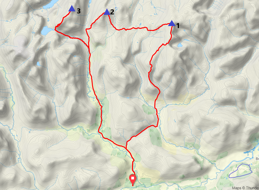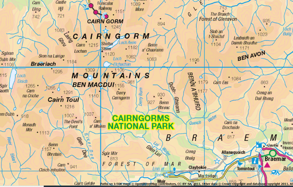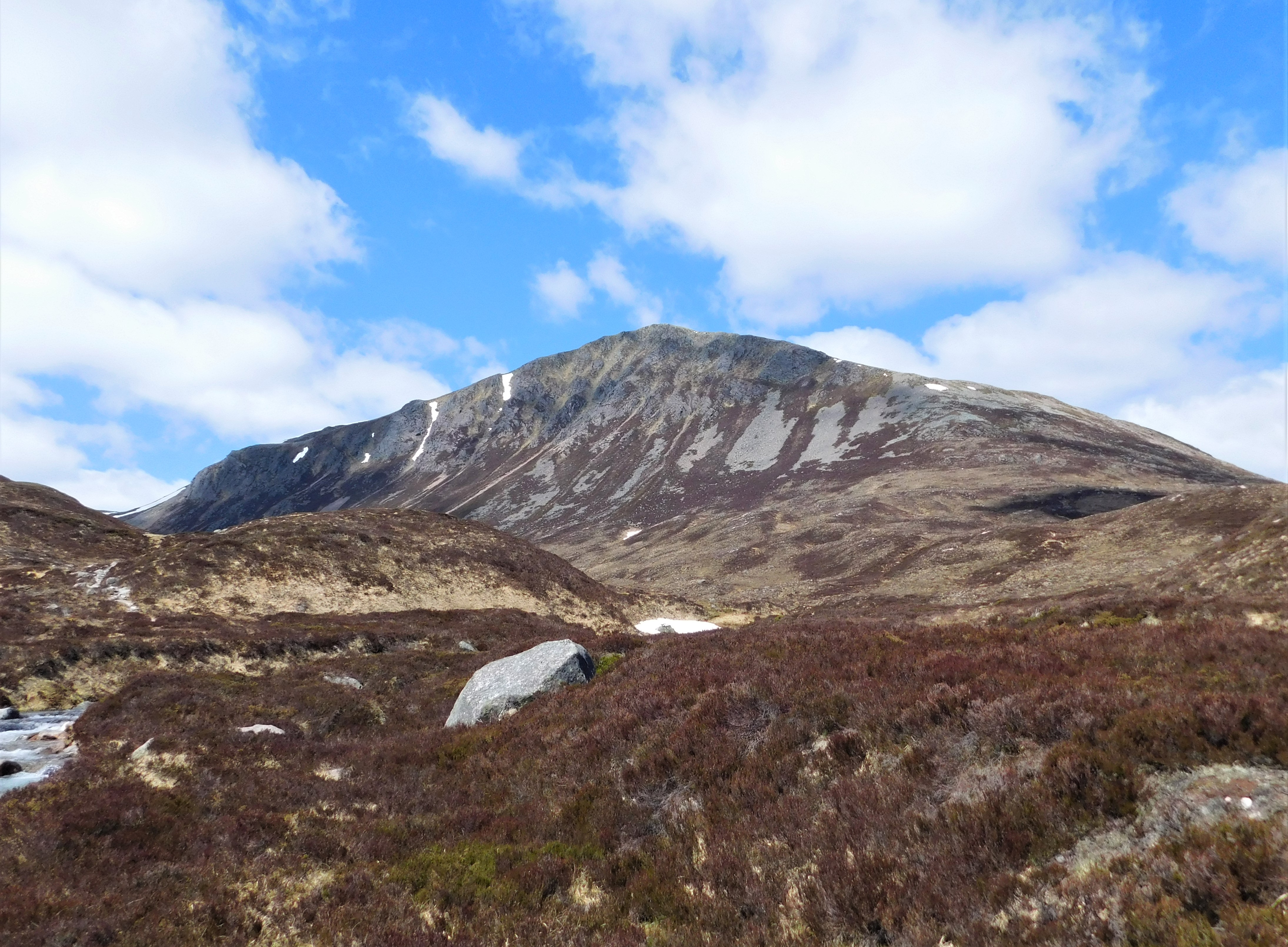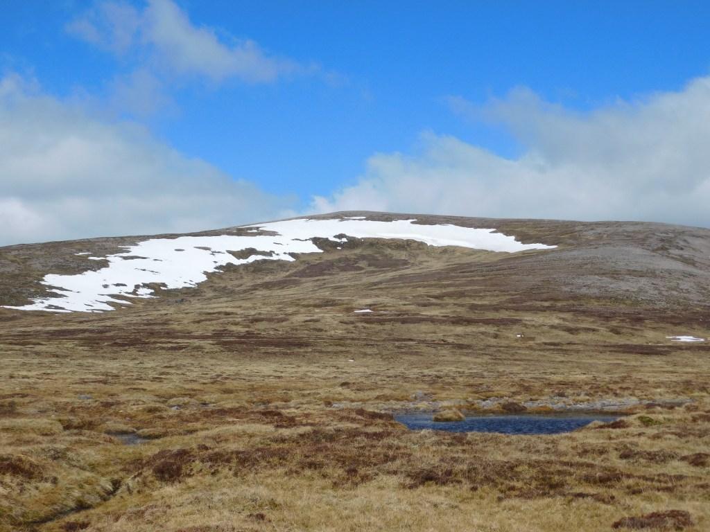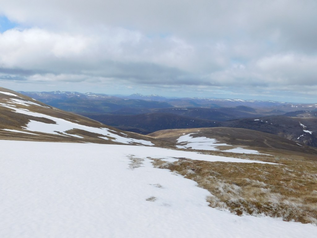 El objetivo en esta fresca mañana de mediados de mayo es enlazar tres Munros (así se denominan las cumbres escocesas que superan los 3000 pies, o 915 m): se comienza por la undécima montaña más alta de Gran Bretaña, el Beinn a’Bhùird (1197 m), cuya cima, como sucede con frecuencia en este macizo, no es sino una prominencia en una elevada meseta. Desde aquí, avanzando hacia el Oeste, alcanzaría el Beinn a’Chaorainn (1082 m) y el Beinn Mheadhoin (1182 m), al otro lado del paso Lairig an Laoigh. Una larga ruta circular de casi 50 km.