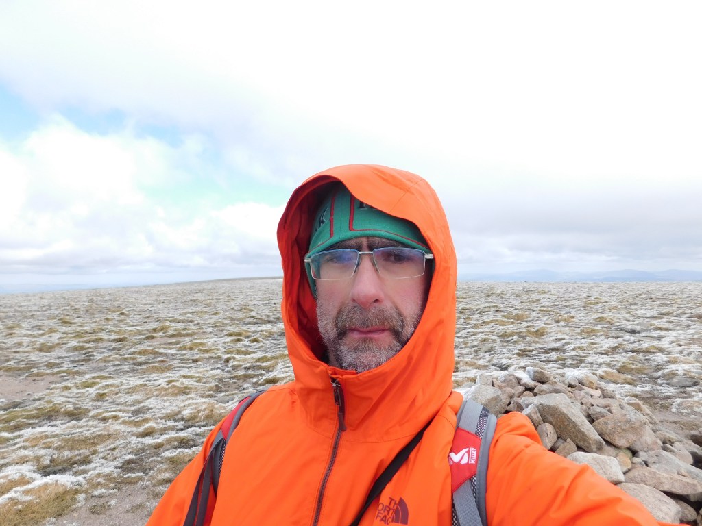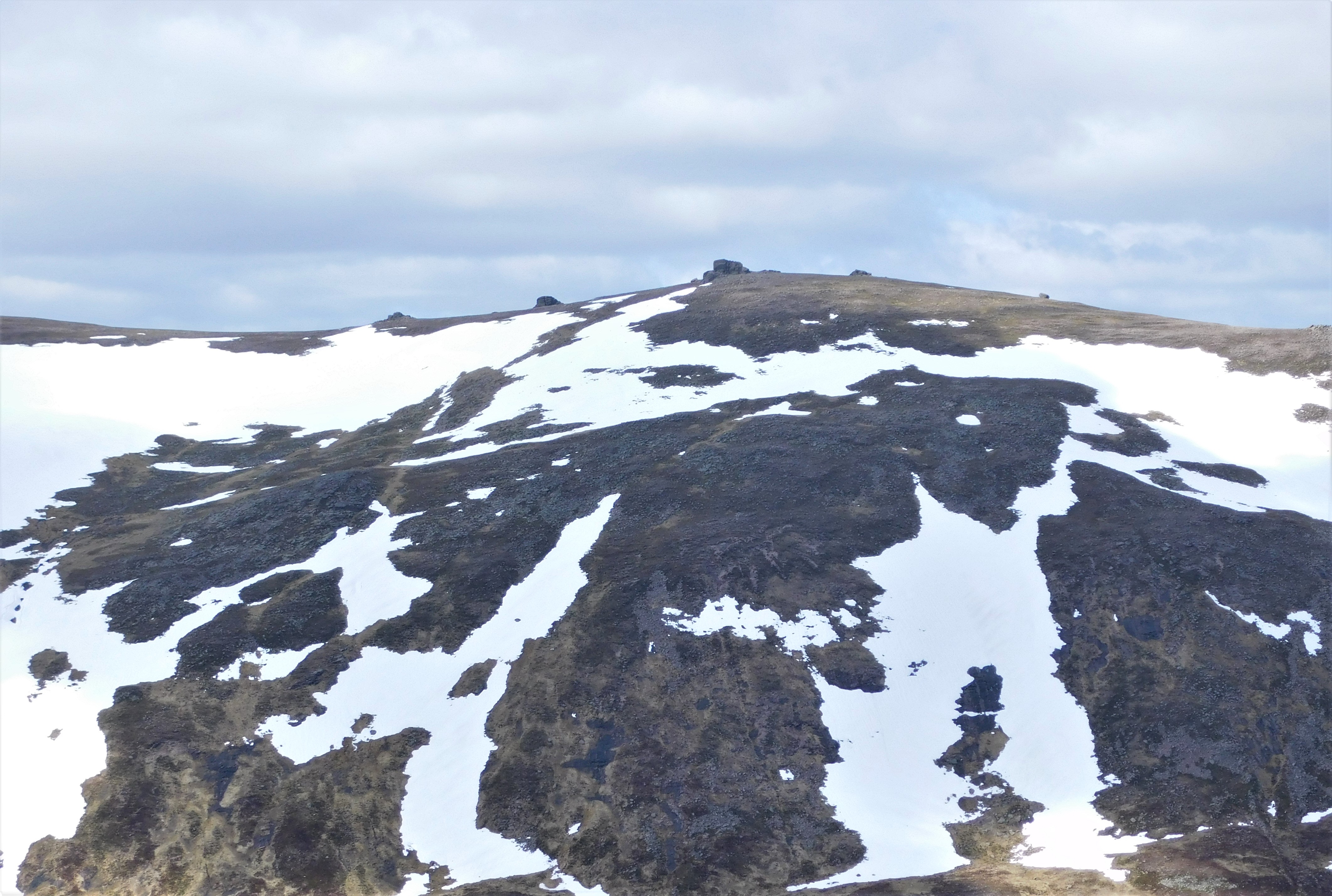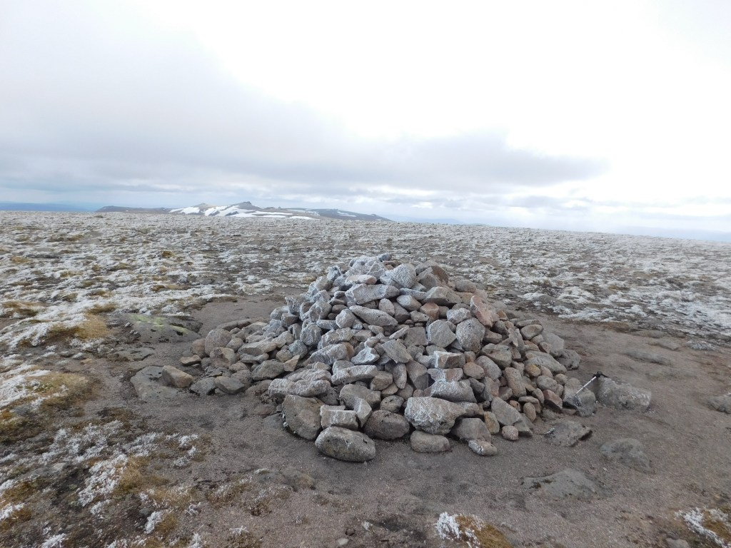 Desde aquí resta una suave subida de algo más de un kilómetro hasta la cumbre principal, un punto anónimo señalizado por un montón de piedras en medio de la tundra helada. Son las diez y veinte. He empleado dos horas y cuarenta minutos en recorrer los casi quince kilómetros desde el aparcamiento. Me invade una satisfacción un poco tontorrona por mi performance física hasta este momento. Hace fresco aquí arriba, y bastante. Humedad por dentro y por fuera, sudor y niebla…
