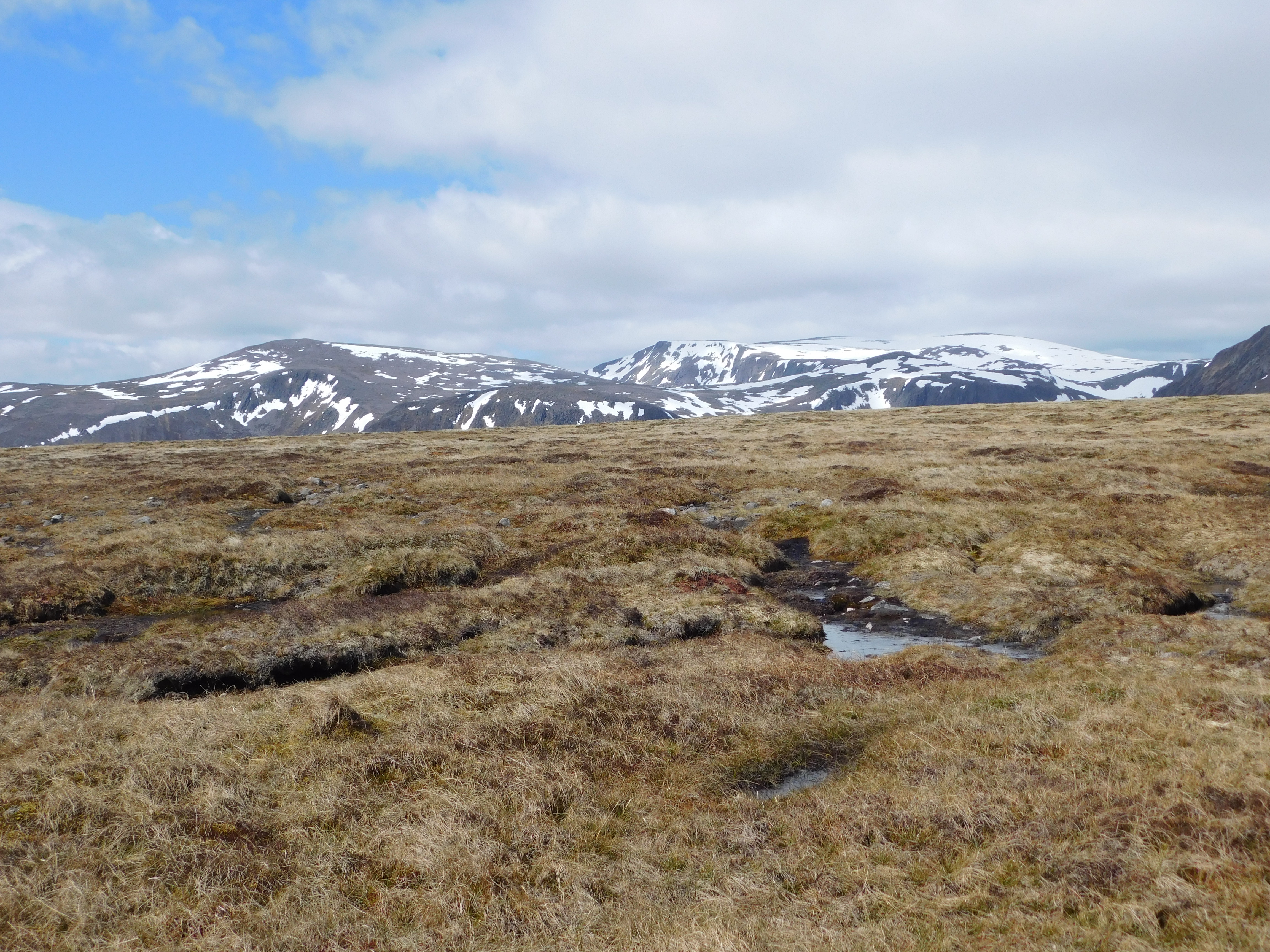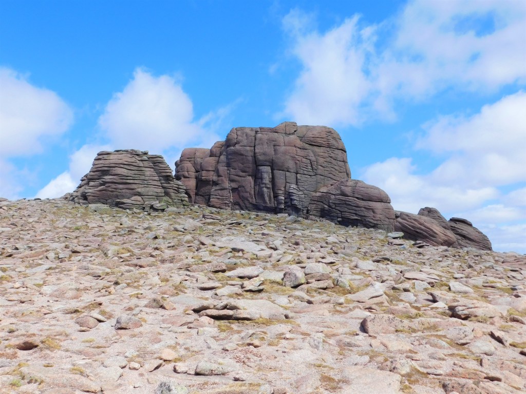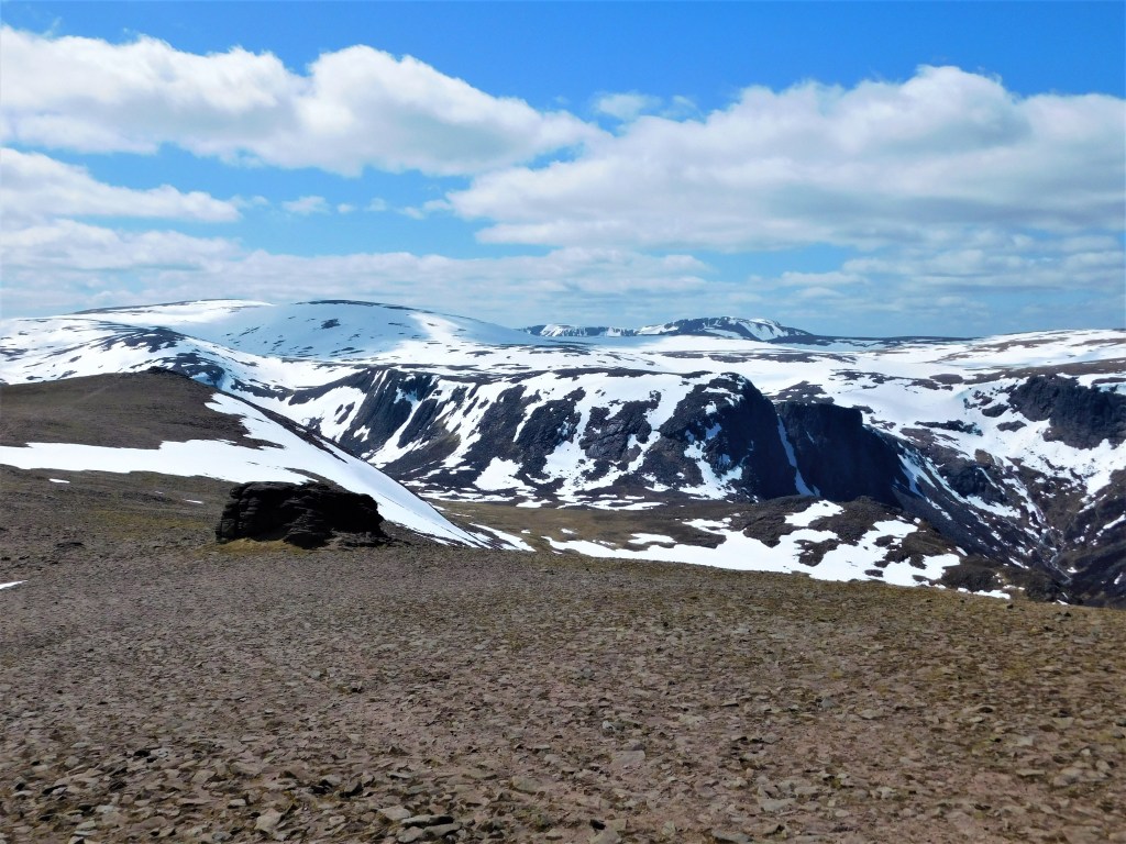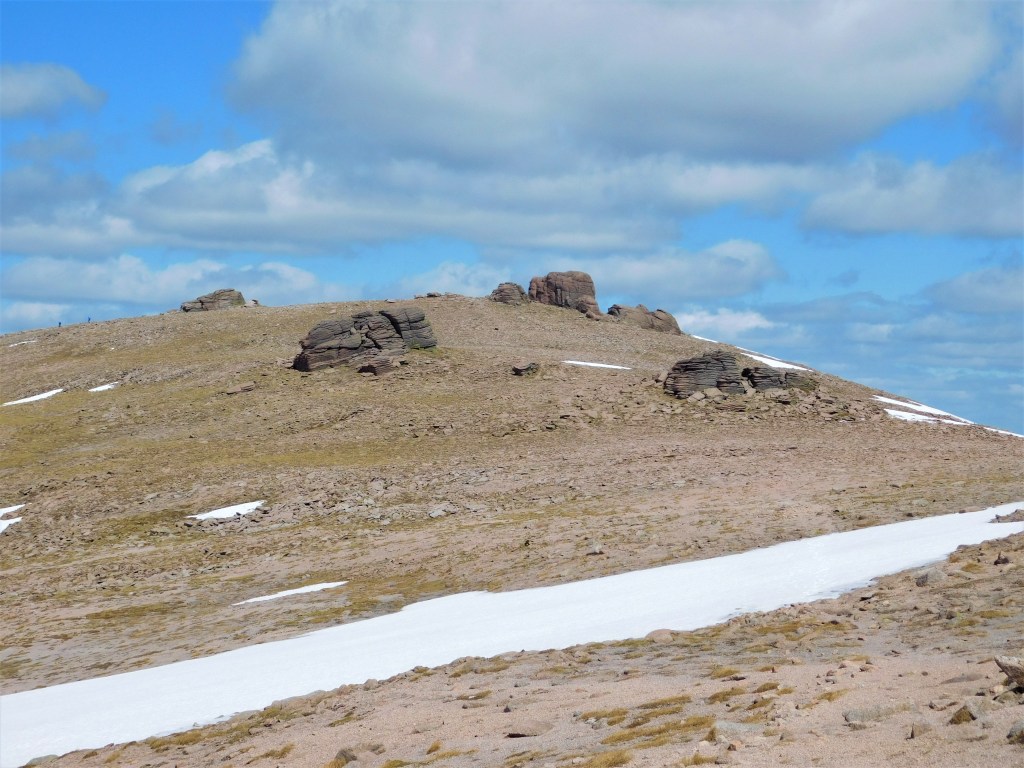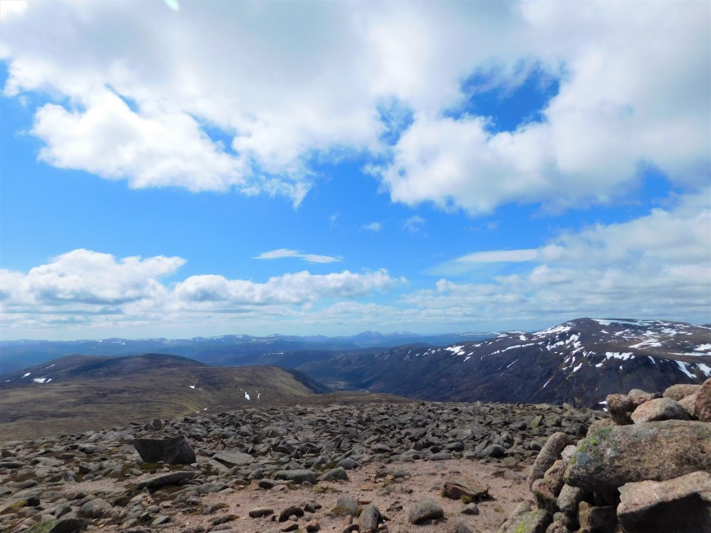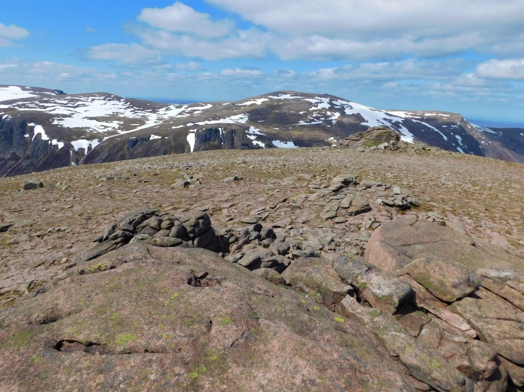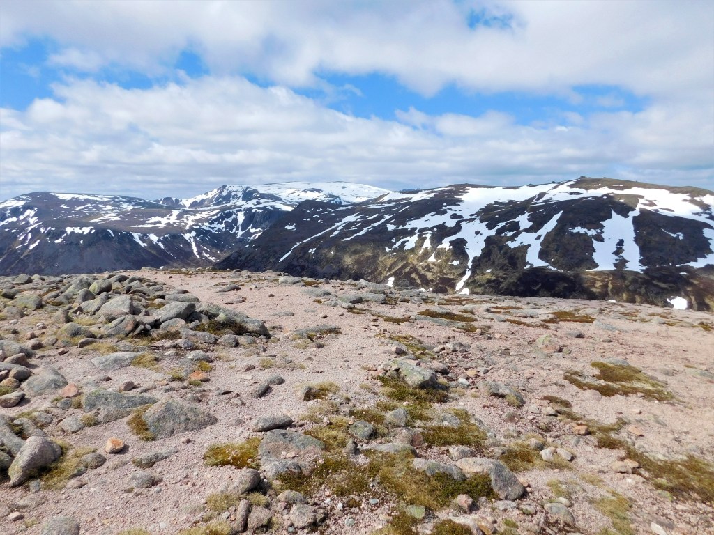 Vuelvo a resoplar cuando el desdibujado sendero comienza a subir, con considerable inclinación, nuevamente hacia el norte. Lo bueno es que dejo atrás la turbera. La última parte discurre por terreno pedregoso. Se sale a la cresta a escasos metros al este de la cima. Son las doce menos cuarto, y he recorrido ya veintiún kilómetros. La fatiga empieza a hacerse notar, pero ahora puedo disfrutar de un paisaje diferente, más montañero. El Beinn Chaorainn goza de una posición más centrada en el macizo, y se aprecian bien todas sus grandes montañas. Al norte, el Bynack More y el Cairn Gorm. Hacia el este, el Beinn a’Bhùird. Al sur, el redondeado Beinn Bhreac pocos kilómetros más abajo y las lejanas montañas del Perthshire. Hacia el suroeste las crestas del Derry Cairngorm y al oeste el Ben Macdui, el pico más alto del macizo y segundo de toda Gran Bretaña.
