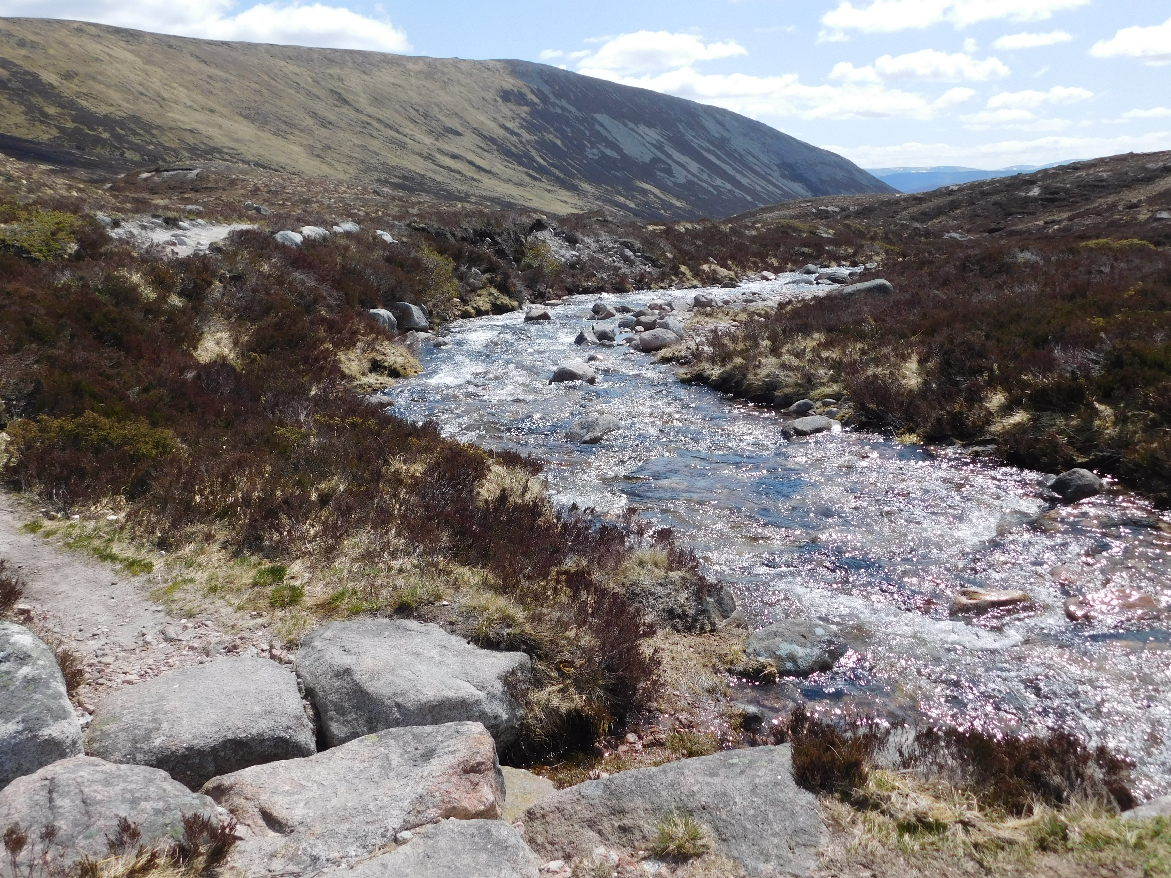 Después de colocar el ticket de aparcamiento en el salpicadero (2 libras en 2016), inicio mi camino. Son las ocho menos veinte, el tiempo está nublado y posiblemente la visibilidad allá arriba no sea muy buena… En fin, me pongo en camino hacia el Derry Lodge siguiendo las indicaciones, a través del bosque. ¡Qué familiares estos primeros pasos, todavía somnolientos, por terreno conocido! Cruzo un puente y una cancela para enlazar con una ancha pista forestal al cabo un kilómetro escaso. Cerrada a la circulación motorizada, permite cómodas aproximaciones utilizando la bicicleta, que suele dejarse en las inmediaciones del Derry Lodge, 5 km más allá. Una de las cosas que más me gustaron del hillwalking en Escocia es la confianza con que la gente deja sus bicis en mitad de la nada, sin temor a que nadie las robe… Recorro la pista a buen paso y en breve alcanzo el característico puente que permite cruzar el ancho y caudaloso río Lui para pasar a la orilla izquierda. Aquí se une a otra pista, que llega desde el vecino Mar Lodge, y al cabo de otro kilómetro encuentro mi desvío, bien señalizado con un mojón de piedras. Aquí es donde empiezo a subir en serio. Se trata de un camino que sale a la derecha, en ángulo recto, y comienza a remontar la ladera para alcanzar, apenas 100 m más arriba, un paso encajonado, el Clais Fhearnaigh, donde encuentro una recogida laguna que alberga una nutrida colonia de patos. Desde aquí el sendero desciende suavemente hasta enlazar con otra ancha pista, en un nuevo valle, el Glen Quoich. Esta es la ruta «normal» del Beinn a`Bhùird, que parte desde Allanaquoich, situada al final de la carretera del Linn of Dee. Camino junto al caudaloso Quoich, con pendiente muy suave, por cerca de un kilómetro antes de llegar a uno de los puntos más incómodos de la excursión, el vadeo del Allt an Dubh-Ghleann, afluente del Quoich. Paso haciendo equilibrios, saltando de piedra en piedra e intentando evitar sumergir los pies en la briosa corriente. Lo consigo… más o menos.
