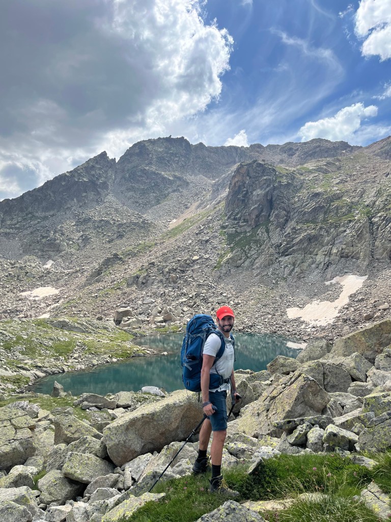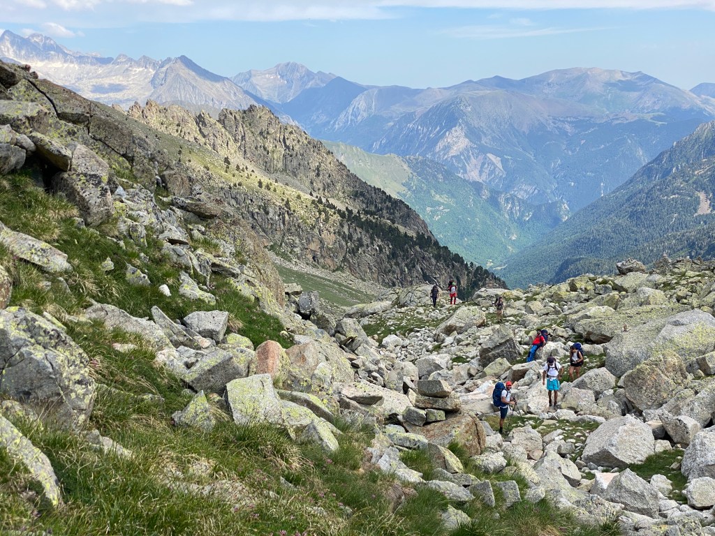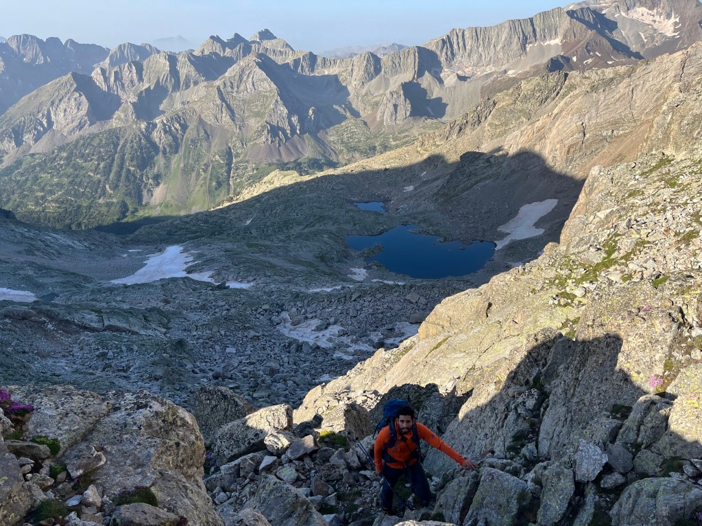 Nuevamente coordinando un grupo del Club Alpino Barcelona, volví a uno de los mejores emplazamientos de vivac del Pirineo, el Ibón de Gías. En 2021 habíamos estado aquí para subir a los sencillos Picos de Clarabide, La visión del poderoso Gourgs Blancs nos puso los dientes largos, y menos de un año después regresamos para apurar la tarea pendiente. Nuevamente el plan era de dos días, y así el Sábado 2 de Julio repetimos la larga caminata desde el aparcamiento de Estós al Refugio, y de ahí la masacrante subida al Ibón de Gías con toda la impedimenta de vivac a cuestas. Dos diferencias importantes respecto al año anterior: una, que siendo inicio de estación, los torrentes bajaban impetuosos, el Ibón Bajo de Gías tenía agua y los bosques vestían un verde rabioso; dos, que el Refugio de Estós bullía de vida, en marcado contraste con el ambiente zombi de 2021, consecuencia del circo grotesco montado por nuestros políticos a cuenta del Covid. Ya decía Aristófanes hace 2400 años que las cualidades necesarias para convertirse en gobernante en una democracia eran dos, ser un ignorante y un granuja. Y hemos comprobado que la gran mayoria de nuestros próceres las poseen generosamente, lo unicó que varía de uno a otro es el porcentaje de estulticia y el de corrupción. Pero me estoy yendo del tema… Decíamos que el 2 de Julio repetimos la larga marcha hacia el Ibón de Gías…