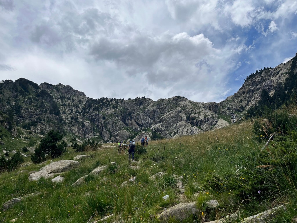 Llegamos al refugio a las dos y cuarto y nos detenemos durante una hora. Encontramos a un grupo que sube a Clarabide al tiempo que nosotros, lo que visto la hora nos sorprende. ¿Querrán vivaquear también en el Ibón de Gías? Después ya veríamos que no era el caso… La pendiente subida desde el refugio al ibón fue «dulcificada» por las nubes que nos protegieron del excesivo calor en una zona muy expuesta, así como por el sonido de las aguas del Torrente de Oô durante el primer tramo.