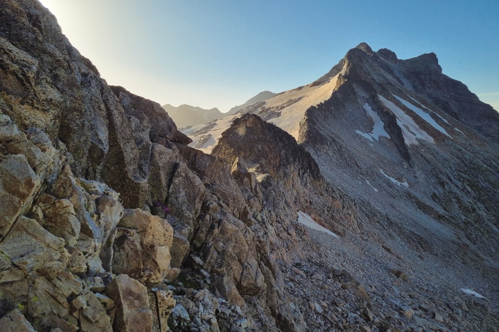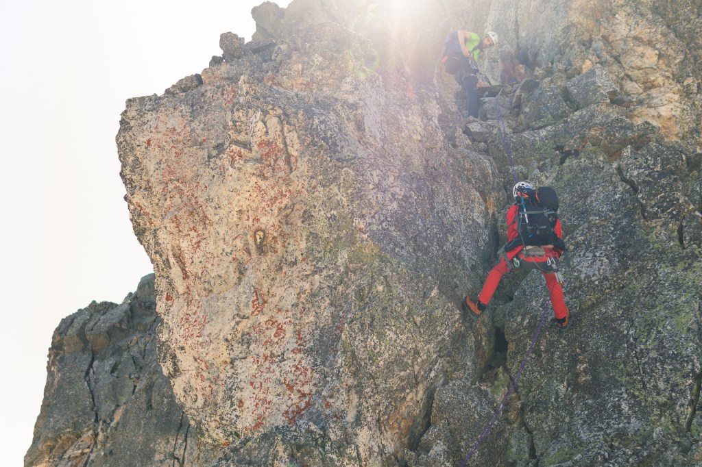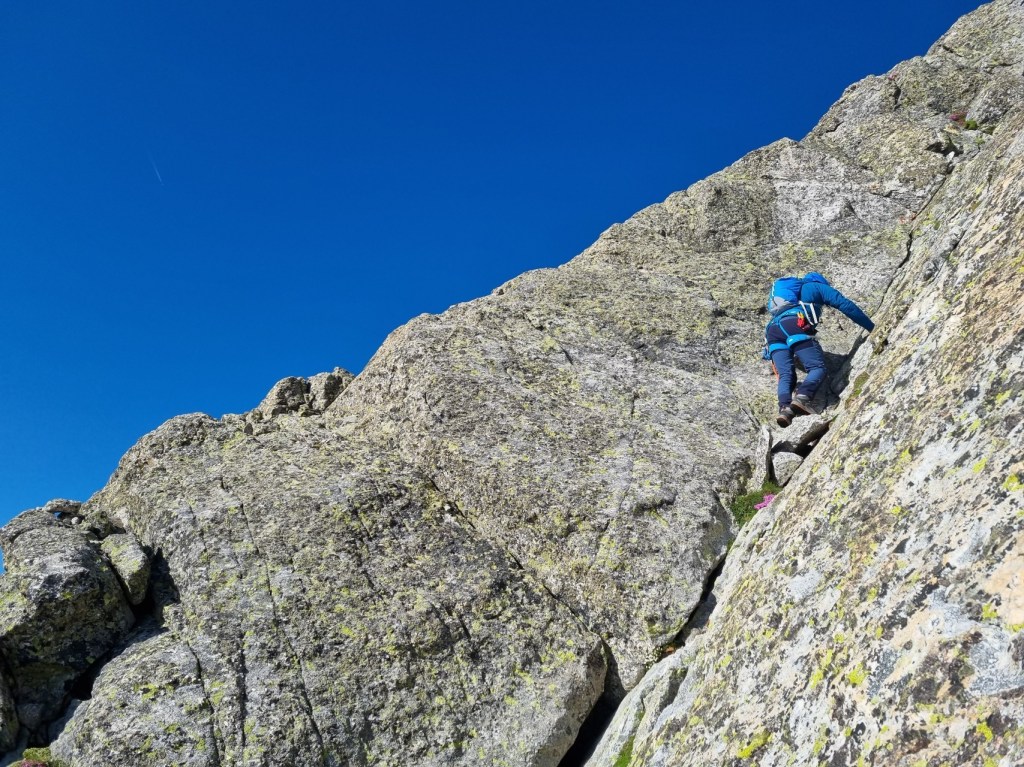 La roca sigue agarrando perfectamente, la exposición impone respeto y una vez en la cresta hay que hacer alguna fácil acrobacia, pero no pasa nada, ya estamos casi en la estrecha y escénica cumbre del Jean Arlaud.