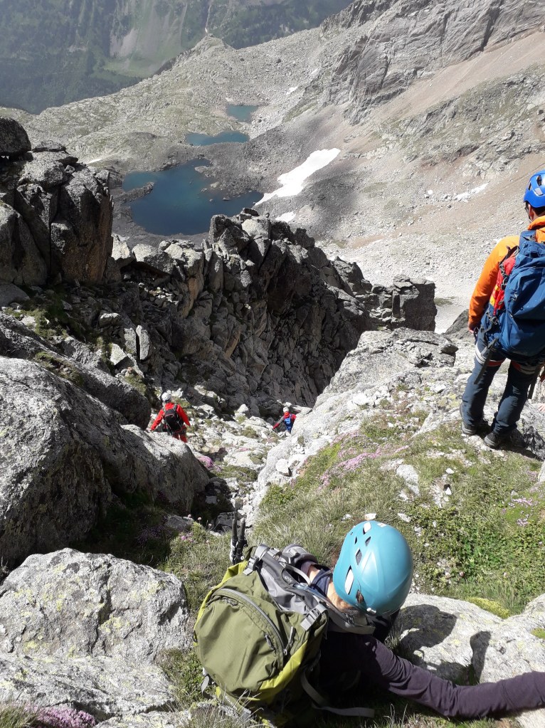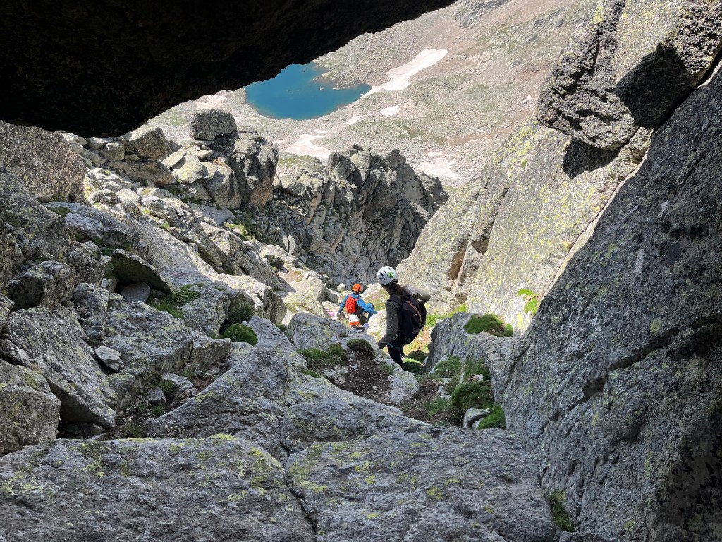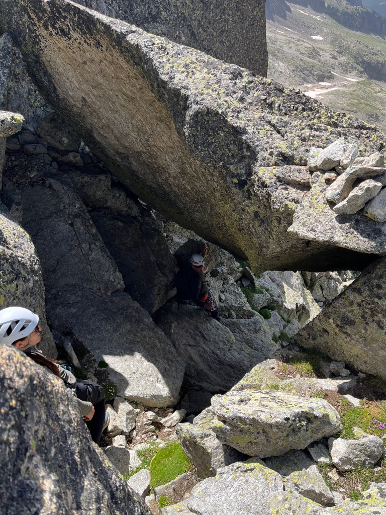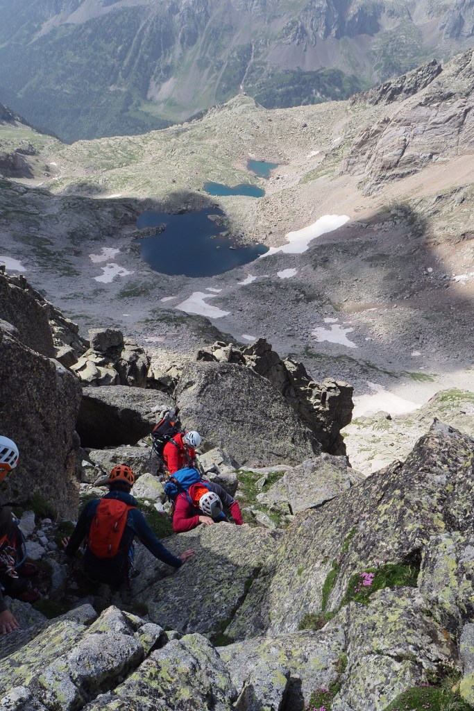 Desde la repisa vamos contorneando la cara oeste del pico para ir a buscar el segundo y más largo destrepe, que nos depositaría en la brecha del Jean Arlaud. Desde aquí arriba no parece tan difícil, puede ser un II+/III-. Según va llegando la gente, muchos se animan a destreparlo, con precaución se hace sin problemas. La instalación de rápel, un cordino que rodea una gran roca, se encuentra unos pasos más arriba, y visto que hay alguien que está sufriendo más de lo debido en escaladas y desescaladas, ahora sí que saco la cuerda y montamos el rápel,