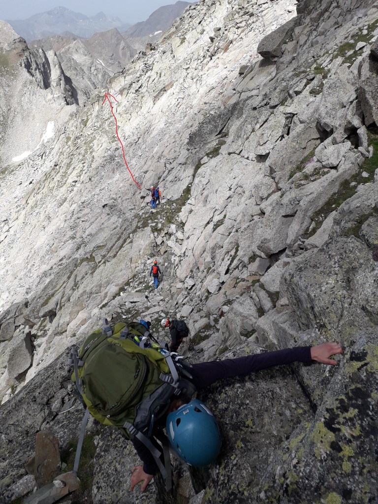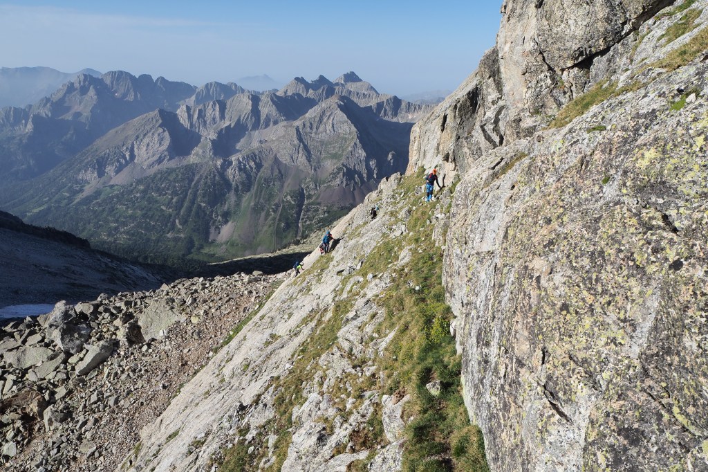 Llega un momento en el que el camino principal sigue bajando por el canal que estamos siguiendo, pero una traza parece desprenderse hacia la derecha. A los pocos metros se alcanza una estrecha vira muy expuesta, inclinada sobre una profunda vaguada pedregosa, y que unos 50 m más allá alcanza una arista sobre la que diviso lo que podría ser un hito. ¿Será ésta la vía de acceso a la Torre Armengaud? Decido no seguir por ahí, lo encuentro arriesgado, sobre todo yendo con un grupo numeroso. Así que hacia abajo todo recto. Pronto alcanzamos un característico paso bajo una roca suspendida. Un aparatoso hito sobre ella nos indica que vamos por buen camino. Cabe preguntarse, ¿buen camino hacia dónde? En el peor de los casos estaremos siguiendo la vía «de escape», perdiéndonos la vía hacia los tresmiles secundarios de la cresta.