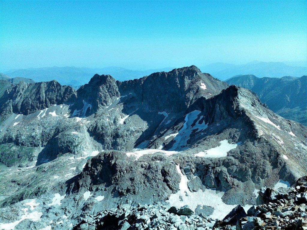 El día da gusto, sin apenas rastro de nubes, excelente visibilidad y temperaturas agradables. Aún divisamos abundantes neveros en este inicio de verano, aunque es inevitable pensar que a los pies de esta montaña, hasta hace bien poco, existían glaciares propiamente dichos, y cuya desaparición, aquí como en muchos otros lugares, afea las montañas y las hace más peligrosas.