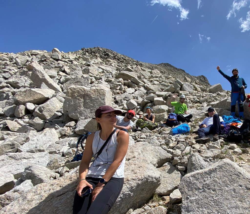 Nos ponemos en marcha con presteza y rápidamente llegamos hasta el collado, donde el buen sendero, ya viejo conocido, nos devolverá a nuestro vivac. En la parte alta hay tramos de mucha gravilla suelta que obliga a hacer equilibrios. Marie baja lanzada, estilo cabra pirenaica…