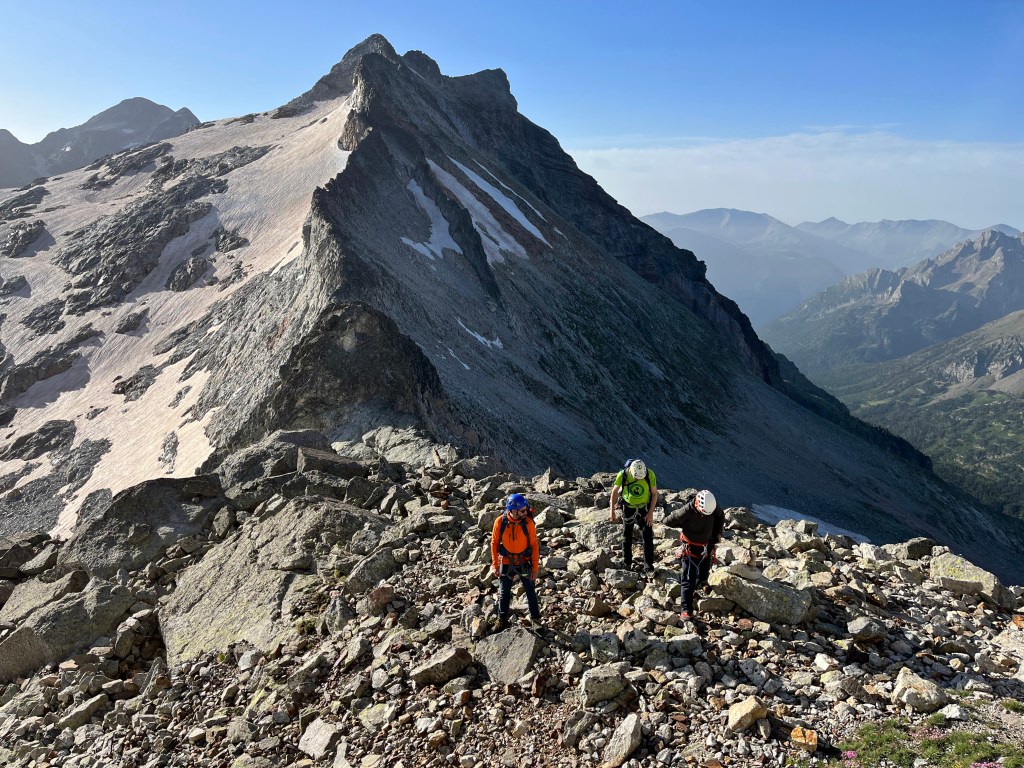 La roca cambia y el buen granito del Jean Arlaud se va entremezclando con esquistos poco consistentes, de tonos marrones y rojizos, durante la subida al Gourgs Blancs. La única complicación que encontramos se limita a tramos de cierta exposicion, sin tener apenas que apoyar manos. Son sólo unos 100 m de desnivel que una vez salvados nos depositan en la airosa cima del Gourgs Blancs (3129 m), con su cruz y placa conmemorativa de Jean Arlaud. Son las diez y media. Objetivo conseguido!