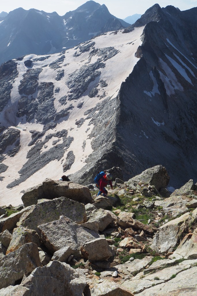 Permanecemos media hora en la cumbre y emprendemos lo que esperábamos que fuera un corto descenso antes de coronar los dos tresmiles secundarios de la cresta occidental del Gourgs Blancs, la Torre Armengaud y la Punta Lourde-Rocheblave. Habíamos leído varias reseñas que avisaban de la facilidad de desorientarse y acabar metidos en marrones. La cresta integral requiere escalada auténtica, luego era imperativo comenzar a descender para bordear las dificultades entre la antecima W y la Armengaud antes de desviarse a la derecha y regresar a la cresta. Ignorando un primer corredor a nuestra izquierda alcanzamos la mencionada antecima y localizamos una traza hitada que baja con decisión por una canal más o menos ancha.