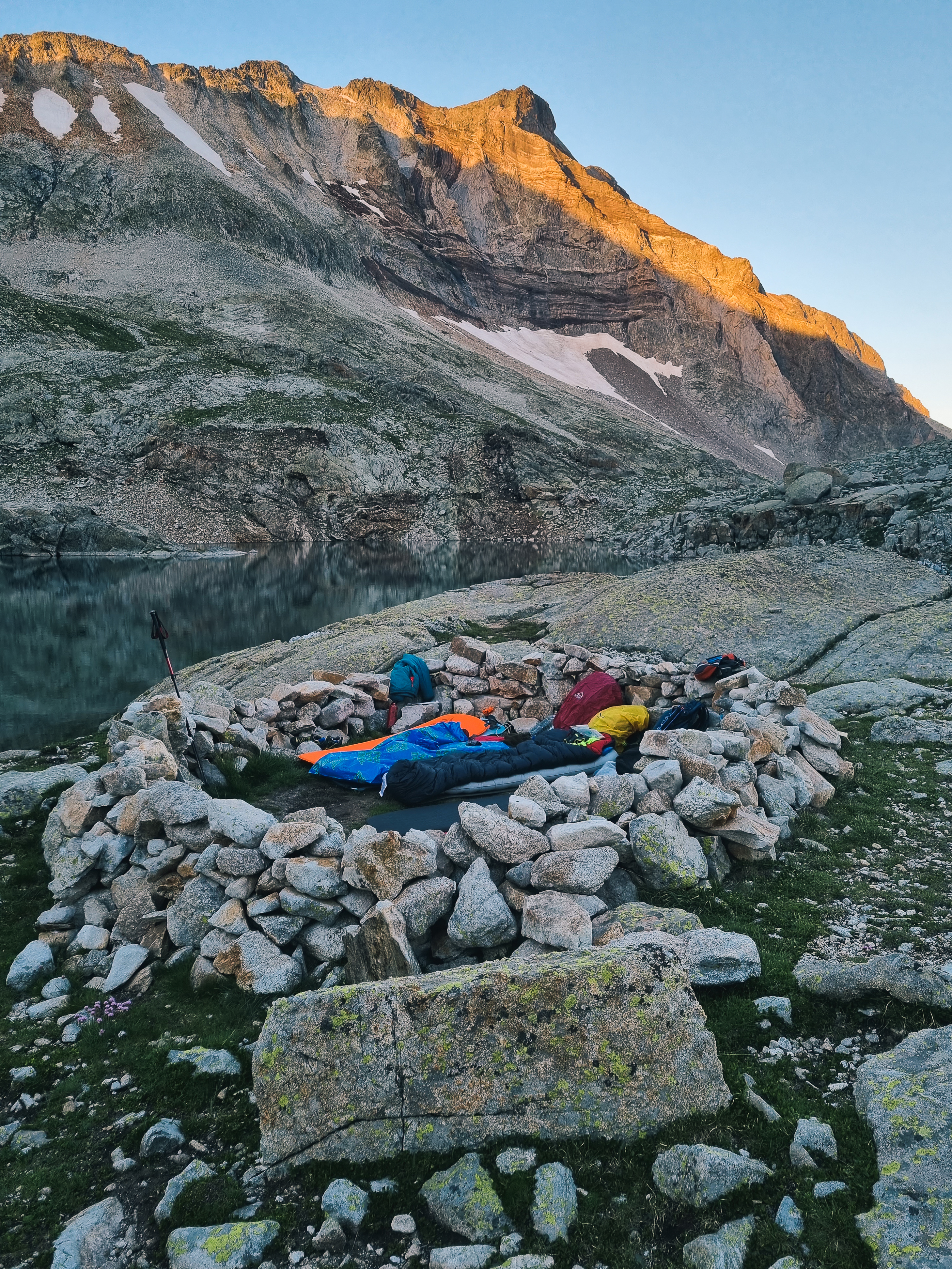 Finalmente alcanzo el ansiado y ya conocido lago superior de Gías poco antes de las cinco y media, un alivio visto que mi estómago todavía sigue inquieto y destemplado. A lo largo de esa tarde iría volviendo al orden sin mayores complicaciones. Encontramos casi todos los vivacs disponibles, salvo el que ocupan otras dos personas y su perro. Acabamos decidiéndonos por los de la orilla occidental del lago, a ras de agua. El año pasado teníamos mejores vistas pero nos tocaba caminar para abastecernos de liquido.