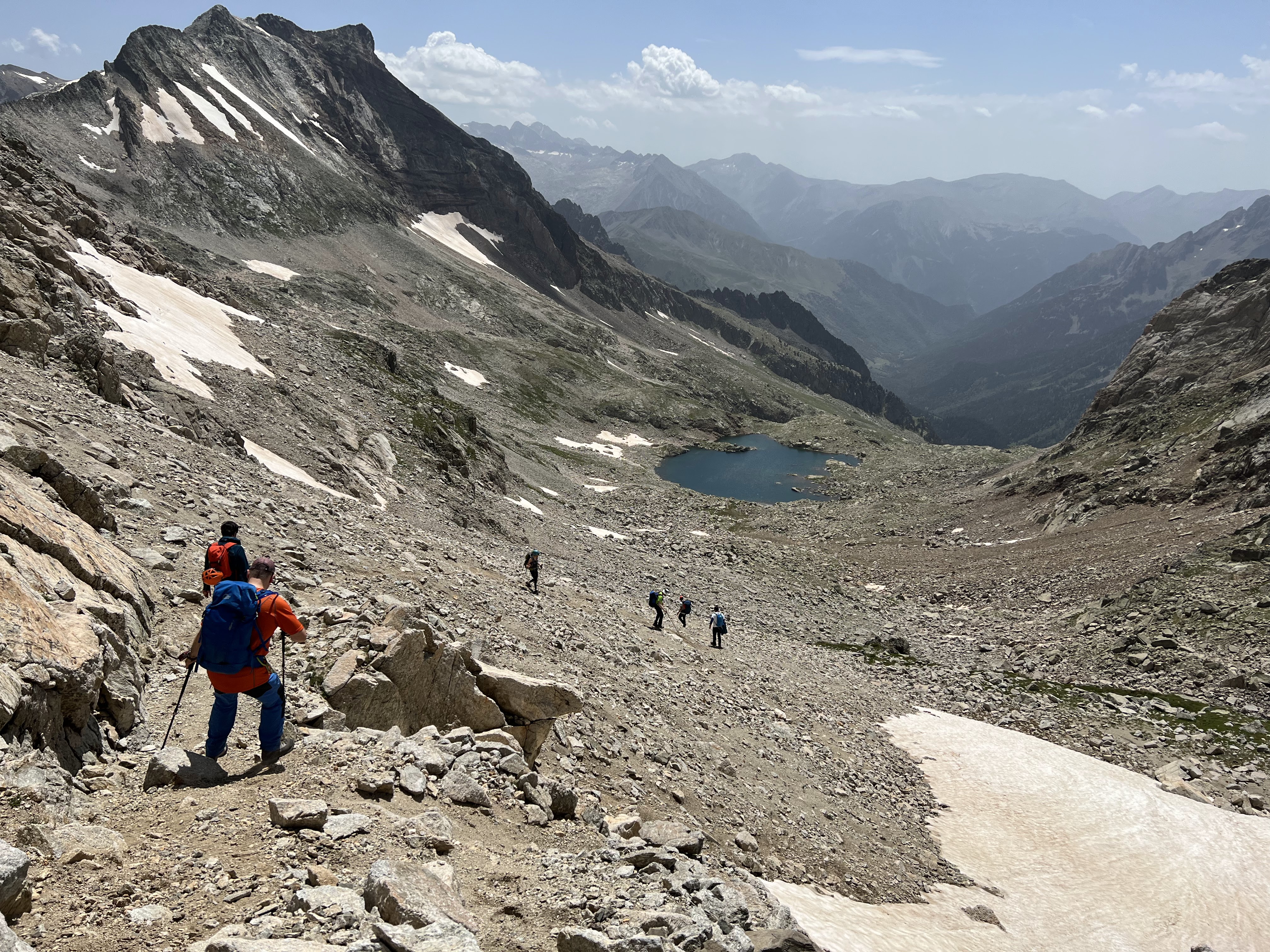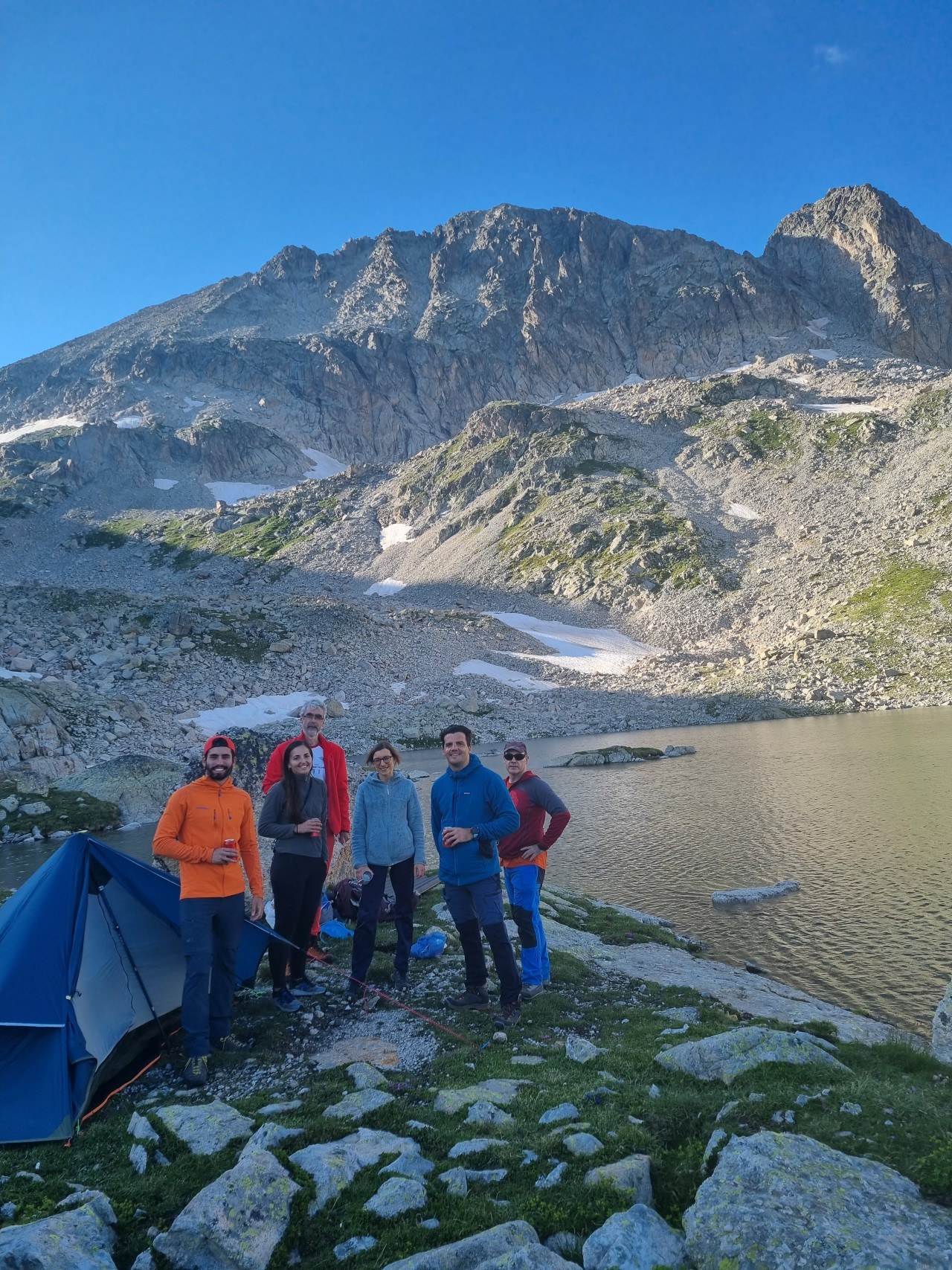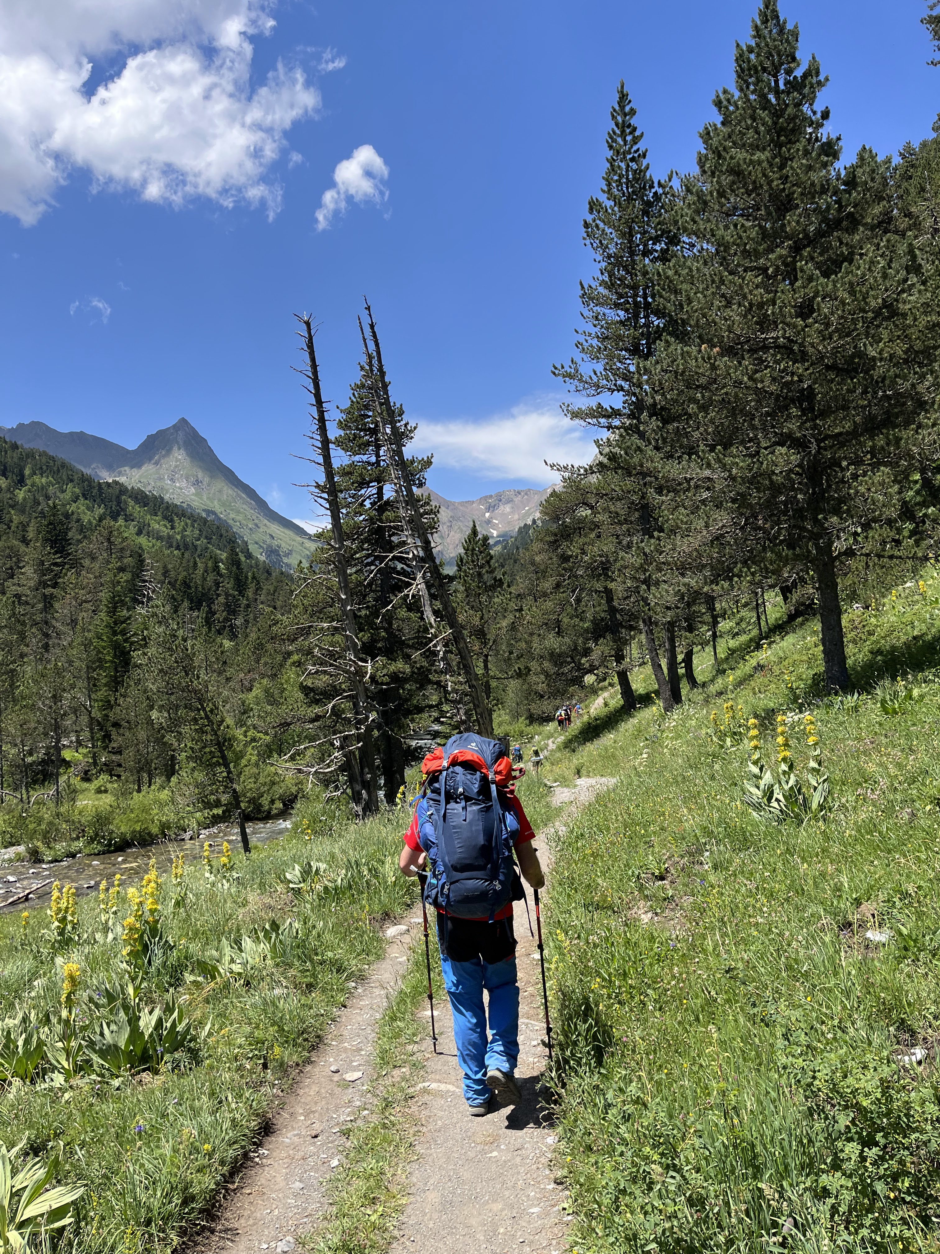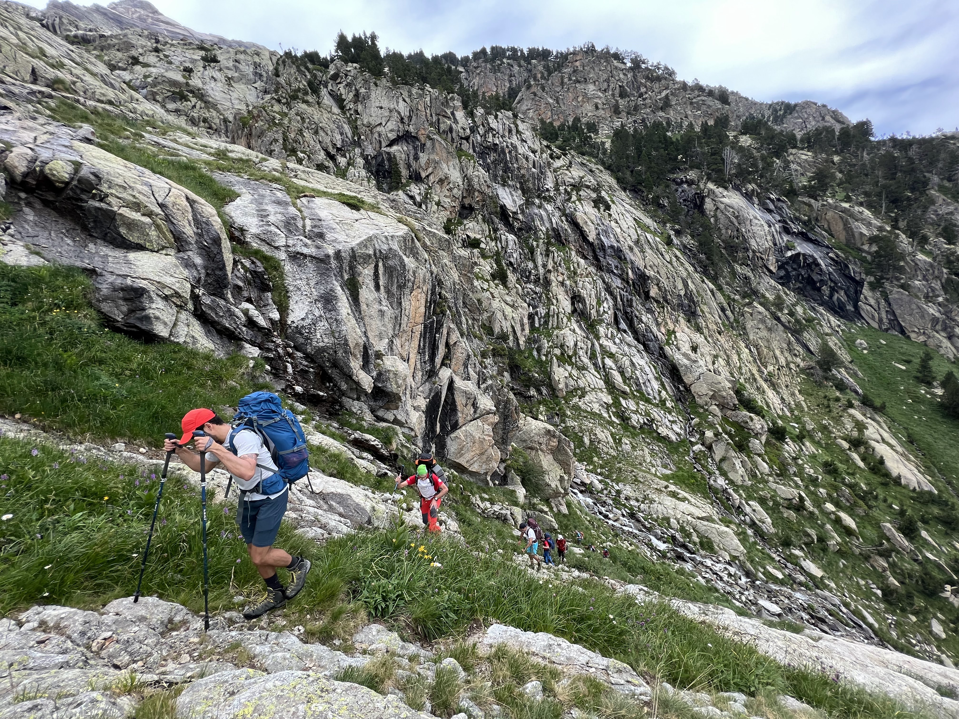 Nuevamente coordinando un grupo del Club Alpino Barcelona, volví a uno de los mejores emplazamientos de vivac del Pirineo, el Ibón de Gías. En 2021 habíamos estado aquí para subir a los sencillos Picos de Clarabide, La visión del poderoso Gourgs Blancs nos puso los dientes largos, y menos de un año después regresamos para apurar la tarea pendiente. Nuevamente el plan era de dos días, y así el Sábado 2 de Julio repetimos la larga caminata desde el aparcamiento de Estós al Refugio, y de ahí la masacrante subida al Ibón de Gías con toda la impedimenta de vivac a cuestas. Dos diferencias importantes respecto al año anterior: una, que siendo inicio de estación, los torrentes bajaban impetuosos, el Ibón Bajo de Gías tenía agua y los bosques vestían un verde rabioso; dos, que el Refugio de Estós bullía de vida, en marcado contraste con el ambiente zombi de 2021, consecuencia del circo grotesco montado por nuestros políticos a cuenta del Covid. Ya decía Aristófanes hace 2400 años que las cualidades necesarias para convertirse en gobernante en una democracia eran dos, ser un ignorante y un granuja. Y hemos comprobado que la gran mayoria de nuestros próceres las poseen generosamente, lo unicó que varía de uno a otro es el porcentaje de estulticia y el de corrupción. Pero me estoy yendo del tema… Decíamos que el 2 de Julio repetimos la larga marcha hacia el Ibón de Gías…
