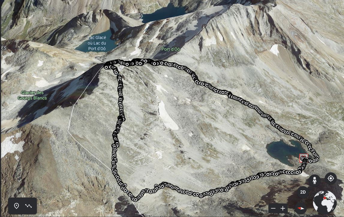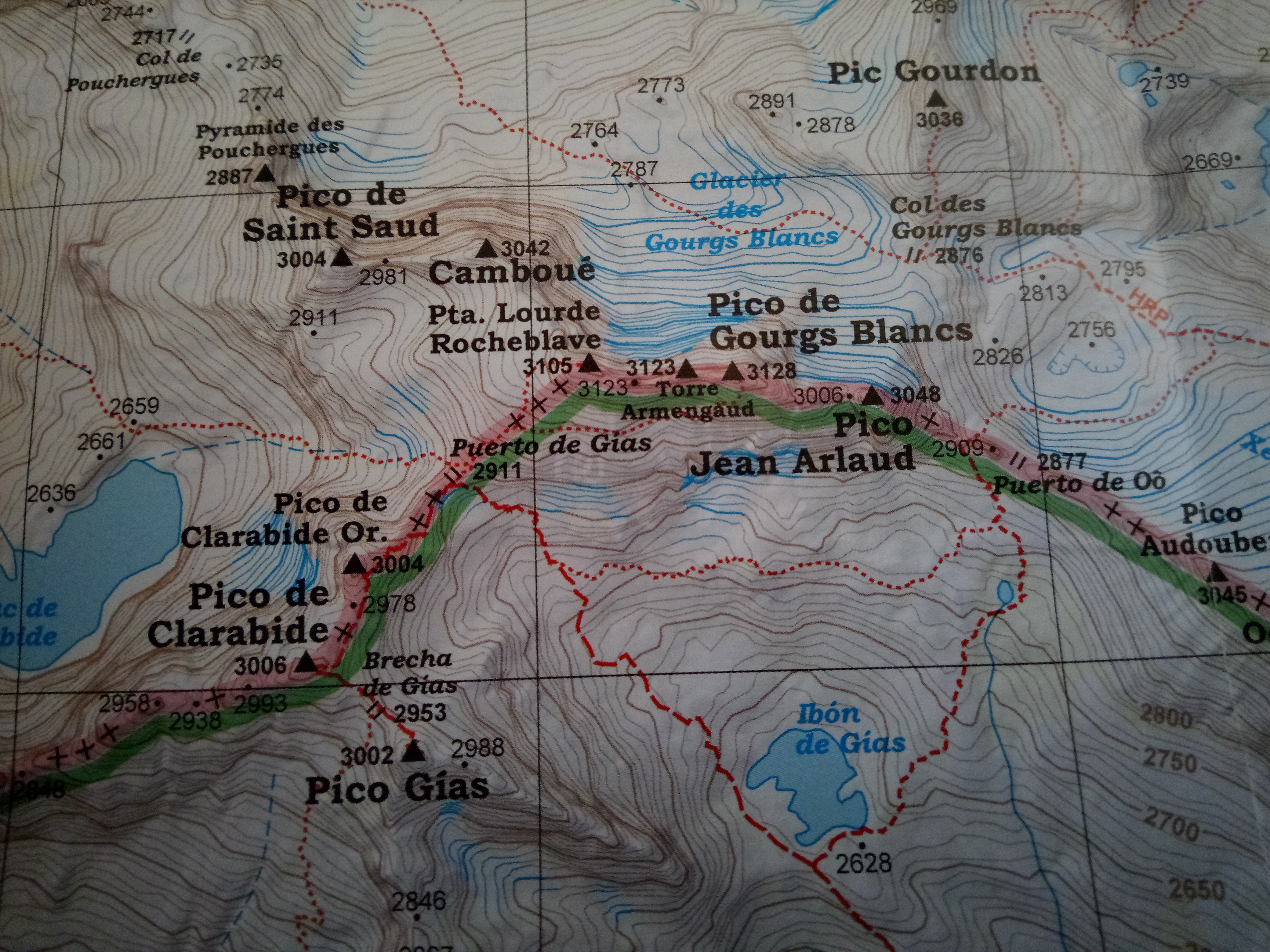 Llego a lo más alto a las nueve en punto. La nueva topografía aragonesa nombra este pico como Tuca de O, pero casi todos lo conocen como Pico Jean Arlaud, bautizado en homenaje a uno de los padres del pirineísmo y pionero del himalayismo francés, fallecido en la cresta del Gourgs Blancs en 1938. Desde los 3065 m de su cima el paisaje se encuentra dominado por el Gourgs Blancs, ahí mismo, a pocos cientos de metros a vuelo de pájaro, mostrando una silueta piramidal característica, tan distinta a la que exhibe desde el lago del Gías, el punto más alto y poco marcado de una larga muralla erizada de bloques. Hacia el Norte y el Oeste se aprecian cercanos los tresmiles Belloc y Spijeoles sobre los pequeños lagos de Isclots. Hacia el sur, el Posets y sus 3375 m dominan el horizonte.