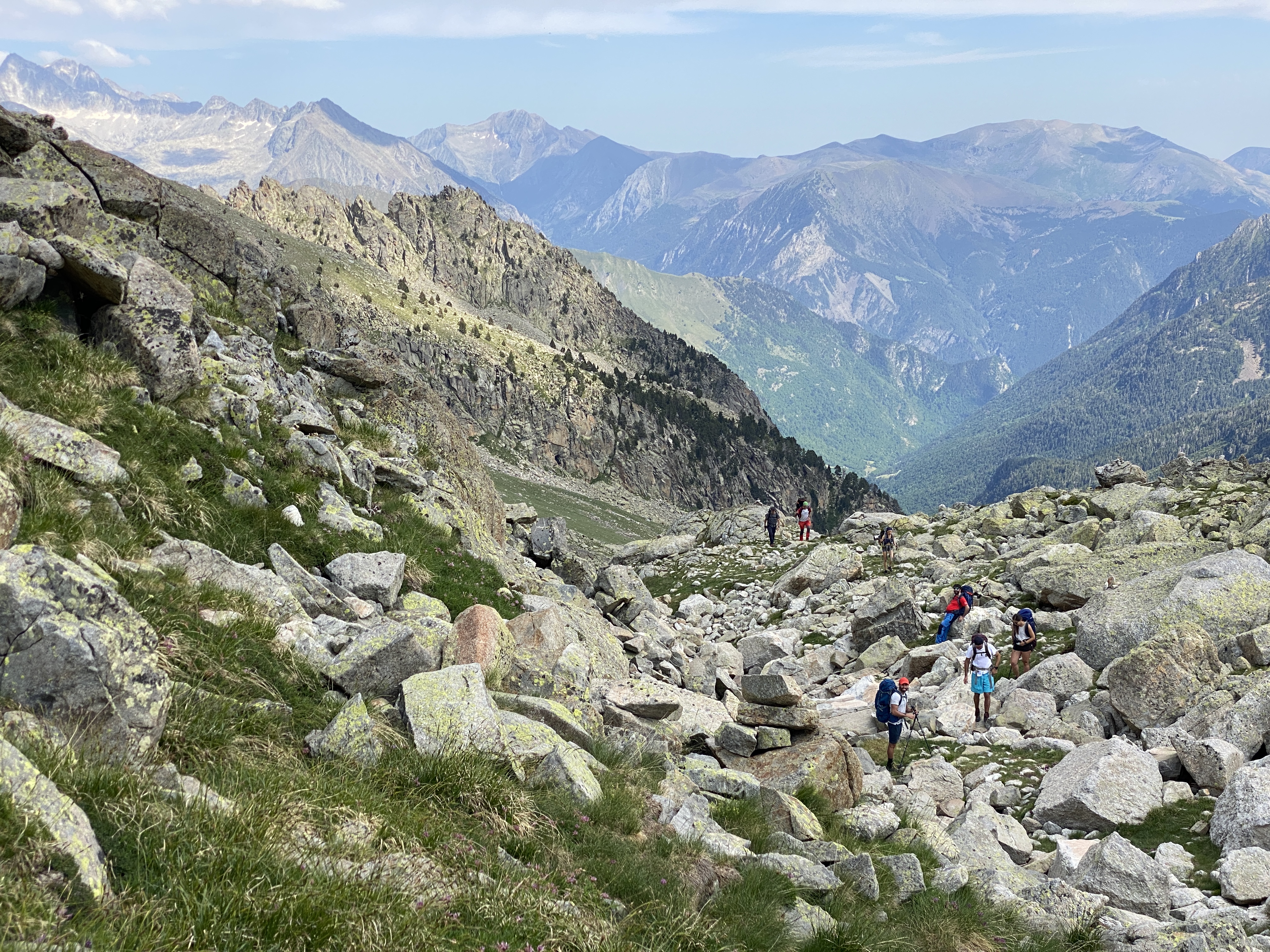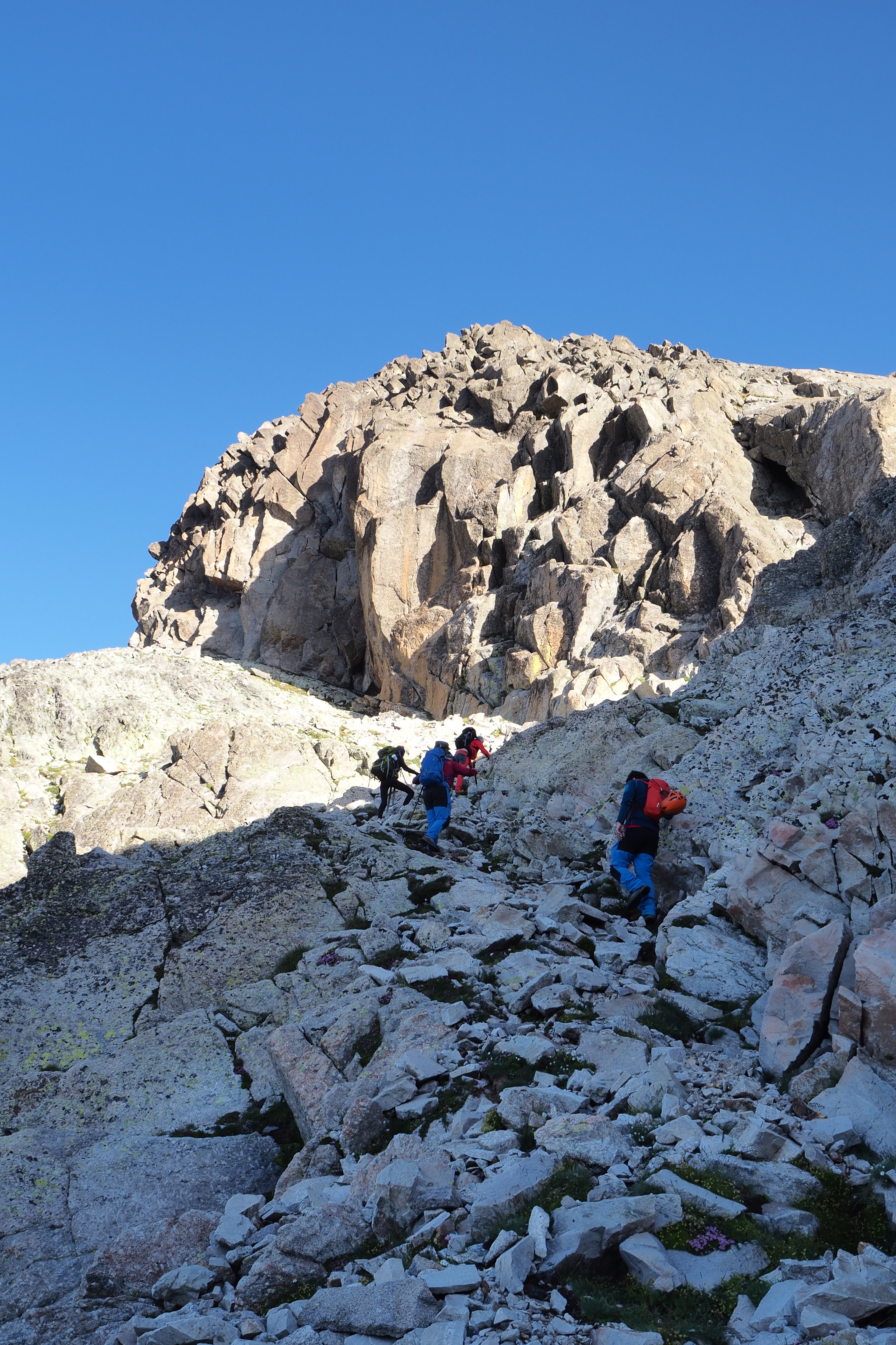 Nos ponemos en marcha con presteza y rápidamente llegamos hasta el collado, donde el buen sendero, ya viejo conocido, nos devolverá a nuestro vivac. En la parte alta hay tramos de mucha gravilla suelta que obliga a hacer equilibrios. Marie baja lanzada, estilo cabra pirenaica…