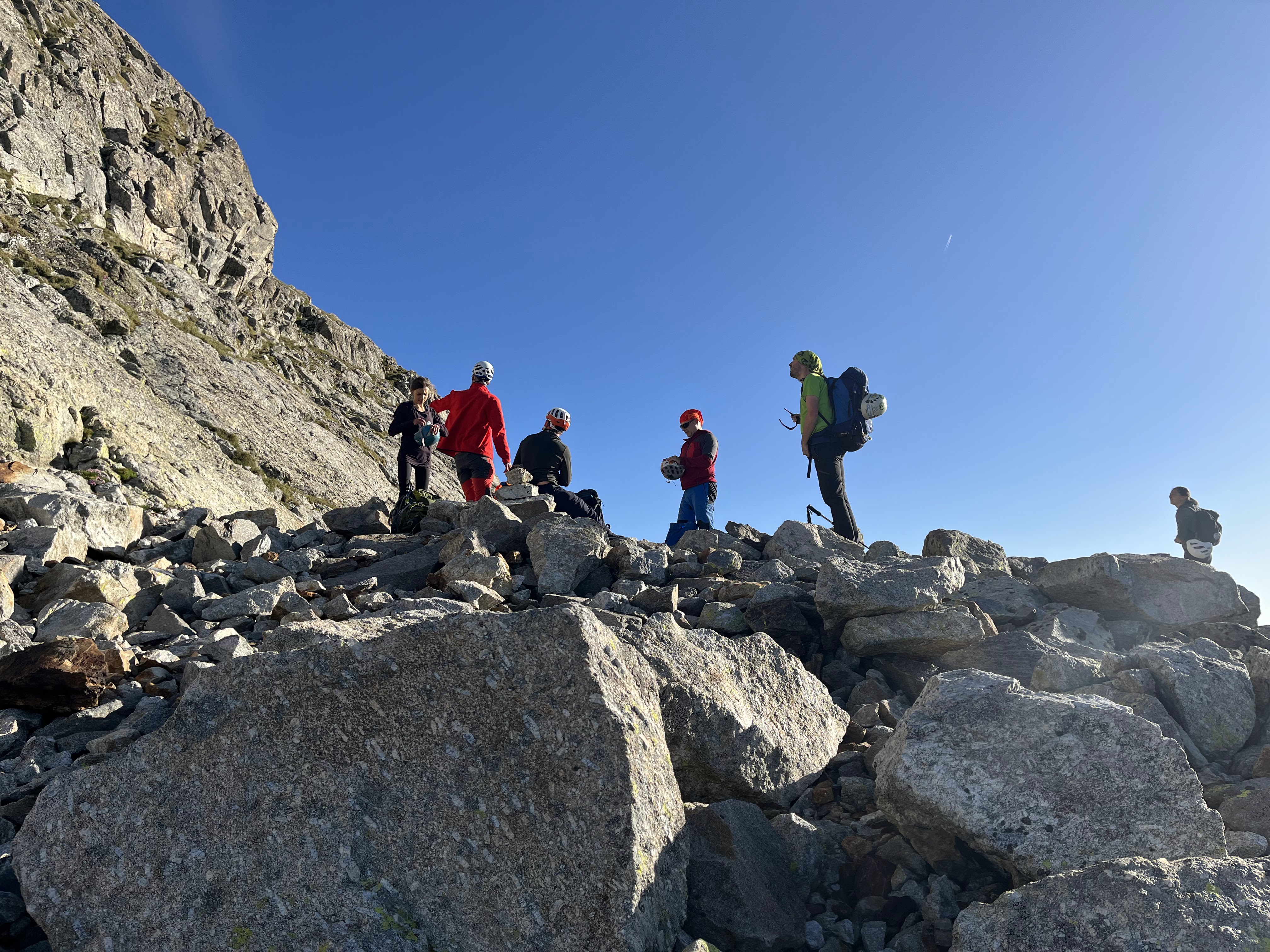No nos demoramos mucho en cumbre, que nos quedan muchos kilómetros por delante…Comenzamos a bajar por la vertiente occidental, totalmente en sombra, por terreno pedregoso, yendo a buscar el reborde sur del espolón, y luego girando a derecha. Hay un salto de II que tenemos que encontrar y es aquí donde empezamos a liarnos. Hay quien sigue la traza hasta el final, completando otro giro de 90º hacia la derecha y acabando por asomarse a los abismos de la vertiente norte. A mí me parece localizar una repisa unos cinco metros por debajo del sendero, a la altura del segundo giro a derechas. El descenso «a saco» se me antoja algo complicado, pero unos pocos metros más adelante encuentro una bajada lateral muy cómoda, que sólo exige un paso largo al final. Efectivamente, hay una traza de sendero que sigue bajando hacia la derecha, es por aquí! Aviso a mis compañeros y les voy dando indicaciones para descender hasta donde yo me encuentro. La mayoría bajan frontalmente, no es tan difícil, pero hasta que todos lo consiguen pasa tiempo…