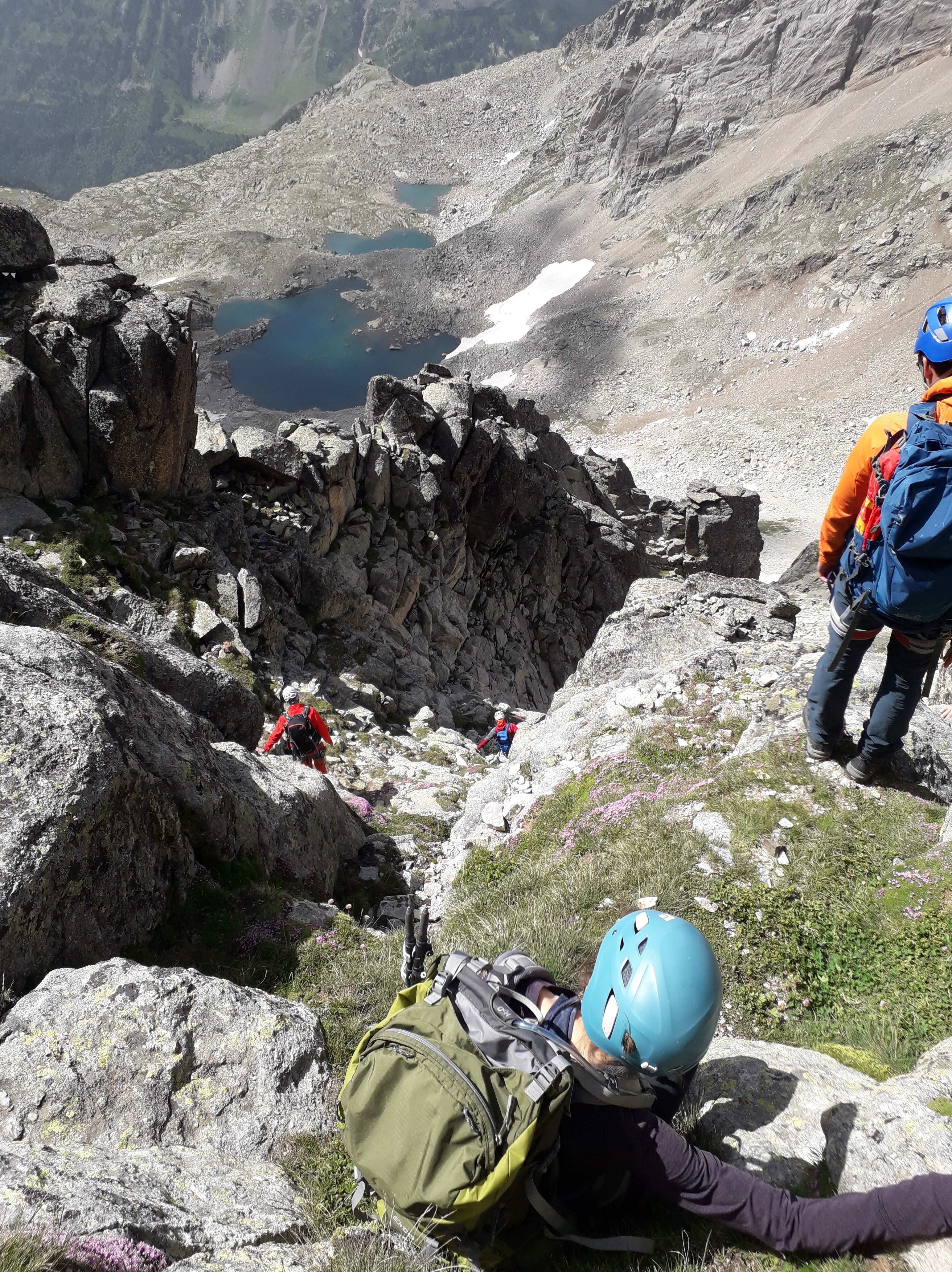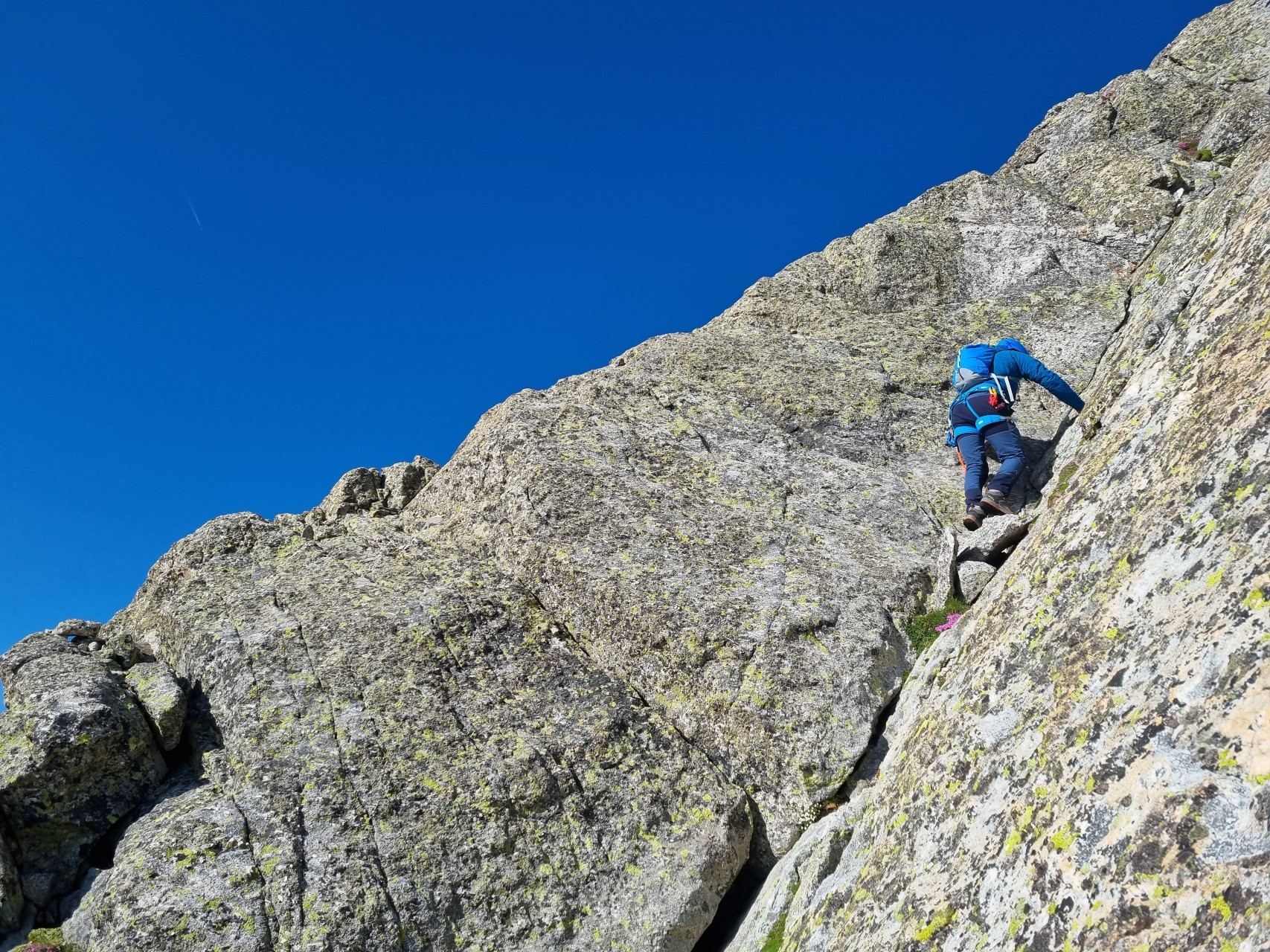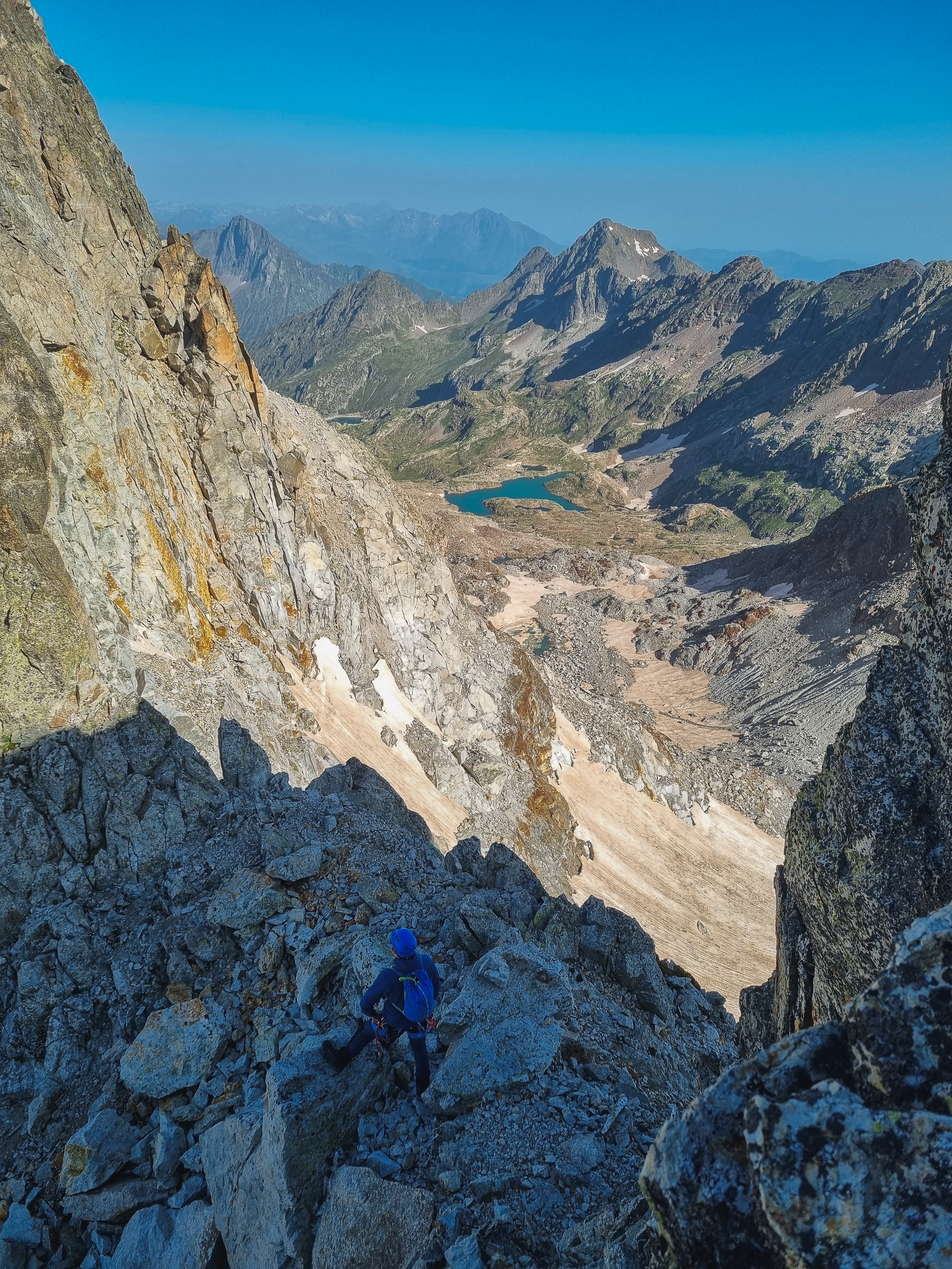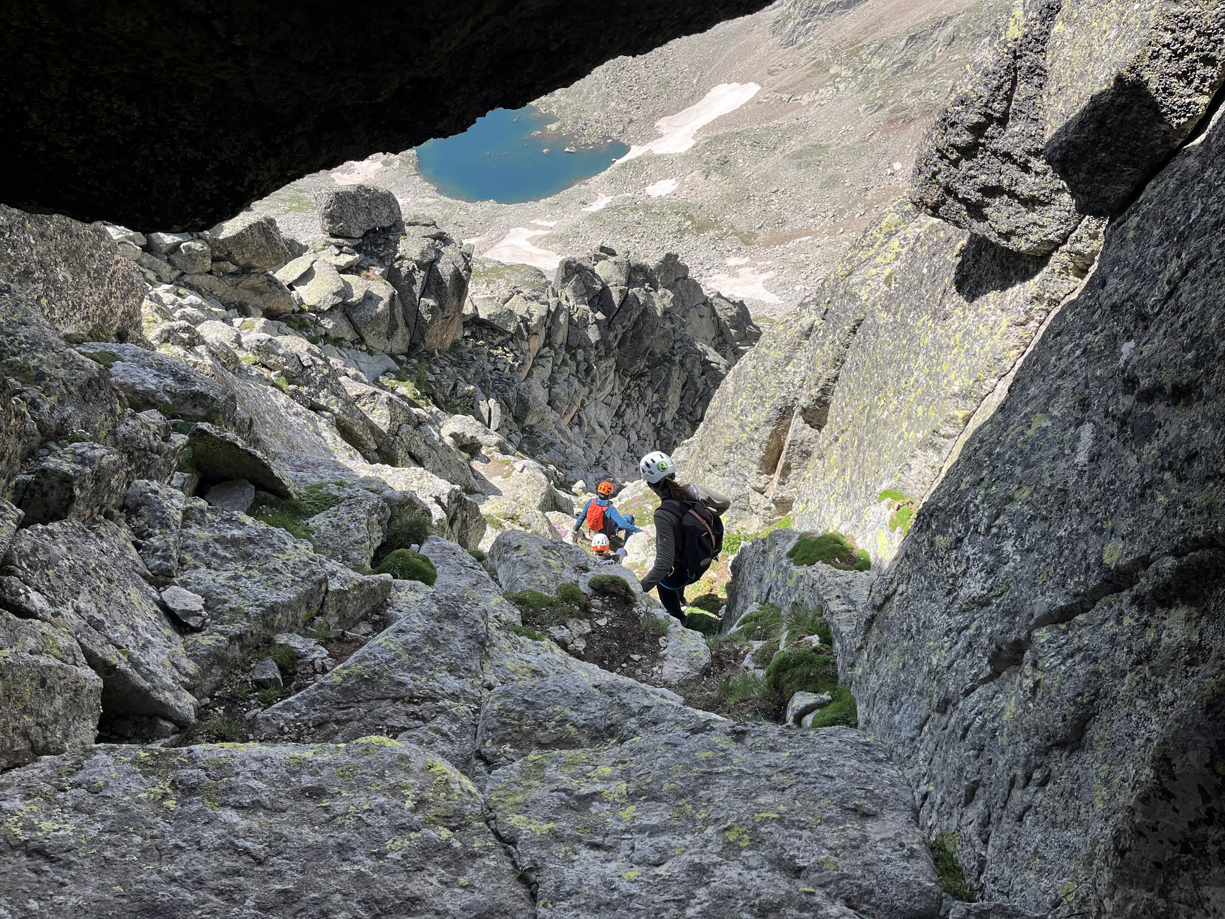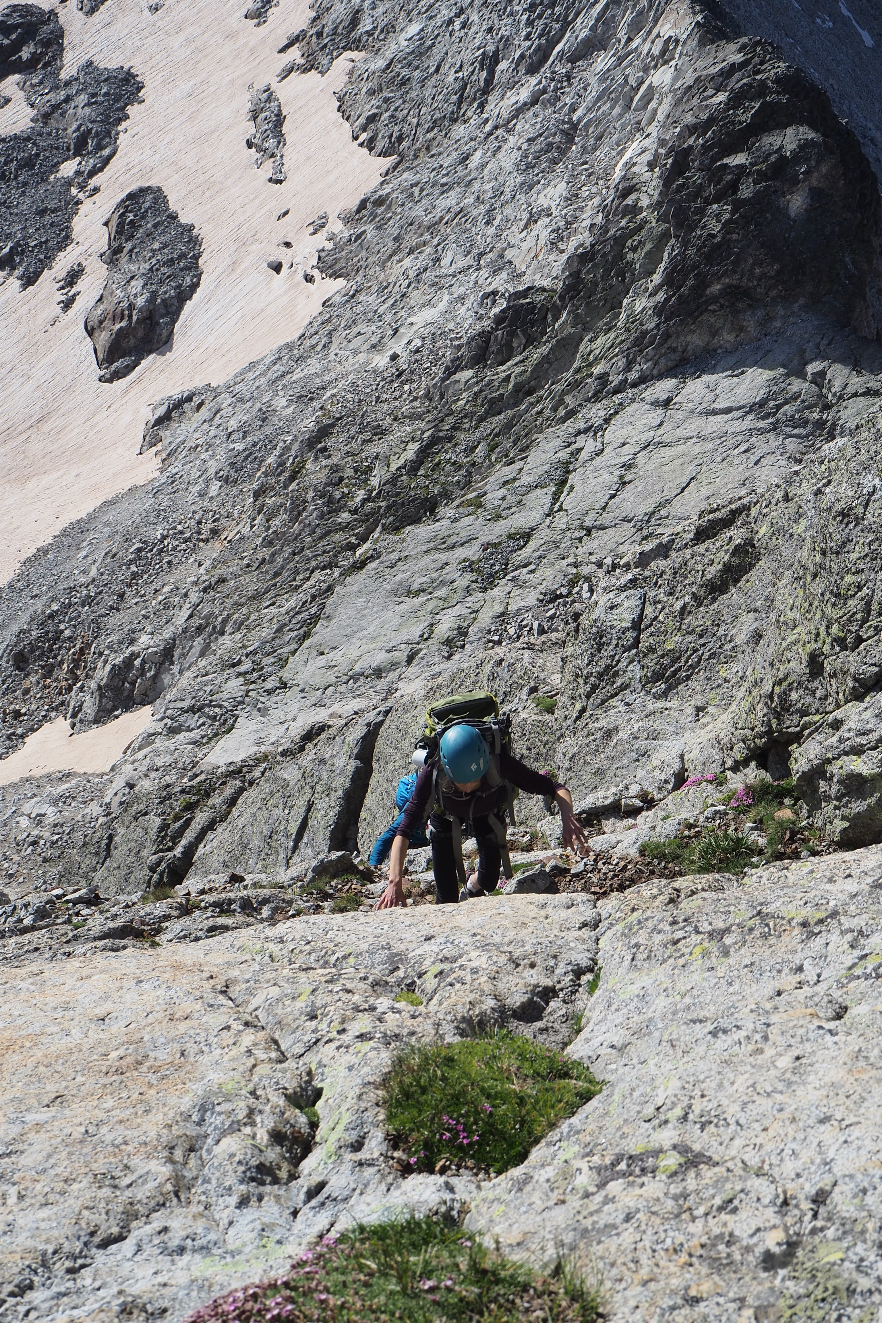 Algo de piedrilla suelta, penachos de hierba y buenos bloques de granito que obligan a destrepes sencillos. Progresamos bien, vigilando los hitos. A nuestra izquierda una cresta bien marcada delimita el corredor, a la derecha en cambio el vacío es notable.