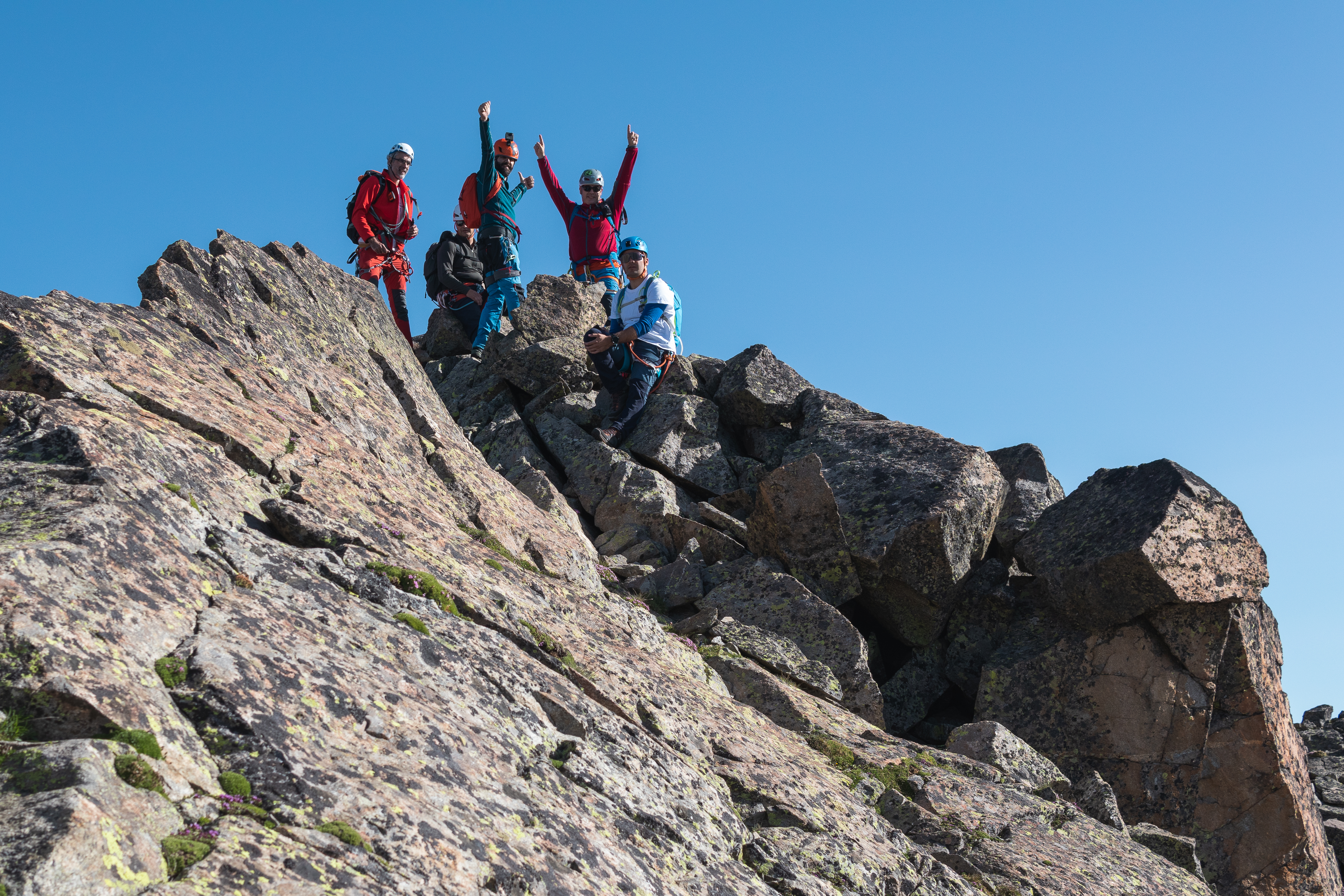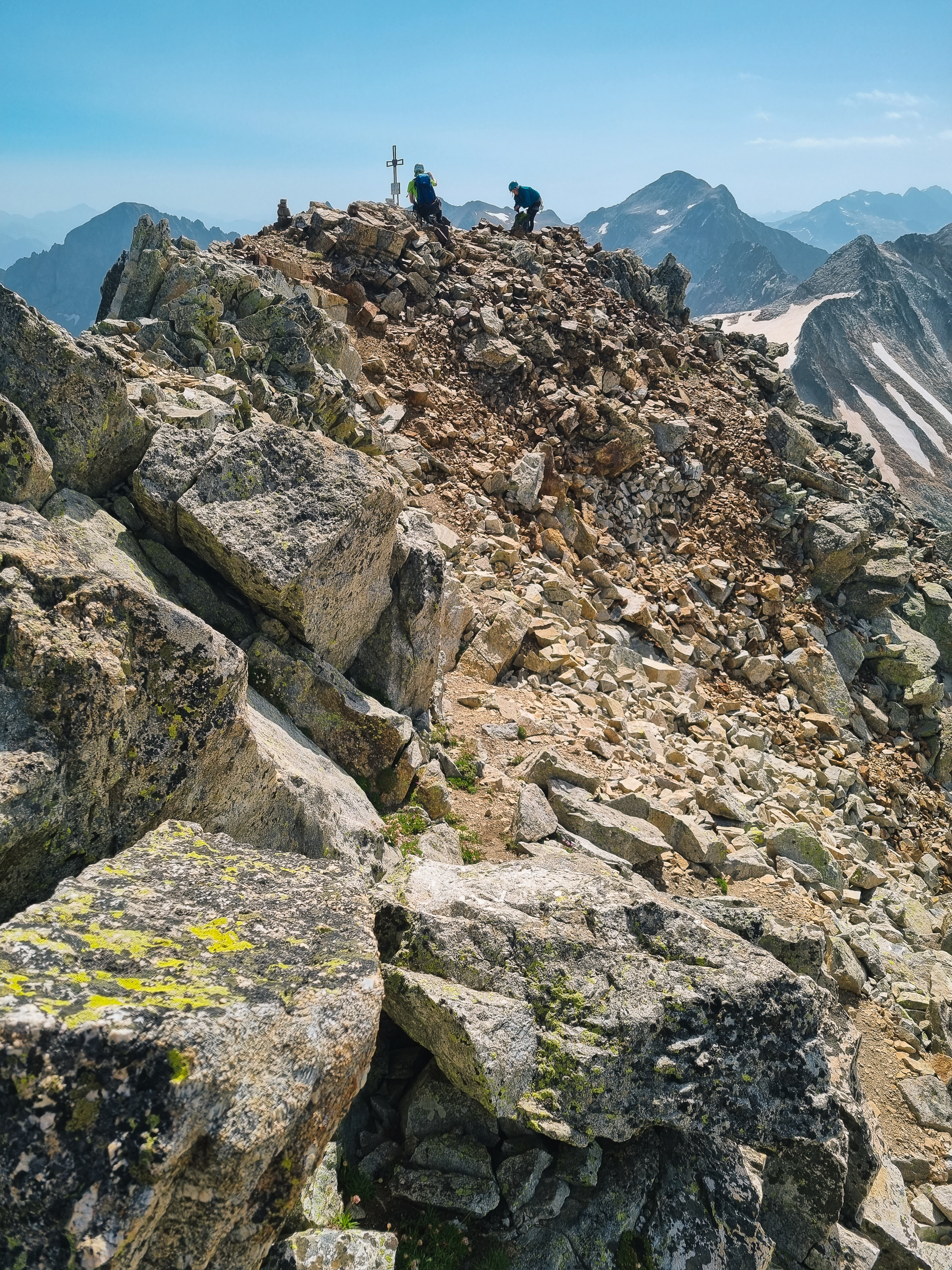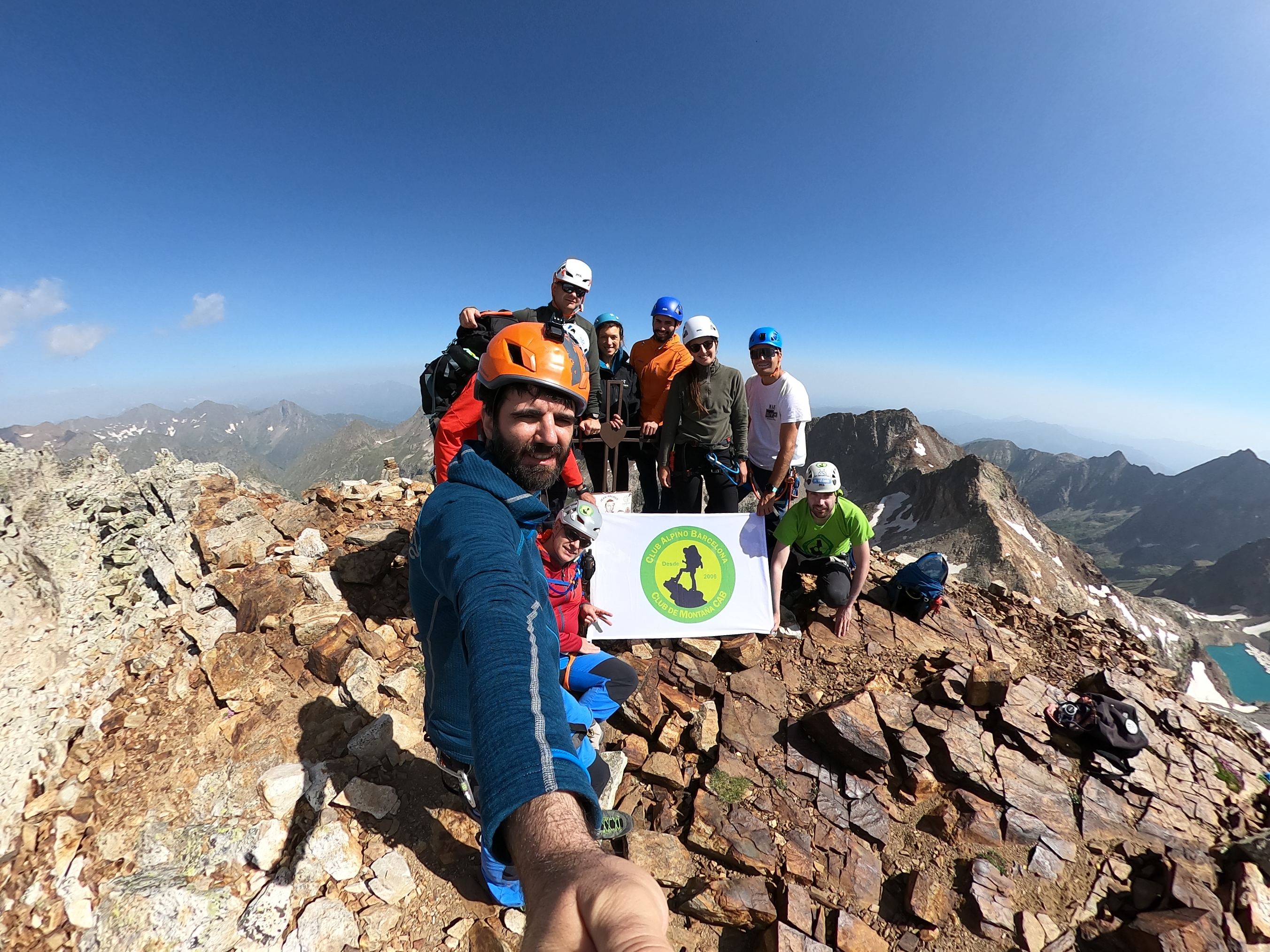 La roca cambia y el buen granito del Jean Arlaud se va entremezclando con esquistos poco consistentes, de tonos marrones y rojizos, durante la subida al Gourgs Blancs. La única complicación que encontramos se limita a tramos de cierta exposicion, sin tener apenas que apoyar manos. Son sólo unos 100 m de desnivel que una vez salvados nos depositan en la airosa cima del Gourgs Blancs (3129 m), con su cruz y placa conmemorativa de Jean Arlaud. Son las diez y media. Objetivo conseguido!