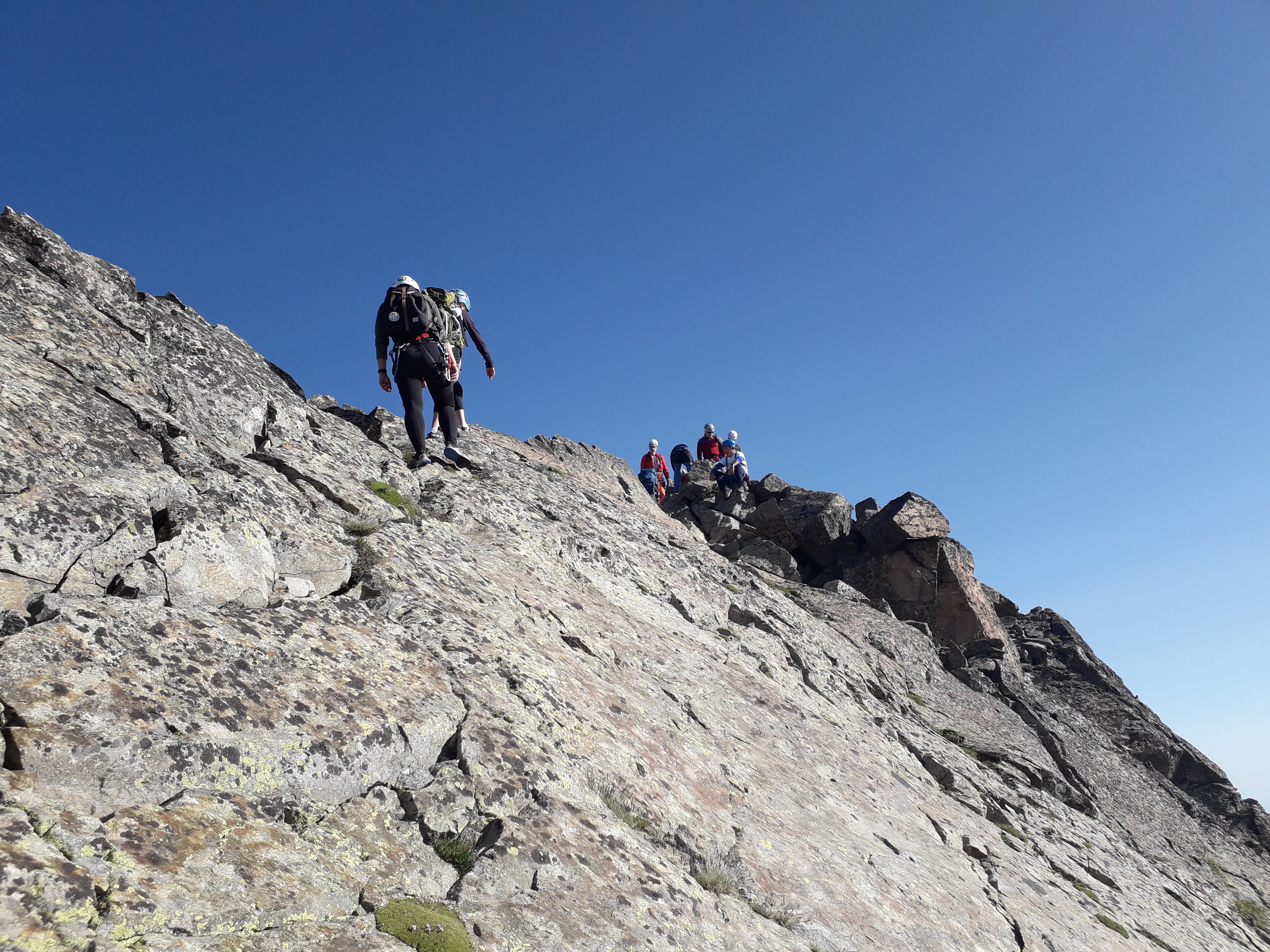 Un miembro del equipo tiene alguna dificultad en el último tramo, pero no es necesario sacar la cuerda. Una vez reunidos todos, prosigo hacia la izquierda, iniciando una travesía oblicua hacia el extremo meridional de la cresta somital. El primer tramo tiene su insidia, hay que superar longitudinamente una placa fisurada inclinada hacia el vacío. En alguna reseña la he visto cotada como III, en mi opinión no supera el II, pero hay que moverse con tiento. Después, algunos hitos nos van guiando por trazas de sendero y terreno sin complicaciones, más allá de algo de piedra suelta y el patio a nuestra izquierda…