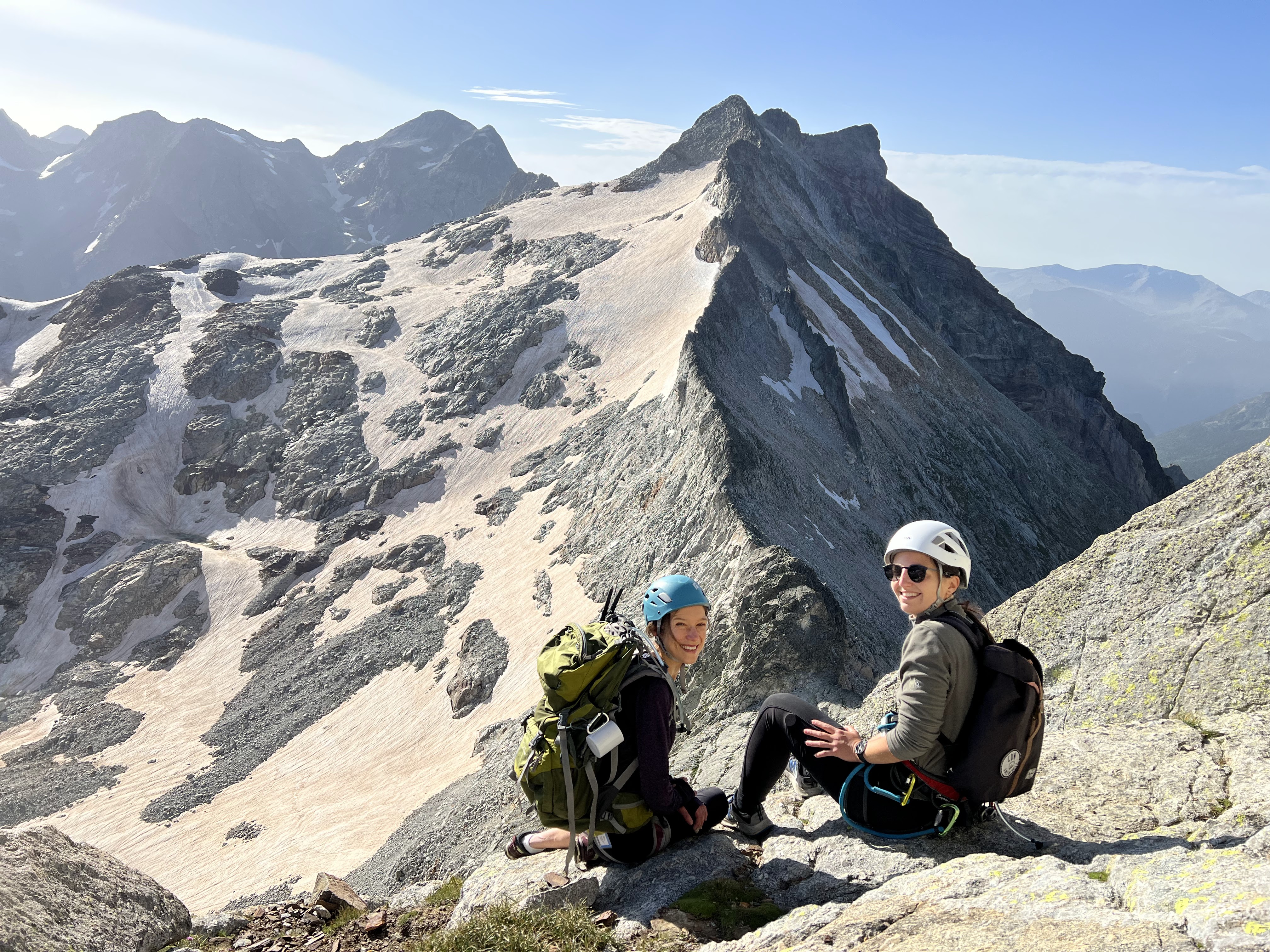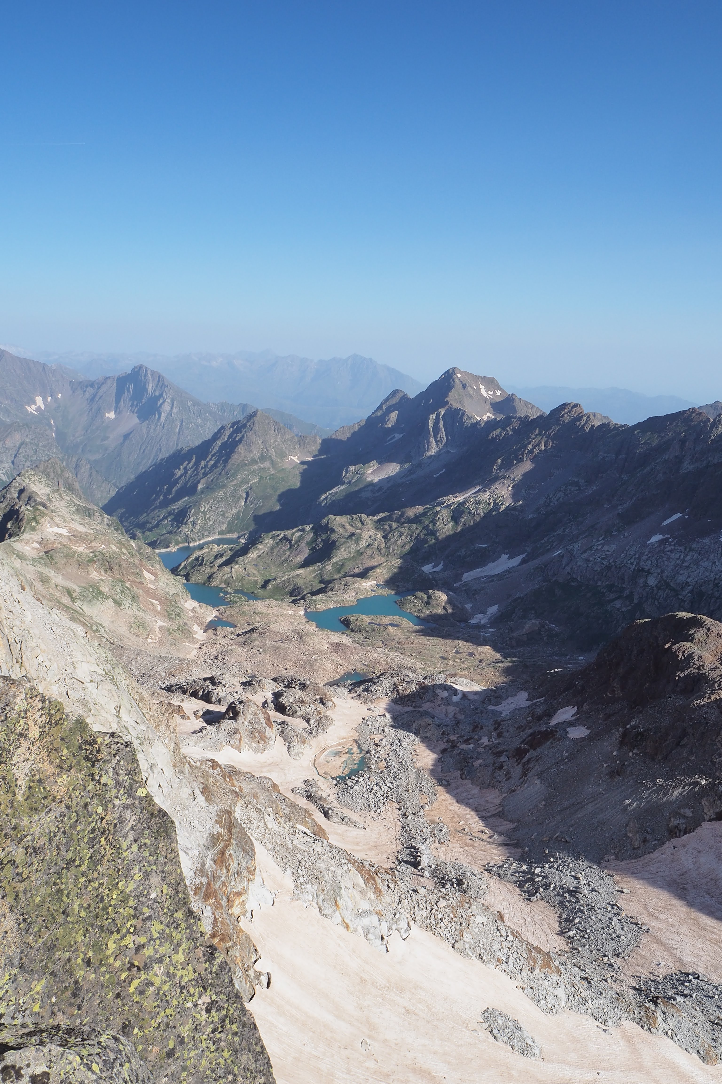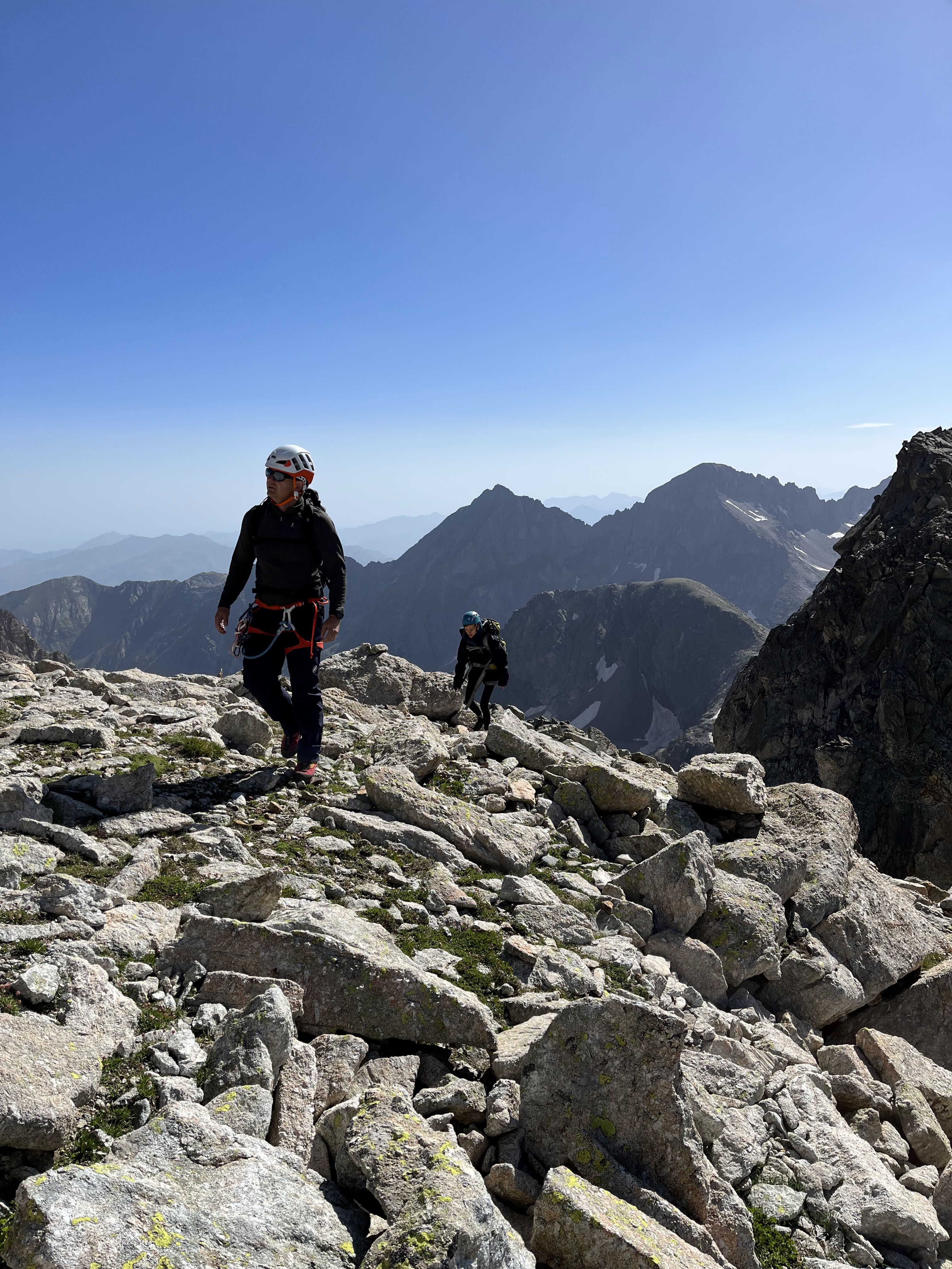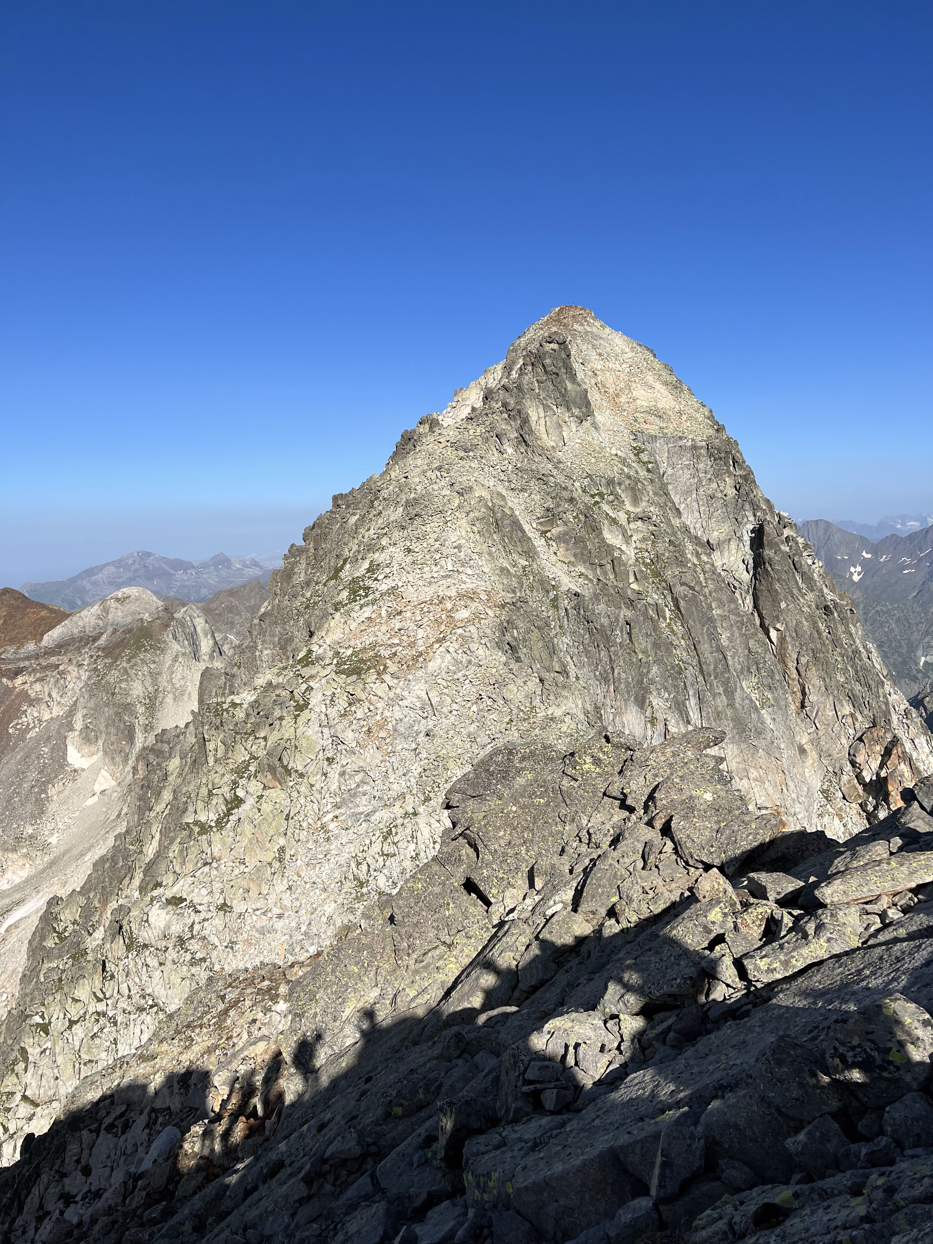 Ya pensando en cuándo volver para ajustar las cuentas pendientes, y de paso añadir Saint-Saud y Camboué a la caza de tresmiles, nos acomodamos en un rellano pocos metros por encima del puerto de Gías para quitarnos los arneses, comer algo y disfrutar de la sensación de que las dificultades ya han concluido y que hemos coronado dos picos de esos que te dejan contento. De esos a los que va poca gente, pese a superar los 3000 m y dar nombre a todo un macizo.