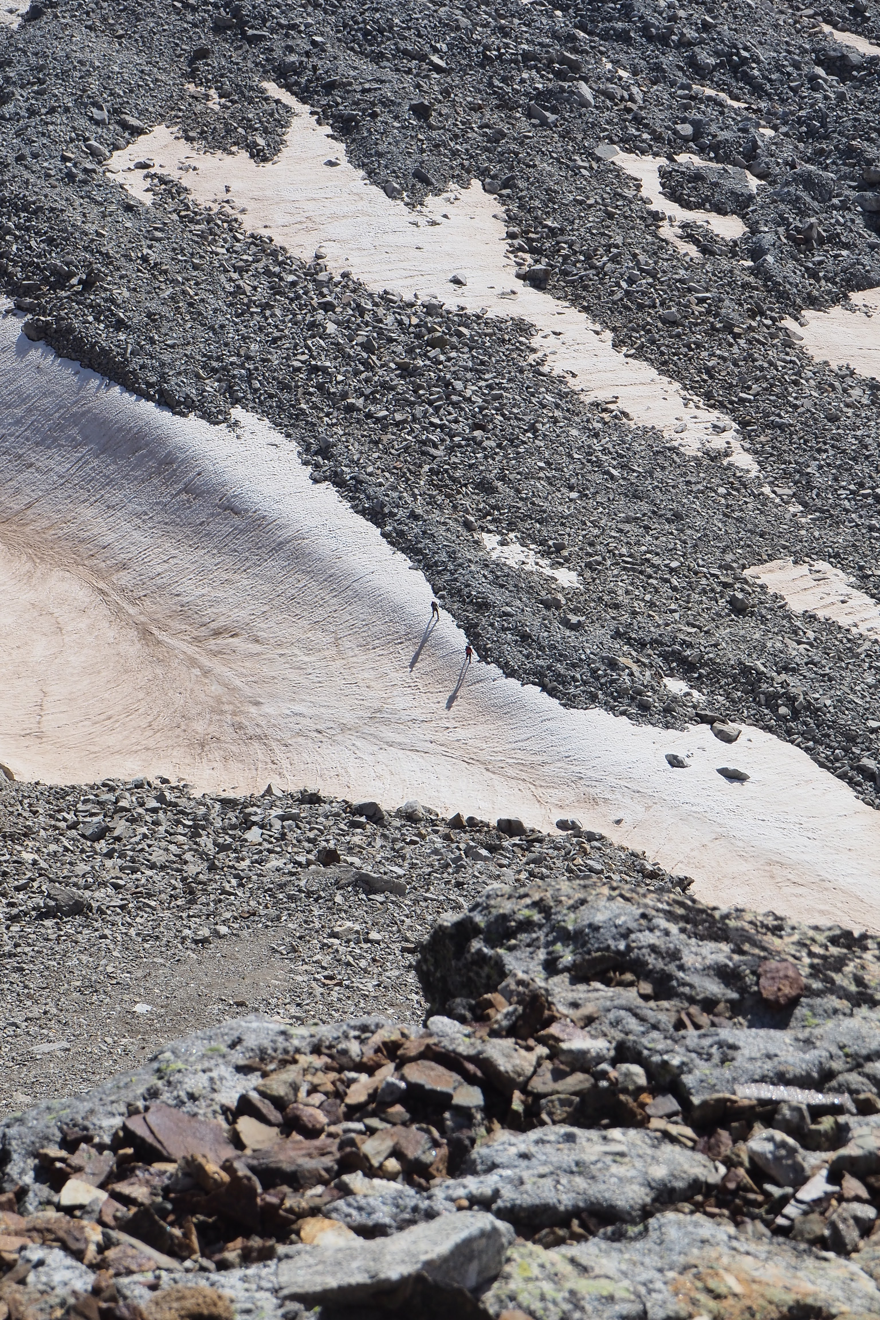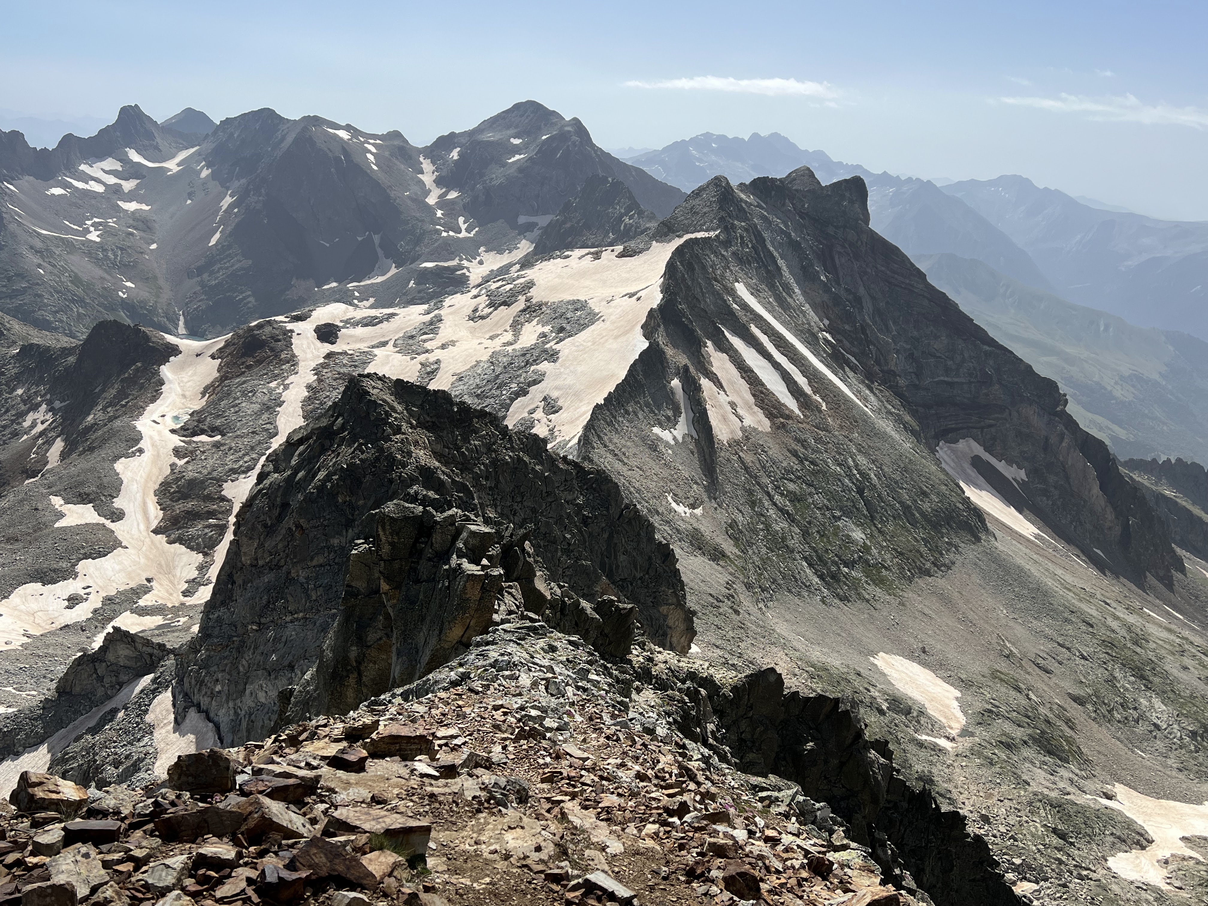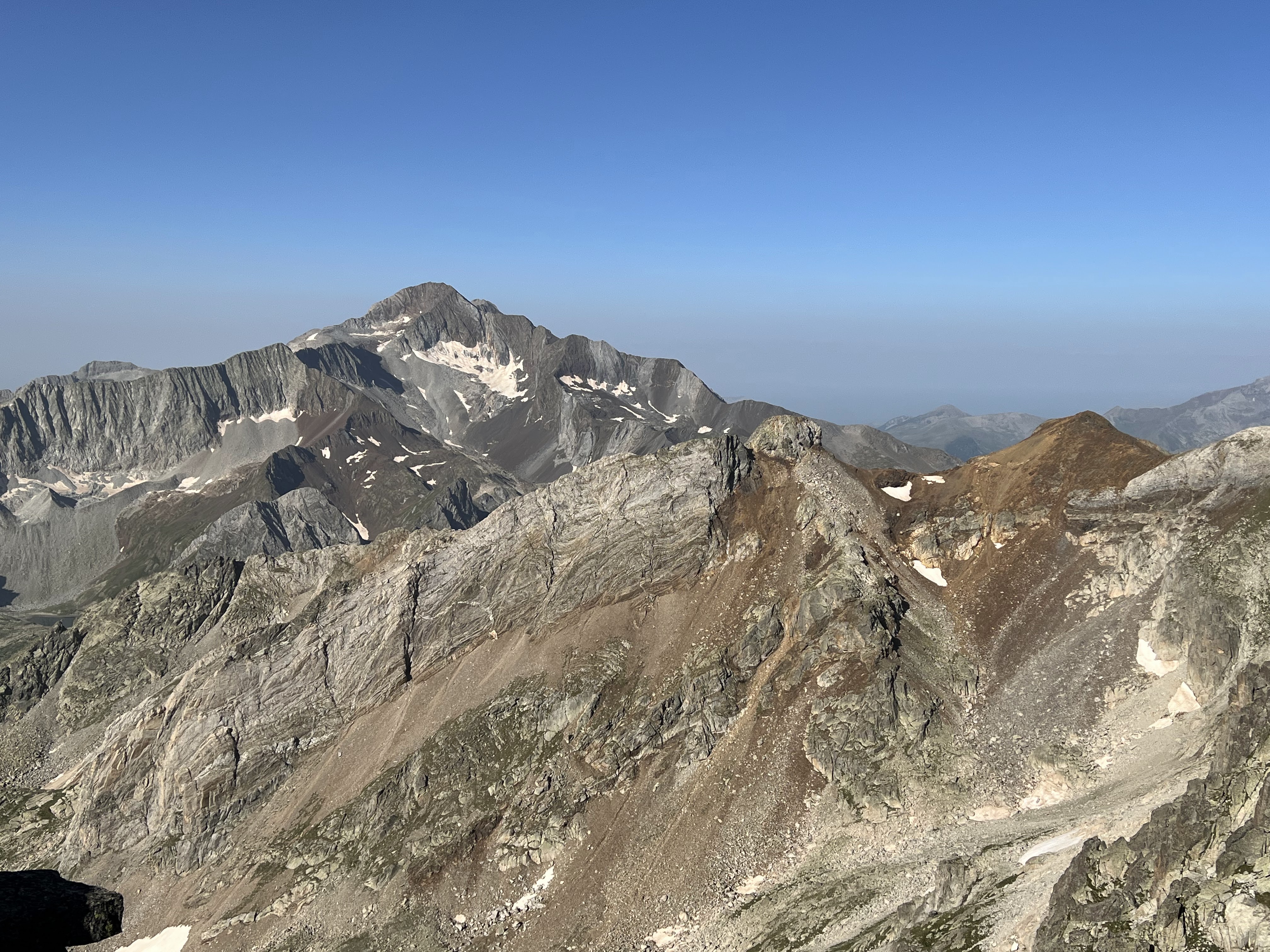 El día da gusto, sin apenas rastro de nubes, excelente visibilidad y temperaturas agradables. Aún divisamos abundantes neveros en este inicio de verano, aunque es inevitable pensar que a los pies de esta montaña, hasta hace bien poco, existían glaciares propiamente dichos, y cuya desaparición, aquí como en muchos otros lugares, afea las montañas y las hace más peligrosas.