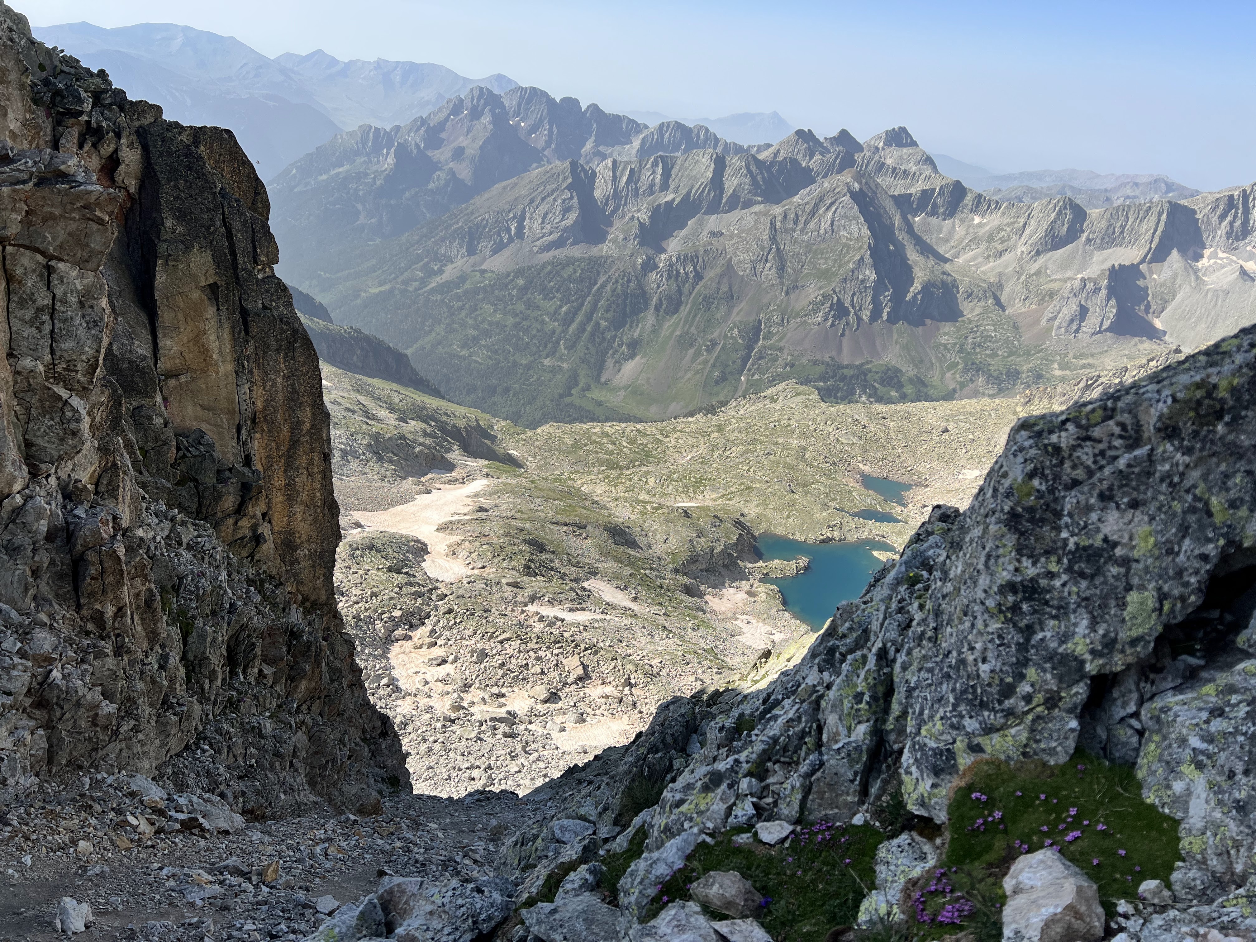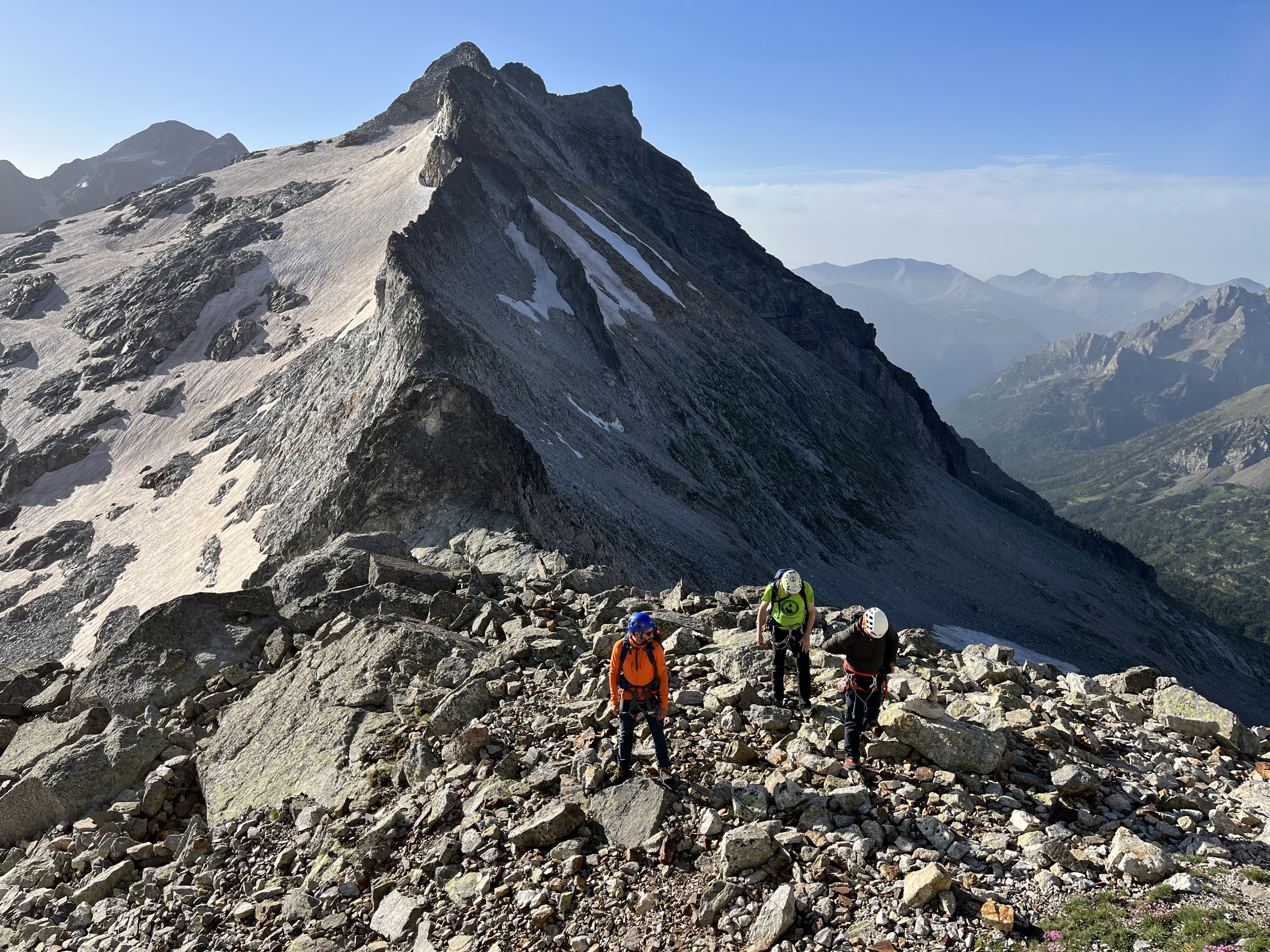 Desde el puerto de Oô la panorámica hacia el lado francés es magnífica. La cresta del Seil dela Baquo a nuestra derecha, y frente a nosotros la de Gourdon-Spijeoles, con el Lac Glacé a sus pies. Inevitable detenerse y sacar fotos, pero el Jean Arlaud nos llama. Nos preparamos, poniéndonos los arneses y los cascos. Subiremos sin encordar, aunque tendré a mano la cuerda de 30 m en caso de que alguien necesitara aseguramiento.
