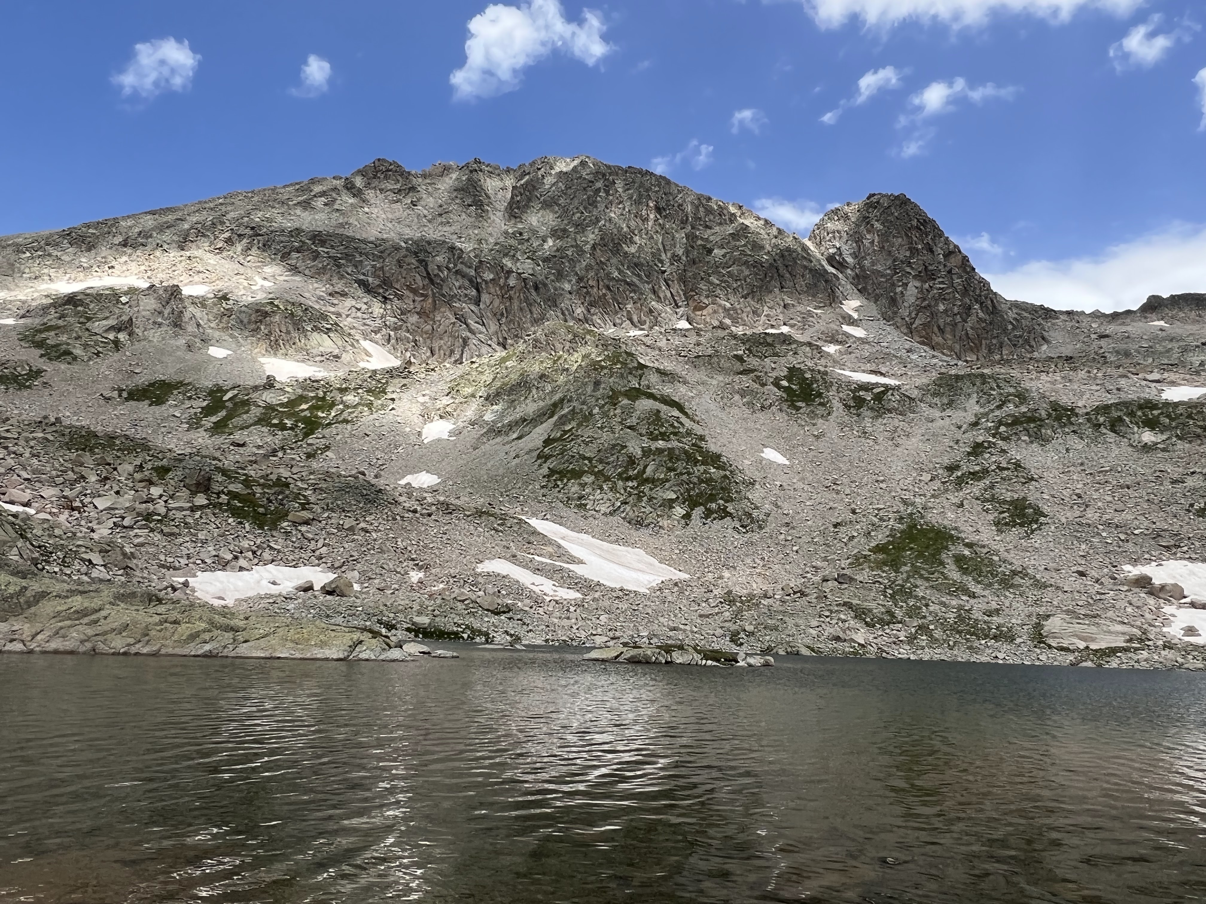 Después de haber pasado la noche sobre una laja de granito a escasos centímetros del agua toca levantarse, desayunar y salir a las 7.10 con las primeras luces. No veremos el sol hasta alcanzar el puerto de Oô, el amanecer astronómico ha tenido lugar antes de las seis y media, pero en esta cubeta glaciar las montañas de la divisoria nos cierran el horizonte noreste. En la vertiente francesa seguramente ya estarán disfrutando del calorcito. Partimos con las legañas puestas, ya nos iremos espabilando según nos acerquemos al primer punto clave de la jornada. Ahora de lo que se trata es de no perder los escasos hitos y no salirse de la traza. Se rodea el lago por el lado sur y terreno mayormente herboso para luego girar al norte y enfilar hacia el poco marcado puerto de Oô a través de bloques, lajas y gravas.