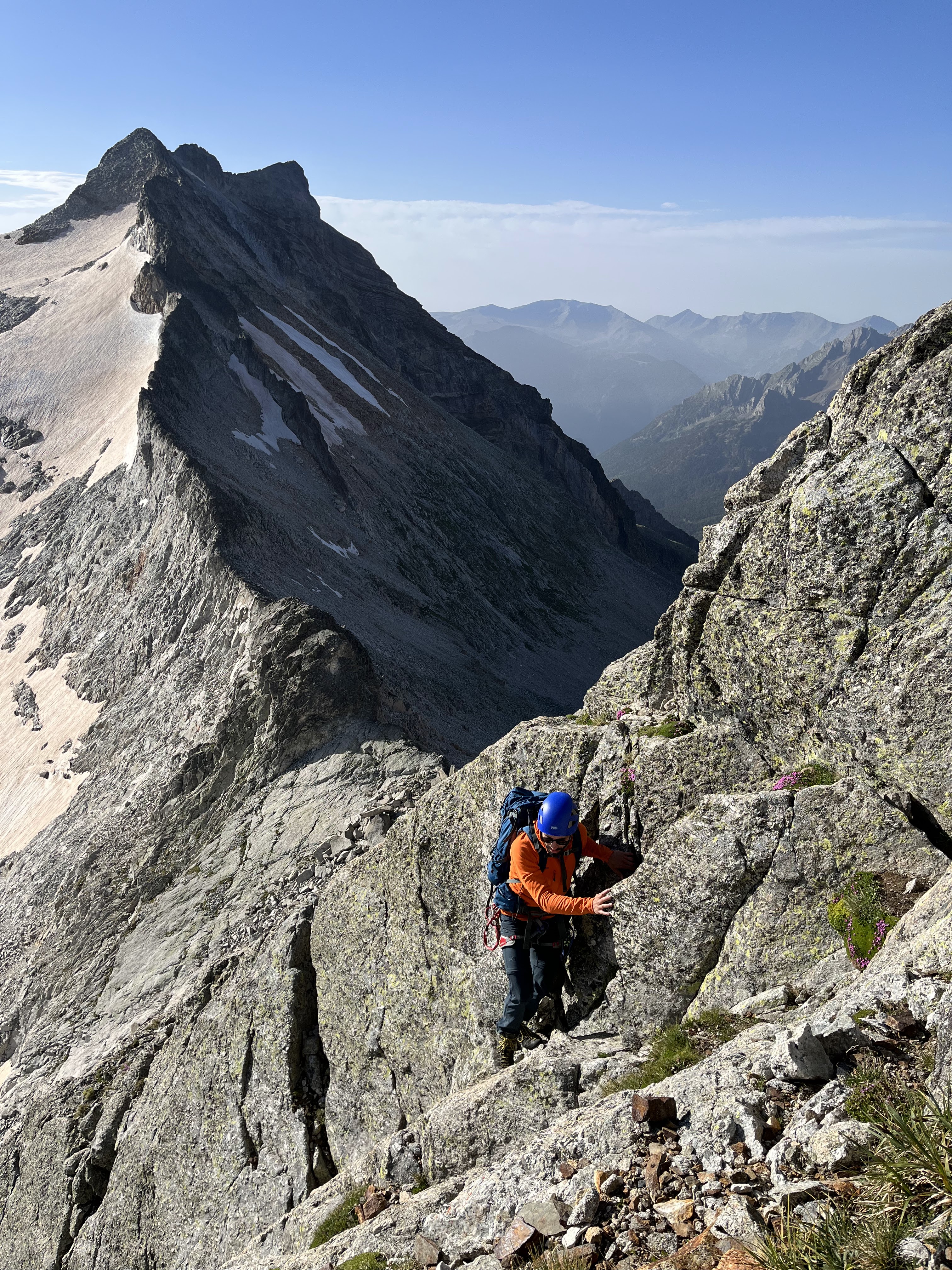 La roca sigue agarrando perfectamente, la exposición impone respeto y una vez en la cresta hay que hacer alguna fácil acrobacia, pero no pasa nada, ya estamos casi en la estrecha y escénica cumbre del Jean Arlaud.