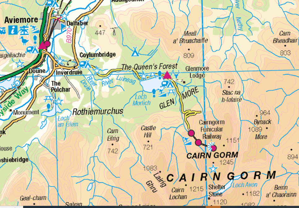 Aviemore es el «Chamonix británico», con una buena oferta hotelera, tiendas de deportes y agencias de nieve y montaña. Con sus poco más de 3000 habitantes se ubica al pie de la cara norte del macizo de Cairtngorms. La A9, importante arteria de comunicación y la línea ferroviaria Glasgow-Inverness pasan por esta localidad. Existe una pequeña estación de esquí en las suaves laderas del pico Cairn Gorm, a cuya cima llega un curioso funicular. La carretera de la estación invernal pasa junto a las orillas del Loch Morlich, rodeado por los bosque de pino caledonio del Glen More.