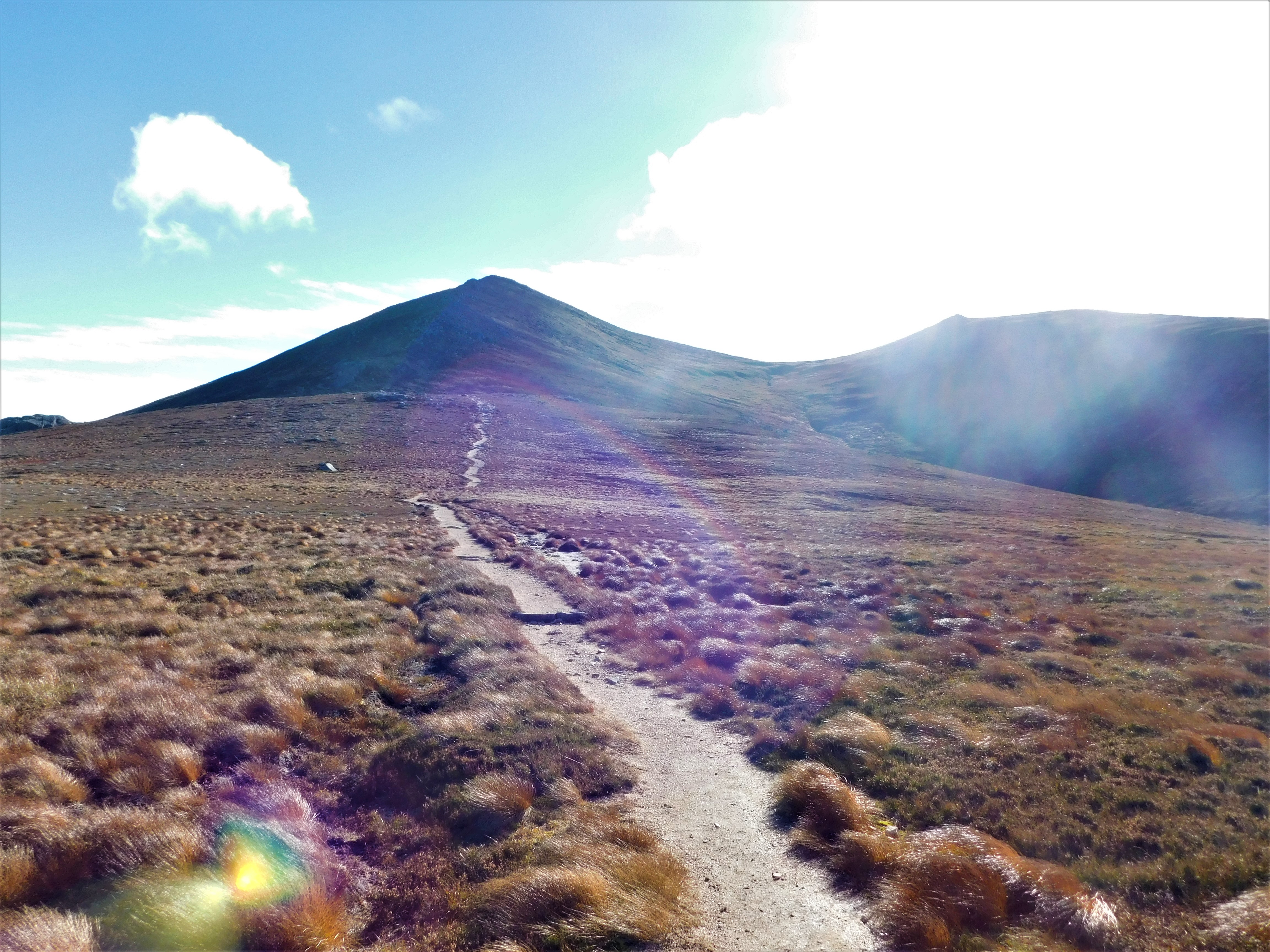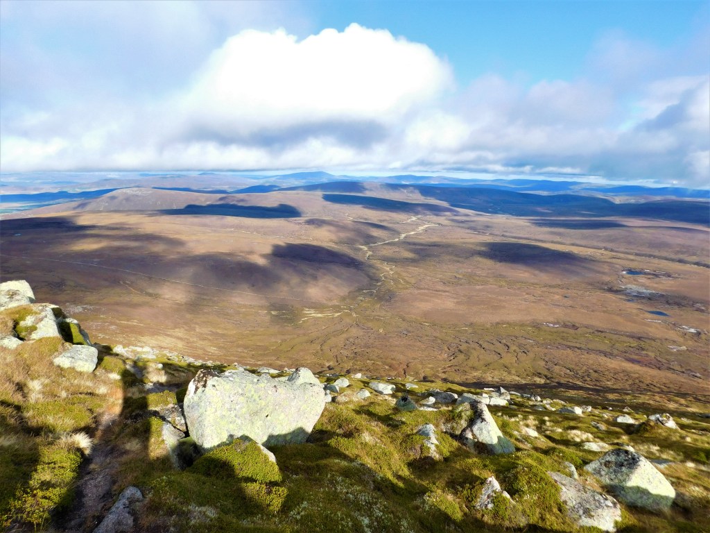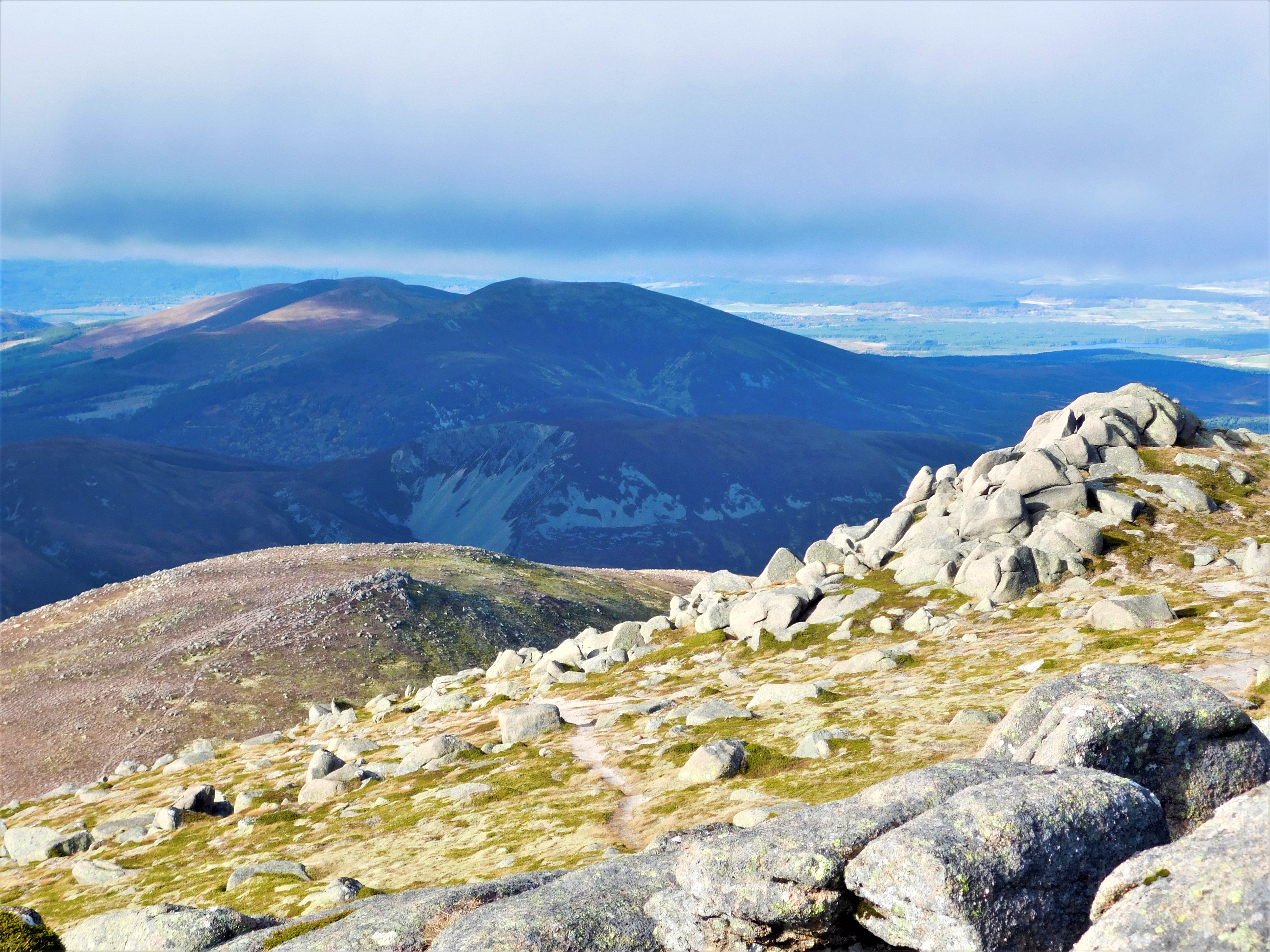 El último tramo es el más empinado. Son 200 m muy duros, pero con muy buena traza. Alcanzando la cresta cimera, el sendero se estrecha y requiere un poco de atención según serpentea por entre los grandes bloques de granito, típicos de los Cairngorms, y muy abundantes aquí. Finalmente alcanzo el gran cairn de la cumbre a la una y media. He subido rápido y ahora es hora de gozar del amplísimo panorama, endulzado por la cálida luz otoñal de estas latitudes. Además de los «colosos» dominando hacia el Oeste y Suroeste, hacia el norte y el este se abren los paisajes pelados por el frío del Moray y el Aberdeenshire.