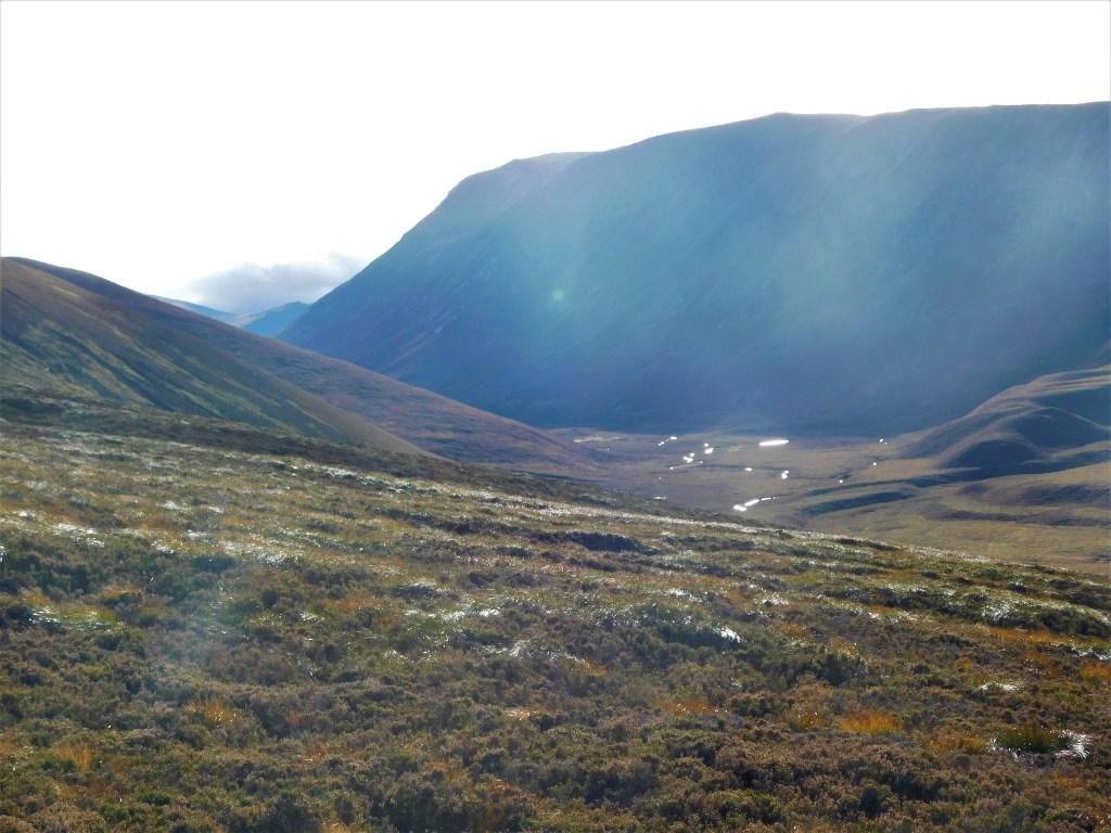 Durante cinco años había recorrido exhaustivamente el macizo de los Cairngorms, sobre todo, y por motivos de cercanía a mi domicilio, desde su vertiente meridional. Esas interminables caminatas por el fondo de los glens hasta alcanzar la base de estos picos, de altitud modesta, pero soberbios en su aislamiento, y que al recorrerlos nevados durante el invierno producen la ilusión de encontrarse en medio de un verdadero desierto ártico…En Octubre de 2018 ya intuía que mi etapa en Escocia iba tocando a su fin, así que en parte por el deseo de conocer lugares nuevos, y en parte por satisfacer la pulsión coleccionista que me había llevado a coronar todos y cada uno de los Munros (en Escocia, cimas por encima de los 3000 pies, o 915 m de altitud) de los Cairngorms, excepto tres, apunté como objetivo al Bynack More, el Munro más septentrional del macizo. Dicen que contemplado desde las suaves colinas de Moray, al norte, y gracias a su posición adelantada, este bonito pico aparece como el más elevado de la cadena, pese a que sólo alcanza los 1089 m de altura, lejos de los 1310 del Ben McDui o los 1245 del Cairn Gorm.