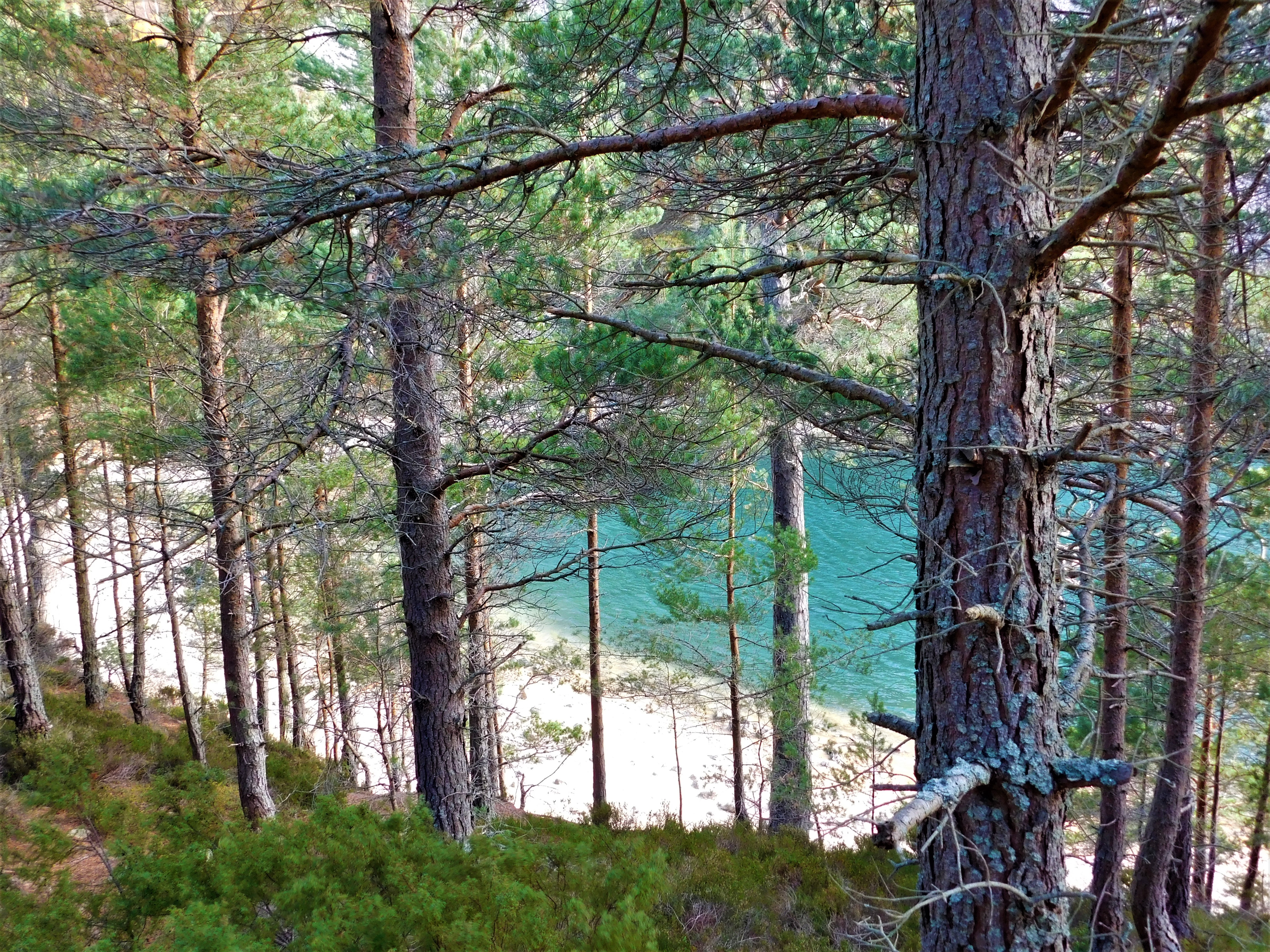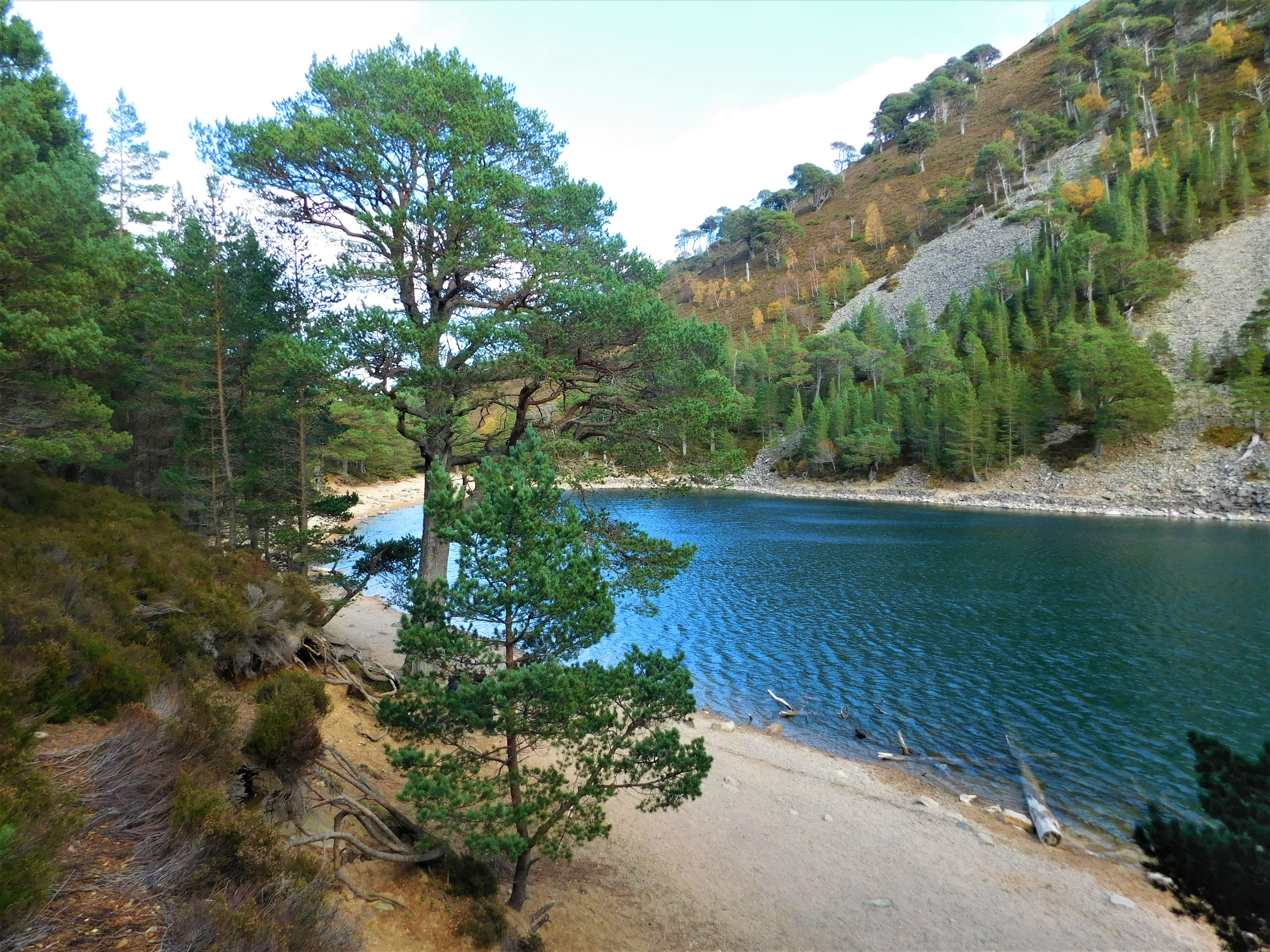 Así que salgo a paso ligero por la bien marcada pista que en pocos minutos me hace pasar junto al Glenmore Lodge (aquí es donde mi Garmin comienza a grabar la ruta), dentro del magnífico bosque de pinos, recibiendo poco después por mi derecha la pista procedente del Allt Mòr car park. El ancho sendero entra en el fondo del glen, en terreno más abierto y casi llano, alcanzando al cabo de unos 3 km el pequeño lago An Lochan Uaine, a mi derecha. Sus aguas de un sorprrendente color turquesa contrastan con el verde de los pinos. Hay hasta una playa allá abajo.