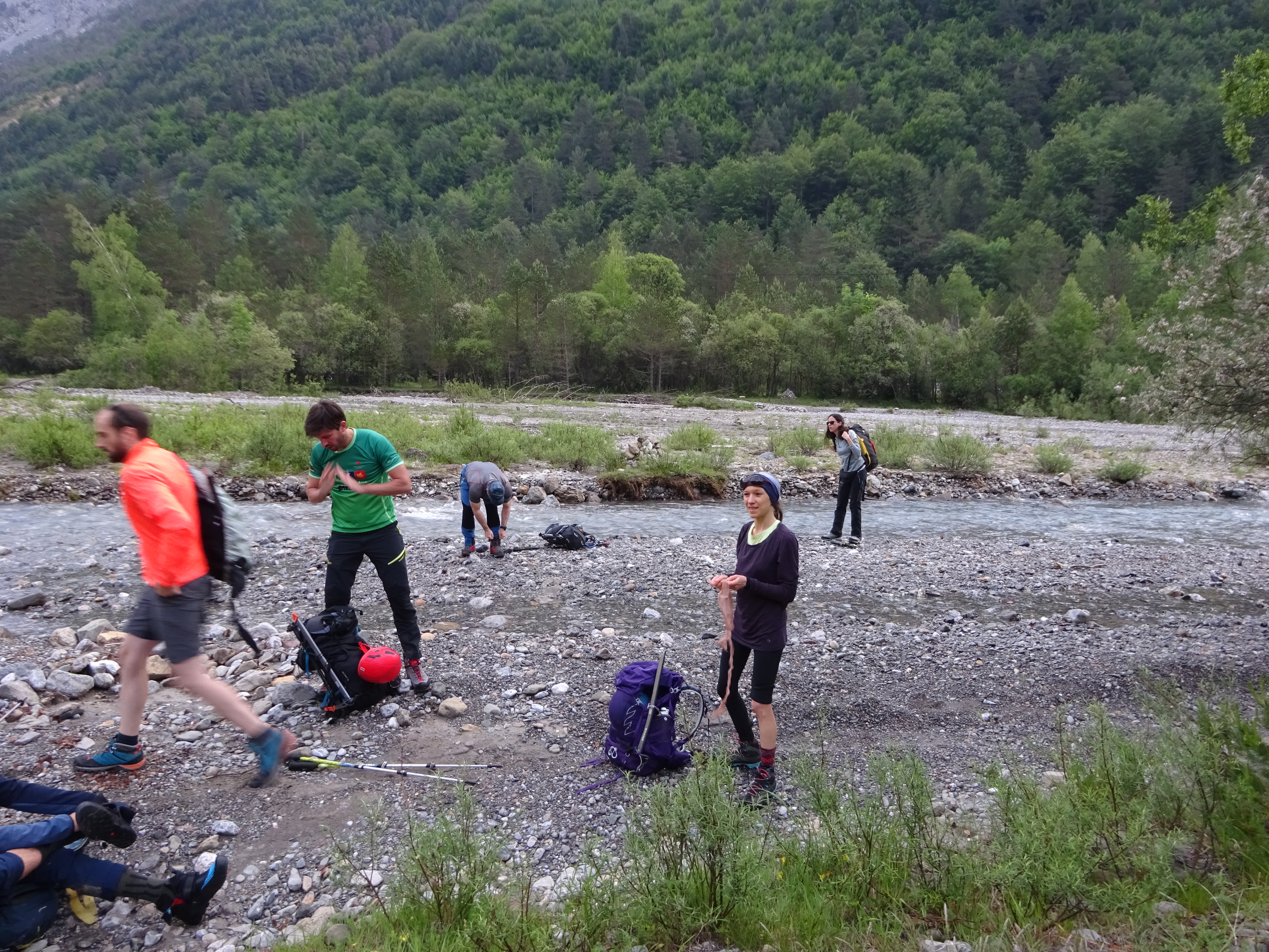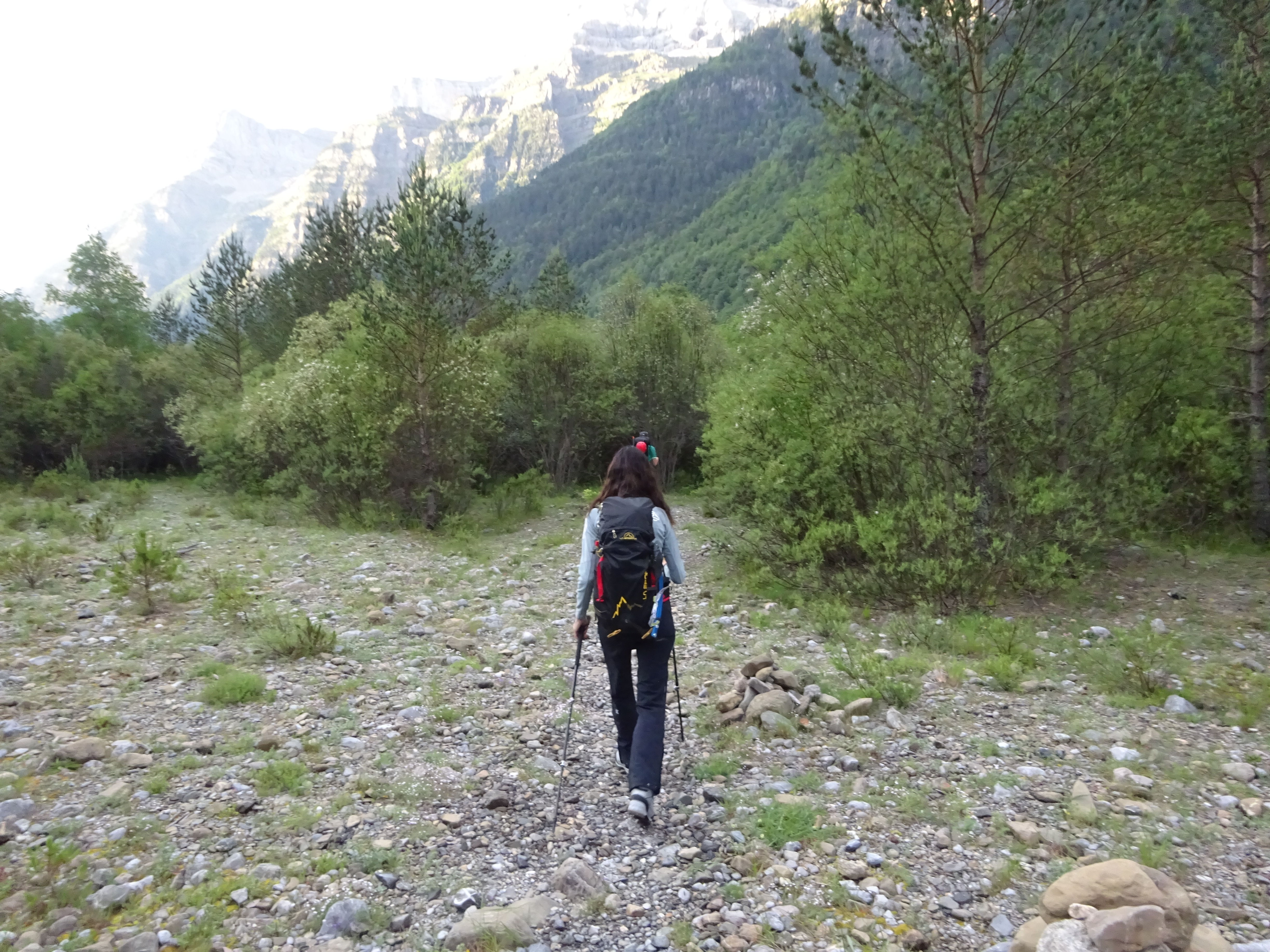 Tras una noche mas o menos tranquila nos levantamos para tomar el desayuno a las seis menos cuarto, un poco tarde considerando la prevision de tormentas vespertinas que reducía el margen de tiempo disponible para la excursión. Nos ponemos en marcha hacia las seis y media, dejando a la derecha la traza del GR11 que da un rodeo subiendo hasta el puente de Pineta para regresar por la orilla derecha del Cinca, y siguiendo rectos a buscar el cauce del río, que hay que vadear dado que (ya) no hay puente. Baja impetuoso, hay que descalzarse y arremangarse o quitarse los pantalones largos; los bastones son aquí de gran ayuda para no perder el equilibrio. Me acuerdo de mis experiencias por los Highlands escoceses, donde estos vadeos eran de lo mas común; las he pasado mas feas…