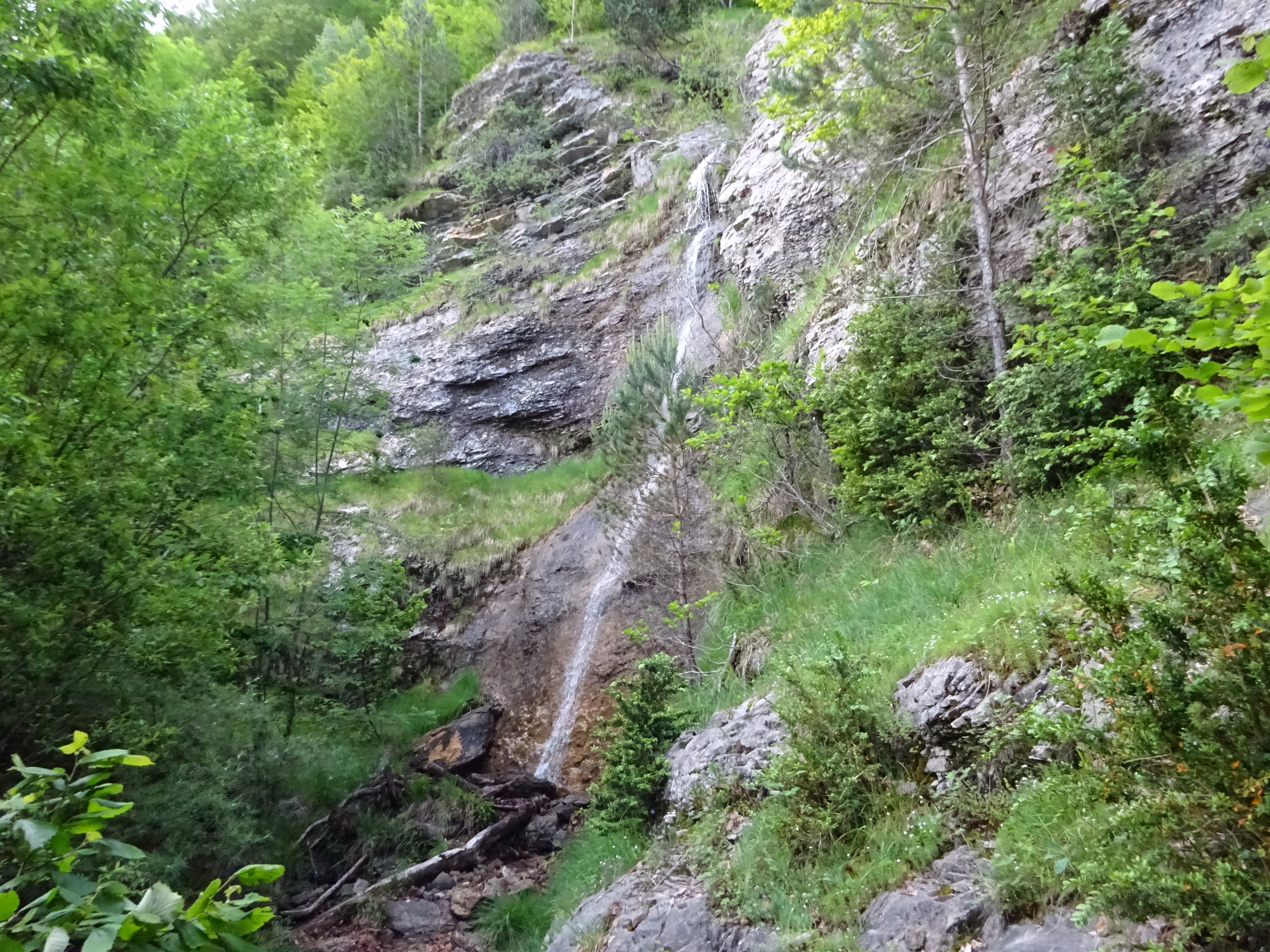 Y aquí es donde nos deberíamos haber desviado por la «faja natural», en vez de descender siguiendo las marcas del GR-11. Pero es que por más que miramos no fuimos capaces de identificar el paso que permitía seguir rectos, evitando las cadenas. El pragmatismo se impuso, daríamos un rodeo pero manteniéndonos en un sendero seguro. Pocos metros después de la salida del corredor pasamos bajo la surgencia que constituye el segundo punto de agua «seguro» de nustro recorrido.