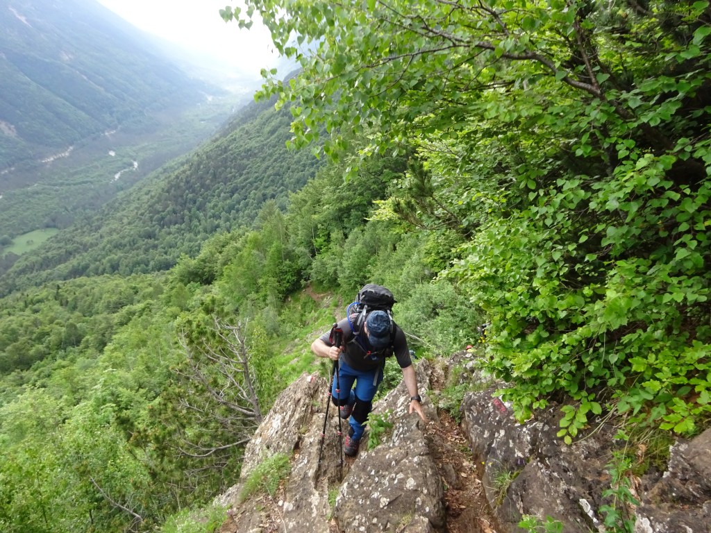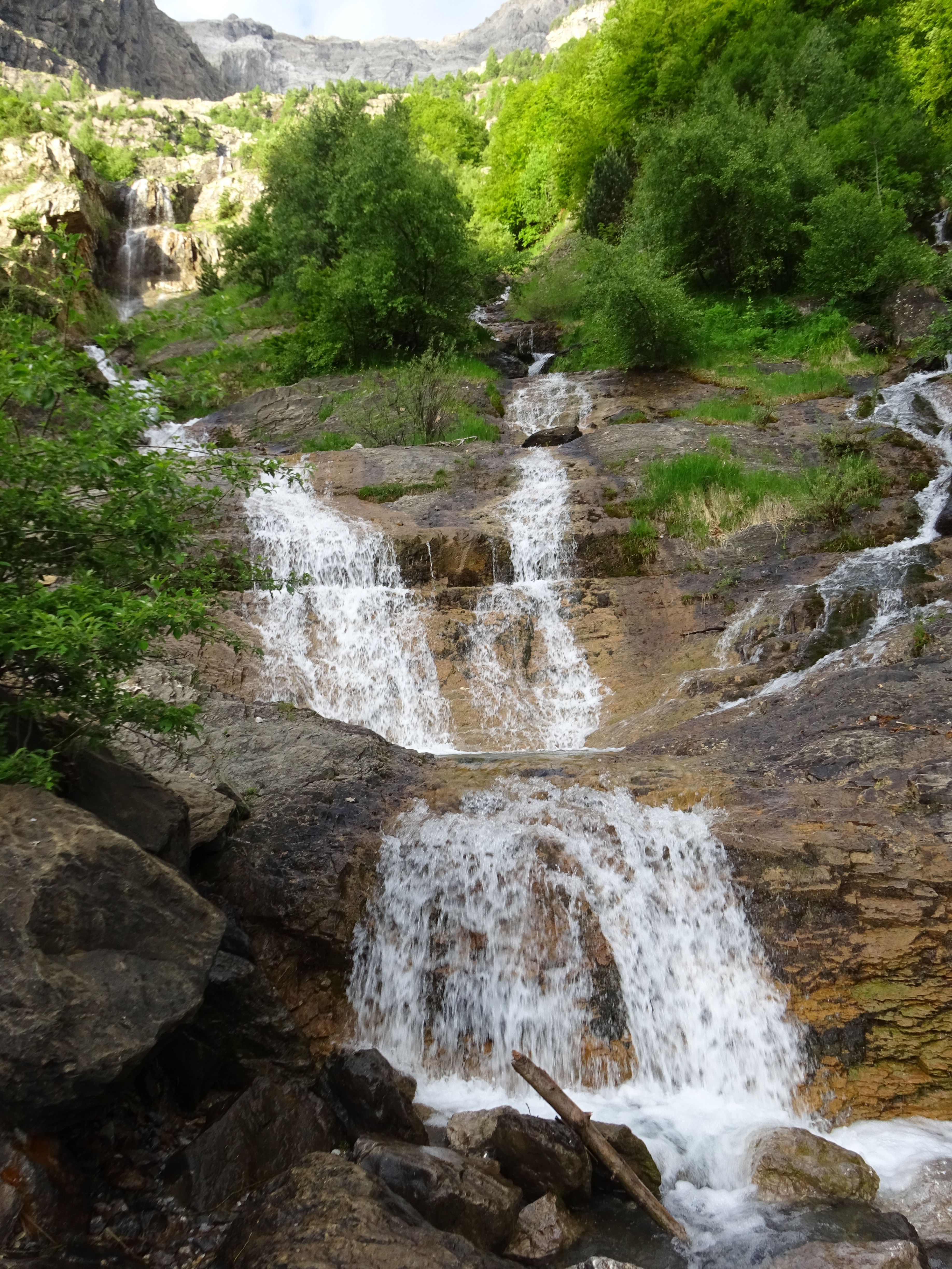 Proseguimos por un camino que se va volviendo más incómodo, con numerosos afloramientos rocosos que imponen fáciles trepadas. No faltan pequeñas cascadas desplomándose desde las alturas. Entiendo que este sea el tramo más temido por los excursionistas que recorren el GR11, la vía transpirenaica española. En condiciones de humedad, y cargando una mochila pesada, descender por aquí requiere especial precaución.
